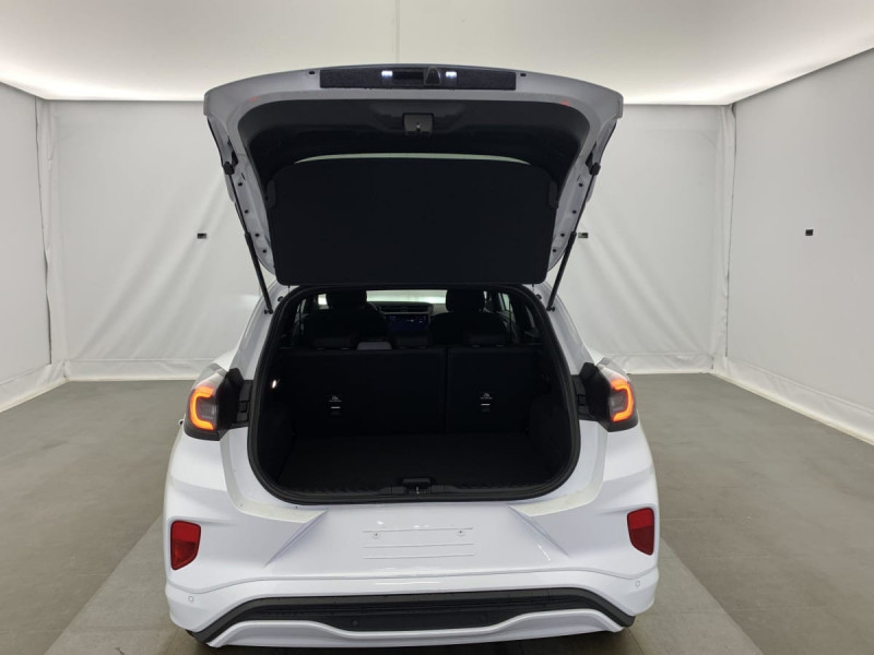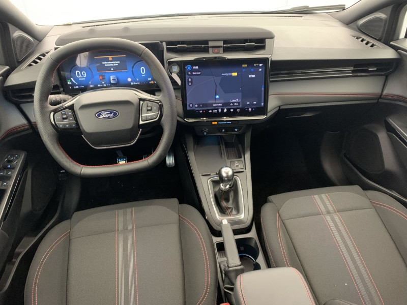 Console centrale avec accoudoir coulissant / Grille de calandre Active / Suspension Sport / Rétroviseur intérieur électrochrome / Badge ST-Line / Pommeau de levier de vitesse gainé cuir avec surpiqures rouges / Alerte de véhicule en approche / Pédalier Aluminium / Rétroviseurs extérieurs électriques, chauffants avec répétiteur de clignotant et coque couleur carrosserie / Projecteurs LED avec feux de jour et commutateur de feux de route automatique / Freins à disques AV / Planche de bord en vinyle Premium / Ciel de toit avec pare-soleil éclairés / Megabox (compartiment de rangement sous le plancher du coffre) / Assistant de pré collision avec freinage post collision / Système d'infodivertissement SYNC4 avec écran tactile 12" et commandes vocales, 2 ports USB, navigation, Apple CarPlay et Android auto, 6 HP / Combiné d'instrumentalisation numérique 12.8" / Avertisseur de conduite à contre-sens / Assistance à la conduite économique / Système de contrôle de la trajectoire et de la stabilité avec assistant au freinage d'urgence et aide au démarrage en côte / Pneus eco 215/55 R17 94H / Kit carrosserie ST-Line (bouclier AV sport et diffuseur AR) / Arches de roue couleur carrosserie / Pommeau de levier de vitesse en aluminium teinté noir / Plaques de seuil de portes en aluminium avec logo / Sièges AV en tissu avec surpiqûres rouges / Frein à tambour AR / Volant en cuir Sensico perforé / Rétroviseurs extérieurs couleur carrosserie / Boîte manuelle 6 vitesses / Contrôle de la traction (TCS) / Siège conducteur à réglage manuel 4 positions / Siège conducteur à réglage manuel 2 positions / Jupes latérales couleur carrosserie /