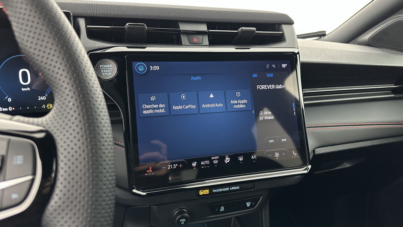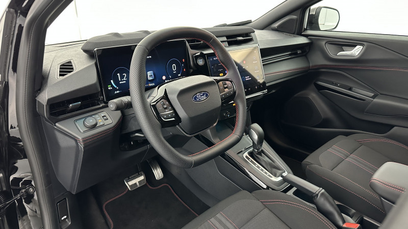 Kit carrosserie ST-Line (bouclier avant Sport et diffuseur arrière) / Arches de roue couleur carrosserie / Jupes latérales couleur carrosserie / Pédalier aluminium / Sièges avant en tissu avec surpiqûres rouge / Plaques de seuil de porte aluminium avec logo / Projecteurs LED avec feux de jour et commutateur de feux de route automatique / MegaBox® (compartiment de rangement sous le plancher du coffre) / Rétroviseur intérieur électrochrome / Système d'infodivertissement SYNC 4 avec écran tactile 12" avec Navigation (et Apple CarPlay - Android Auto) / Combiné d'instrumentation numérique 12,8" / Caméra de recul et capteurs de stationnement arrière / Alerte de véhicule en approche / Suspension Sport / Kit de réparation des pneumatiques /