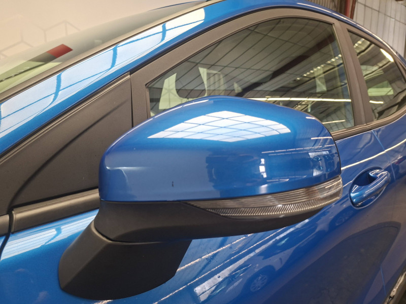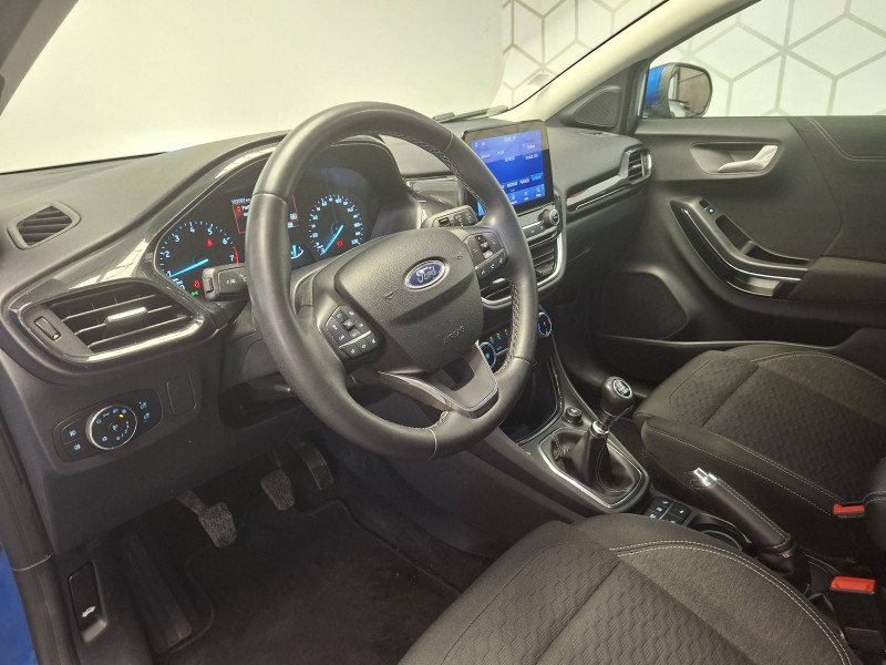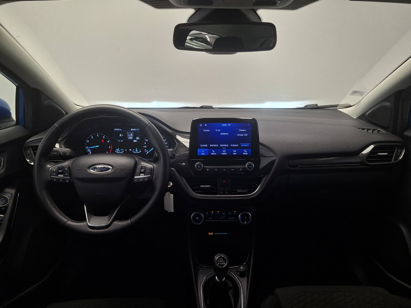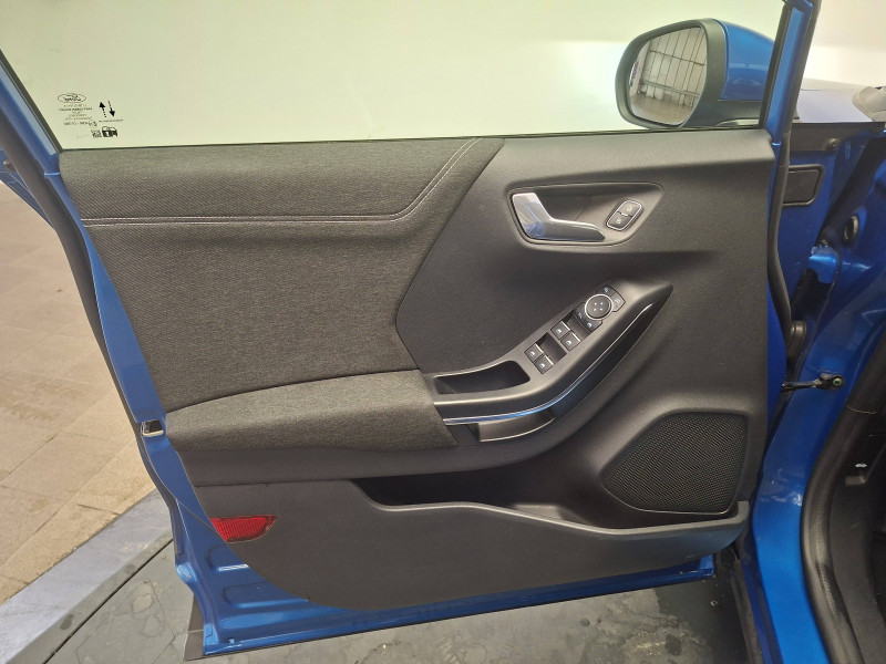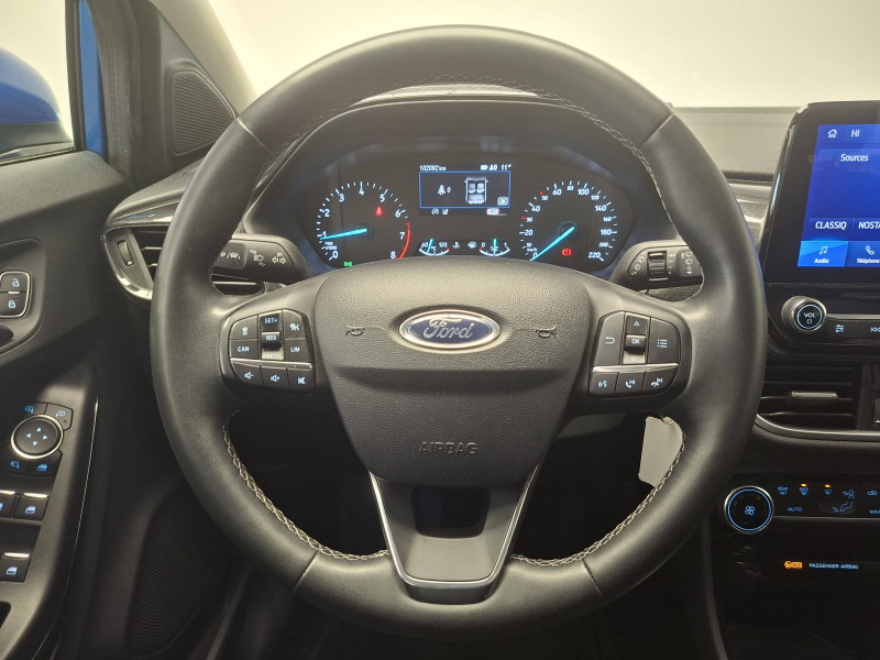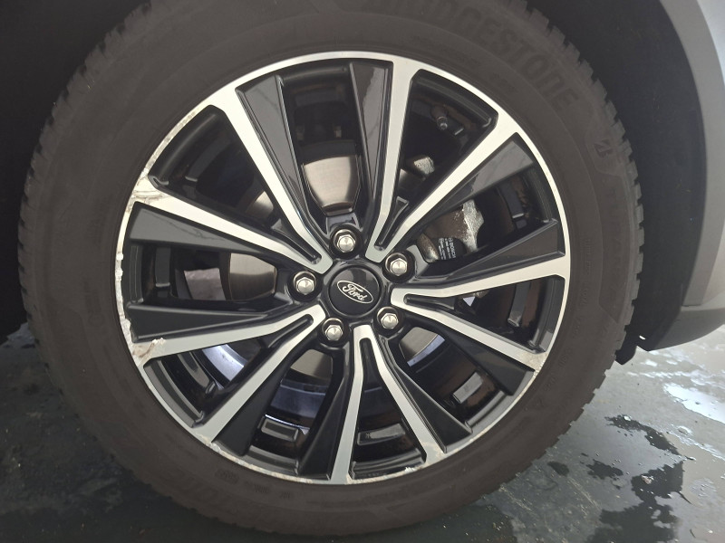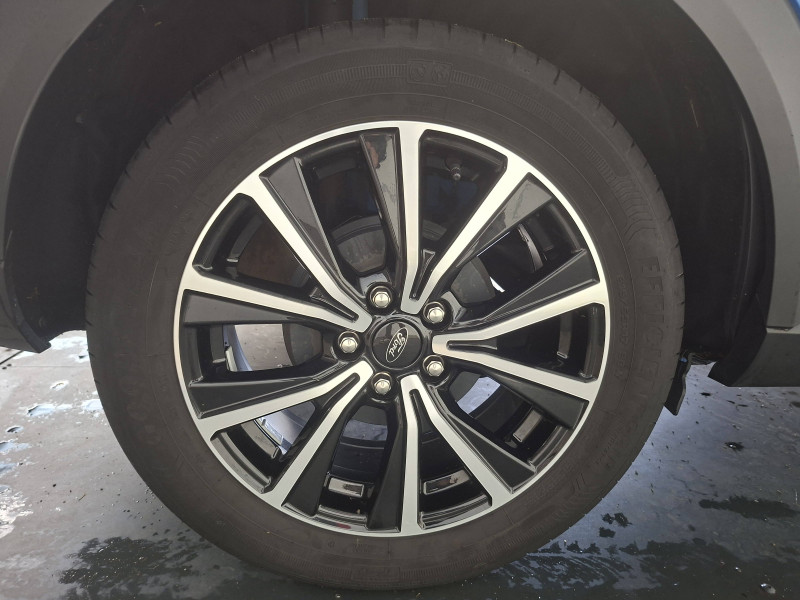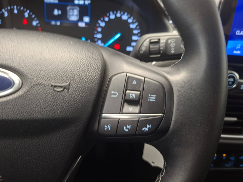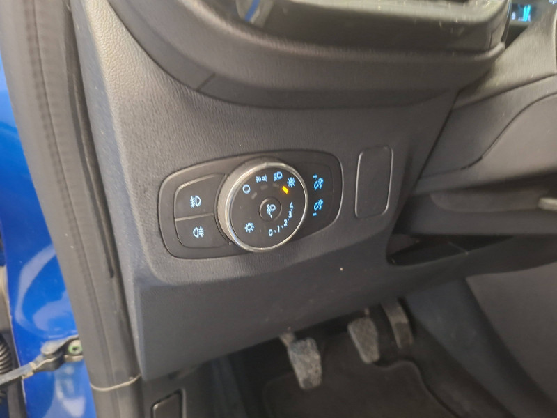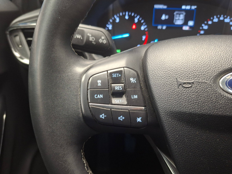 3ème appui-tête AR / 5 Modes de conduite sélectionnables (normal, eco, sport, faible adhérence, trail) / Aide au maintien dans la voie avec détection des bas-côtés / Badges extérieurs ST-Line / Becquet couleur carrosserie / Bouton de démarrage "Ford Power" / Console centrale avec accoudoir et rangements / Désactivation de l'airbag passager / Disques de frein AV / Eclairage d'ambiance intérieur / Environnement noir / Feux de route intelligents - Commutation automatique des feux de route aux feux de croisement / FordPass Connect avec modem embarqué et fonction E-Call / Grille de calandre ST-Line / Jantes alliage 17" 5x2 branches finition Black Machined (pour pneus toutes saisons 215/55 R17) / Kit de carrosserie ST-Line / Kit de réparation pneumatique / Levier de frein à main Sensico / Levier de vitesses Sensico avec insert aluminium / Limiteur de vitesse intelligent (affichage instantané des limitations de vitesse sur le tableau de bord) / Pédalier Aluminium / Phares antibrouillard AV avec fonction éclairage des angles / Rétroviseurs extérieurs couleur carrosserie électriques, dégivrants et rabattables électriquement avec éclairage d'approche / Sellerie tissu noir Court avec surpiqûres rouges / Siège conducteur a réglage manuelle en hauteur avec soutien lombaire / Sortie d'echappement chromée / Suspension Sport / Système audio Ford SYNC3 avec écran tactile 8", commandes vocales, 2 ports USB, alerte contresens, compatible AppLink, Apple CarPlay et Android auto, 7 hauts-parleurs / Système de navigation Europe et points d'intérêts Michelin / Système de prévention de collision avec freinage post-collision et détection piétons / Système MyKey (seconde clé programmable) / Tapis de sol AV avec surpiqûres / Trappe Easy Fuel / Volant à méplat 3 branches ST-Line avec surpiqûres rouges
