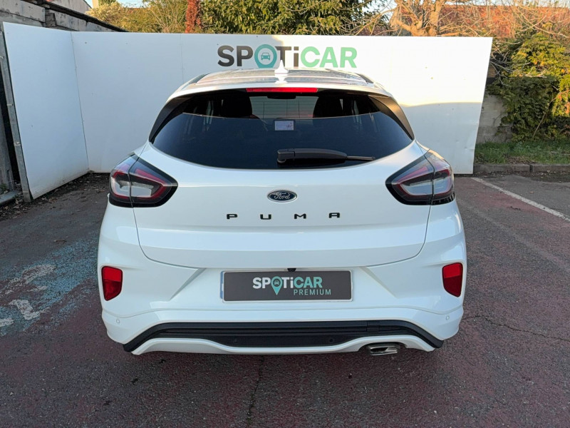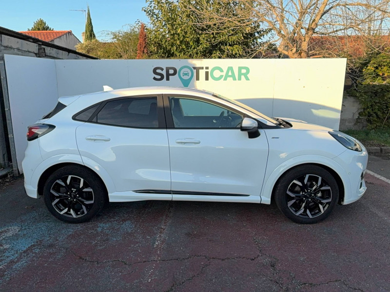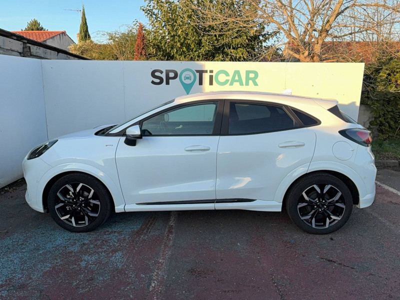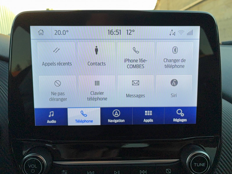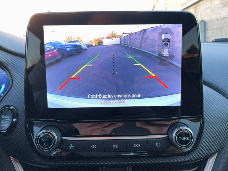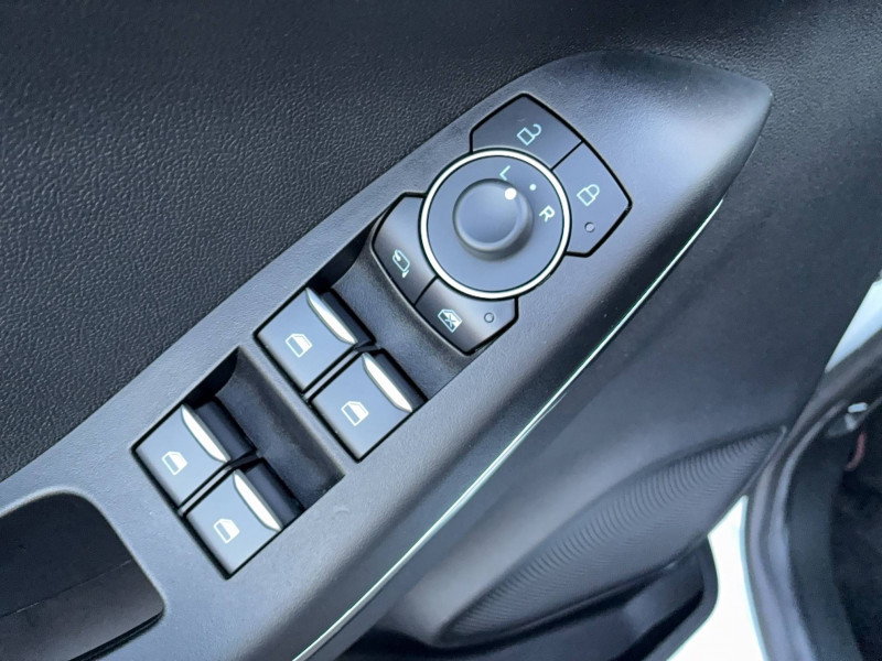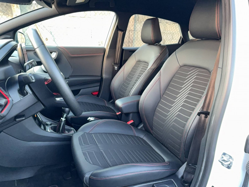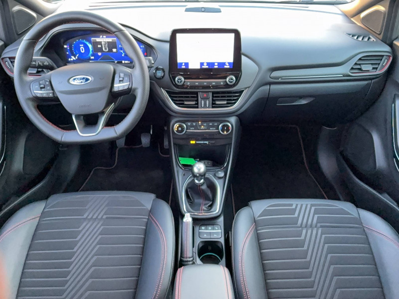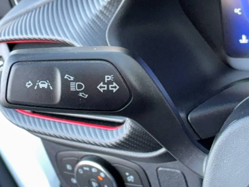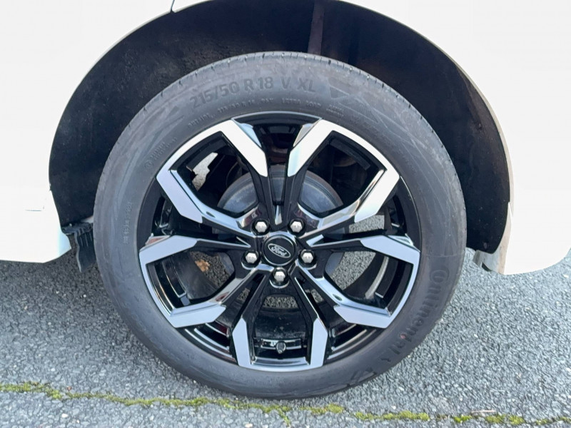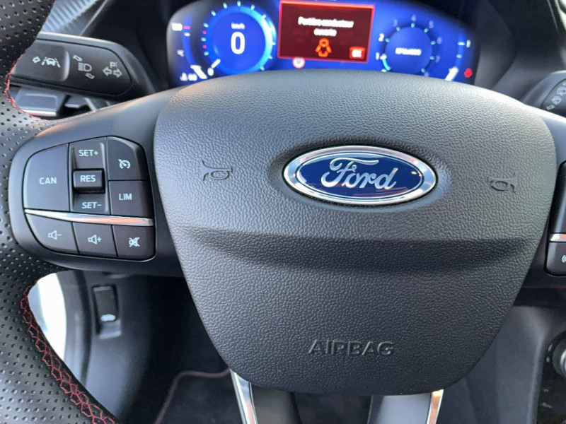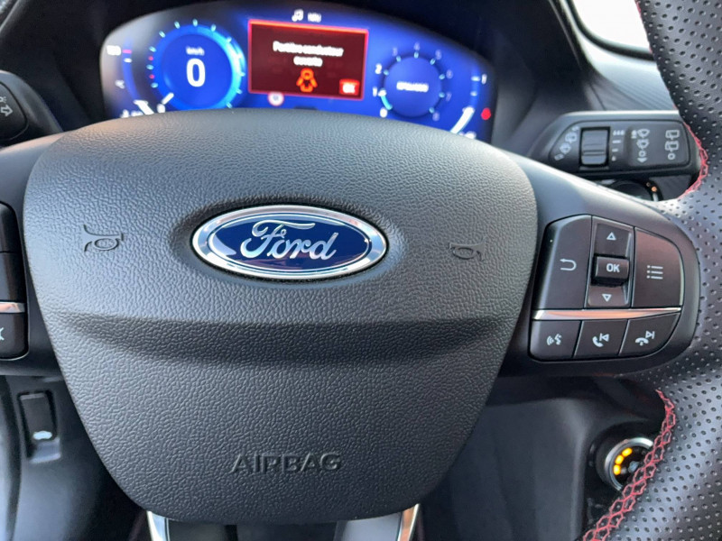 3ème appui-tête AR / 5 Modes de conduite sélectionnables (normal, eco, sport, faible adhérence, trail) / Aide au maintien dans la voie avec détection des bas-côtés / Badges extérieurs ST-Line / Becquet AR couleur carrosserie / Bouton de démarrage "Ford Power" / Combiné d'instrumentation numérique 12.3" avec Ecomode / Console centrale avec accoudoir et rangements / Désactivation de l'airbag passager / Disques de frein AV / Eclairage d'ambiance intérieur / Environnement noir / Feux antibrouillard AV avec fonction éclairage d'angle / Feux de route intelligents - Commutation automatique des feux de route aux feux de croisement / FordPass Connect avec modem embarqué et fonction E-Call / Grille de calandre Active / Grille de calandre ST-Line / Jantes alliage 18" 5x2 branches finition Absolute Black (pour pneus 215/50 R18 92H) / Kit de carrosserie ST-Line / Kit de réparation pneumatique / Levier de frein à main Sensico / Levier de vitesse Sensico / Limiteur de vitesse intelligent (affichage instantané des limitations de vitesse sur le tableau de bord) / Rétroviseurs extérieurs couleur carrosserie électriques, dégivrants et rabattables électriquement avec éclairage d'approche / Sellerie Mixte tissu noir Eton noir avec renforts latéraux en Sensico Salerno et surpiqures rouges / Siège passager réglable en hauteur avec soutien lombaire / Sortie d'echappement chromée / Suspension Sport / Système audio B&O avec SYNC3 avec écran tactile 8", commandes vocales, 2 ports USB, compatible AppLink, Apple CarPlay et Android auto, 10 hauts-parleurs / Système de navigation Europe et points d'intérêts Michelin / Système de prévention de collision avec freinage post-collision et détection piétons / Système MyKey (seconde clé programmable) / Tapis de sol AV/AR avec surpiqûres / Trappe Easy Fuel / Volant à méplat 3 branches ST-Line avec surpiqûres