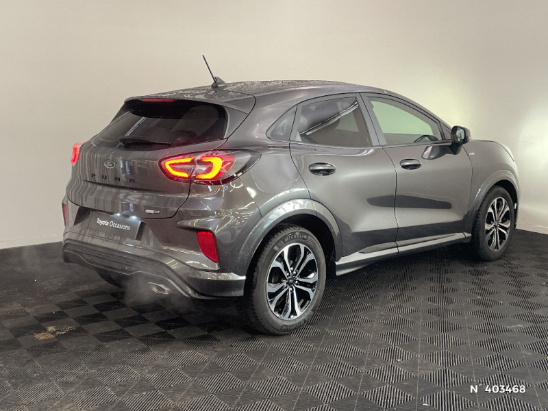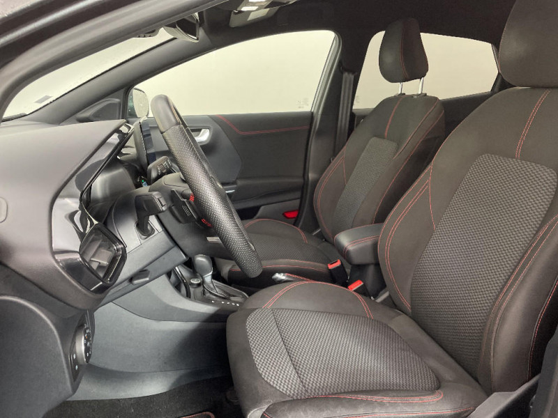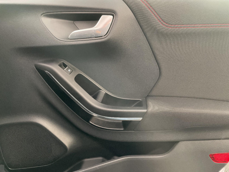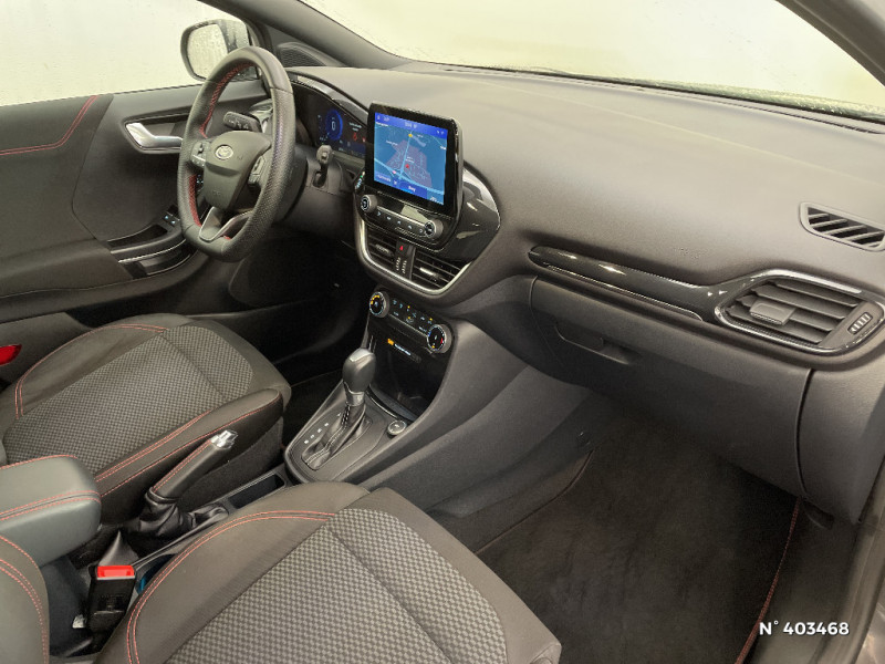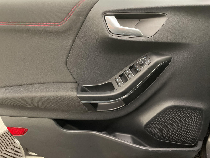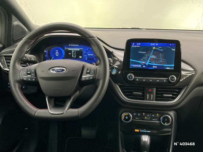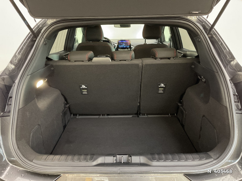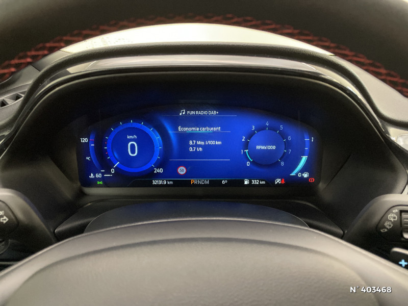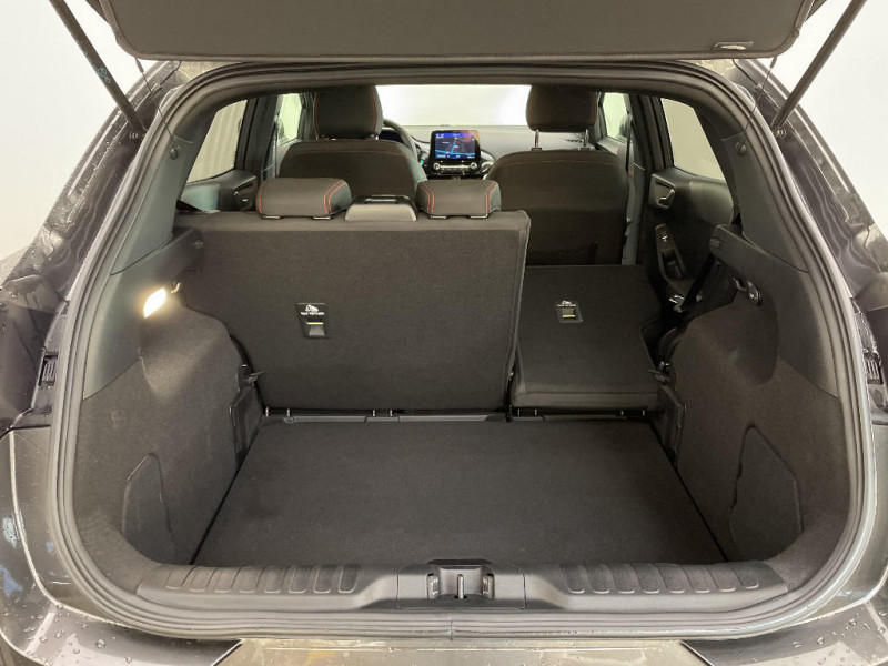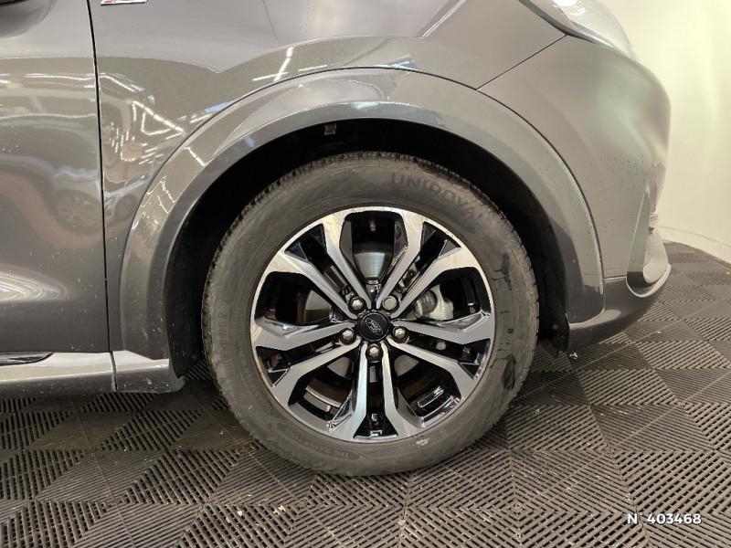 3ème appui-tête AR / 5 Modes de conduite sélectionnables (normal, eco, sport, faible adhérence, trail) / Aide au maintien dans la voie avec détection des bas-côtés / Phares antibrouillard AV avec fonction éclairage des angles / Rétroviseurs extérieurs couleur carrosserie électriques, dégivrants et rabattables électriquement avec éclairage d'approche / Sellerie tissu noir Court avec surpiqûres rouges / Siège conducteur a réglage manuelle en hauteur avec soutien lombaire / Sortie d'echappement chromée / Suspension Sport / Système audio Ford SYNC3 avec écran tactile 8", commandes vocales, 2 ports USB, alerte contresens, compatible AppLink, Apple CarPlay et Android auto, 6 HP / Système de navigation Europe et points d'intérêts Michelin / Système de prévention de collision avec freinage post-collision et détection piétons / Système MyKey (seconde clé programmable) / Tapis de sol AV avec surpiqûres / Trappe Easy Fuel / Feux de route intelligents - Commutation automatique des feux de route aux feux de croisement / FordPass Connect avec modem embarqué et fonction E-Call / Volant à méplat 3 branches ST-Line avec surpiqûres rouges / Badges extérieurs ST-Line / Becquet couleur carrosserie / Bouton de démarrage "Ford Power" / Combiné d'instrumentation numérique 12.3" avec Ecomode / Console centrale avec accoudoir et rangements / Désactivation de l'airbag passager / Disques de frein AV / Eclairage d'ambiance intérieur / Environnement noir / Grille de calandre Active / Grille de calandre ST-Line / Jantes alliage 17" 5x2 branches finition Black Machined (pour pneus toutes saisons 215/55 R17) / Jantes alliage 17" 5x2 branches finition Black Machined (pour pneus 215/55 R17) / Kit de carrosserie ST-Line / Kit de réparation pneumatique / Levier de frein à main Sensico / Levier de vitesse Sensico / Limiteur de vitesse intelligent (affichage instantané des limitations de vitesse sur le tableau de bord) / Navigation avec Système audio Ford SYNC3 avec écran tactile 8", commandes vocales, 2 ports USB, alerte contresens, compatible AppLink, Apple CarPlay et Android auto, 6 hauts-parleurs