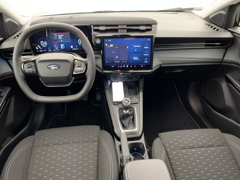 Console centrale avec accoudoir coulissant / Grille de calandre Active / Pommeau de vitesse avec surpiqûres grises / Kit de réparation des pneumatiques / Rétroviseur intérieur électrochrome / Coque de rétroviseur couleur carrosserie / Modem 5G / Bouclier AV Titanium / Arches de roues gris anthracite / Jupes latérales gris anthracite / Freins à disques AV / Planche de bord en vinyle Premium / Ciel de toit avec pare-soleil éclairés / Megabox (compartiment de rangement sous le plancher du coffre) / Bouton de démarrage Ford / Intérieur àéclairage monochrome / Assistant de pré collision avec freinage post collision / Système d'infodivertissement SYNC4 avec écran tactile 12" et commandes vocales, 2 ports USB, navigation, Apple CarPlay et Android auto, 6 HP / Combiné d'instrumentalisation numérique 12.8" / Avertisseur de conduite à contre-sens / Assistance à la conduite économique / Système de contrôle de la trajectoire et de la stabilité avec assistant au freinage d'urgence et aide au démarrage en côte / Pneus eco 215/55 R17 94H / Commutateur de feux de route automatique / Alerte de vigilance conducteur / Frein à tambour AR / Volant en cuir Sensico / Boîte manuelle 6 vitesses / Contrôle de la traction (TCS) / Projecteurs LED avec feux de jour / Sellerie tissu noir et gris avec surpiqûres grises / Rétroviseurs extérieurs avec répétiteurs de clignotants intégrés / Siège conducteur à réglage manuel 4 positions / Siège conducteur à réglage manuel 2 positions /
