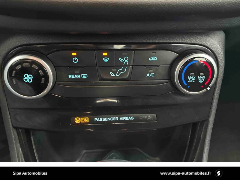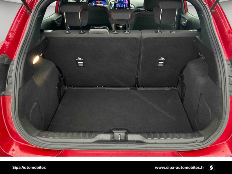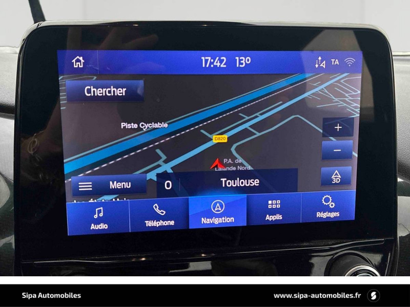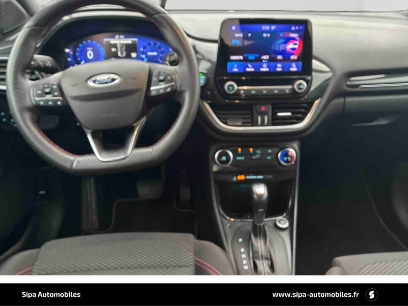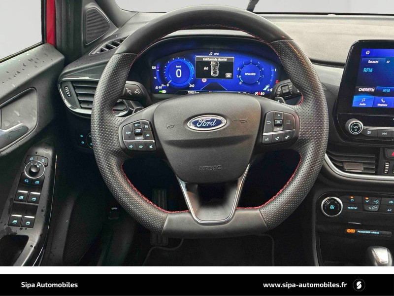 3ème appui-tête AR / 5 Modes de conduite sélectionnables (normal, eco, sport, faible adhérence, trail) / Aide au maintien dans la voie avec détection des bas-côtés / Badges extérieurs ST-Line / Becquet couleur carrosserie / Bouton de démarrage "Ford Power" / Combiné d'instrumentation numérique 12.3" avec Ecomode / Console centrale avec accoudoir et rangements / Désactivation de l'airbag passager / Disques de frein AV / Eclairage d'ambiance intérieur / Environnement noir / Feux de route intelligents - Commutation automatique des feux de route aux feux de croisement / FordPass Connect avec modem embarqué et fonction E-Call / Grille de calandre ST-Line / Jantes alliage 17" 5x2 branches finition Black Machined (pour pneus toutes saisons 215/55 R17) / Kit de carrosserie ST-Line / Kit de réparation pneumatique / Levier de frein à main Sensico / Levier de vitesse Sensico / Limiteur de vitesse intelligent (affichage instantané des limitations de vitesse sur le tableau de bord) / Navigation avec Système audio Ford SYNC3 avec écran tactile 8", commandes vocales, 2 ports USB, alerte contresens, compatible AppLink, Apple CarPlay et Android auto, 6 hauts-parleurs / Phares antibrouillard AV avec fonction éclairage des angles / Rétroviseurs extérieurs couleur carrosserie électriques, dégivrants et rabattables électriquement avec éclairage d'approche / Sellerie tissu noir Court avec surpiqûres rouges / Siège conducteur a réglage manuelle en hauteur avec soutien lombaire / Sortie d'echappement chromée / Suspension Sport / Système de prévention de collision avec freinage post-collision et détection piétons / Système MyKey (seconde clé programmable) / Tapis de sol AV avec surpiqûres / Trappe Easy Fuel / Volant à méplat 3 branches ST-Line avec surpiqûres rouges