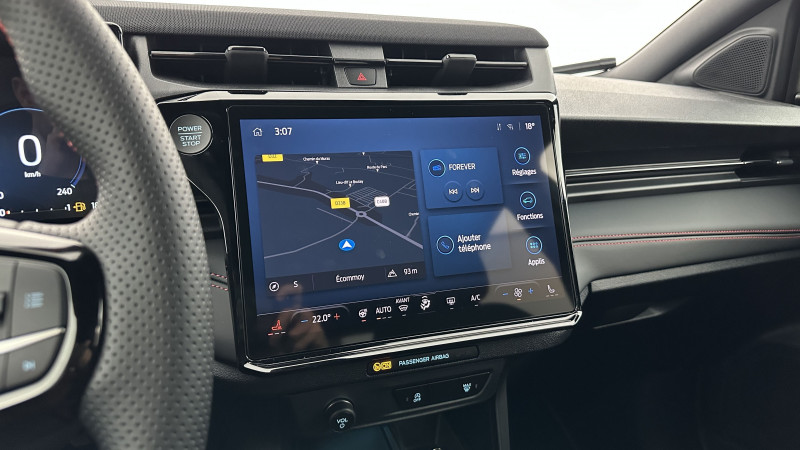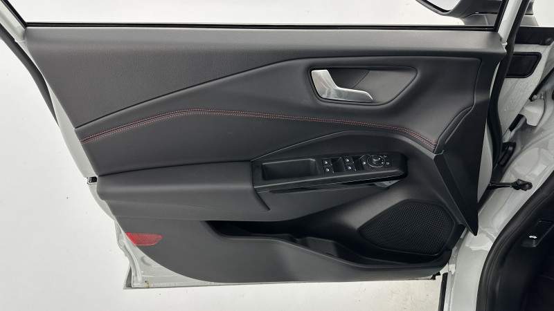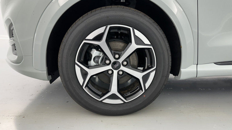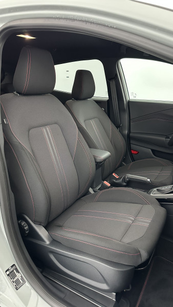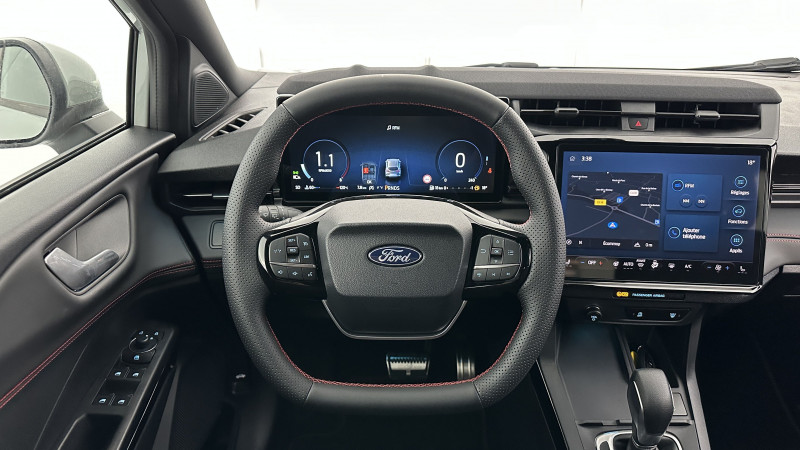 Kit carrosserie ST-Line (bouclier avant Sport et diffuseur arrière) / Arches de roue couleur carrosserie / Jupes latérales couleur carrosserie / Pédalier aluminium / Sièges avant en tissu avec surpiqûres rouge / Plaques de seuil de porte aluminium avec logo / Projecteurs LED avec feux de jour et commutateur de feux de route automatique / MegaBox® (compartiment de rangement sous le plancher du coffre) / Rétroviseur intérieur électrochrome / Système d'infodivertissement SYNC 4 avec écran tactile 12" avec Navigation (et Apple CarPlay - Android Auto) / Combiné d'instrumentation numérique 12,8" / Caméra de recul et capteurs de stationnement arrière / Alerte de véhicule en approche / Suspension Sport / Kit de réparation des pneumatiques /