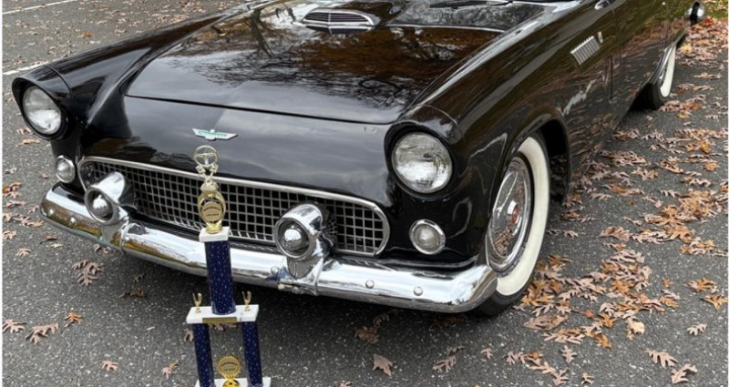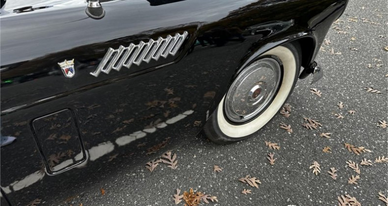 1956 Ford Thunderbird • Raven Black paint • Black convertible top • Fender skirts • Hood scoop • Driver-side chrome mirror • Chrome brightwork • 15-inch steel wheels • Chrome wheel covers • 6.70 Coker Classic whitewall radial tires • Black and white vinyl upholstery • Bench seat • AM radio • Musical car horn • Gauges • 150-mph speedometer • 5, 000-rpm tachometer • Temperature Clock • Clock • Fuel • Odometer shows 79, 717 miles • Engine 312ci V8 • 225 horsepower • 9.0:1 compression ratio • Four-barrel carburetor • Transmission Three-speed Fordomatic automatic • 3.31 gears • Drum brakes • Dual exhaust system • Color-matched removable hardtop • New York registration • Musical car horn • AM radio • Ownership History • Offered by a private seller • Current location: New York. Provenance : New York, USA. Disponibilité : environ 7 semaines, clés en main. 42 000 € tout compris (import, taxes, procédure d'immatriculation). Annonce publiée le 27/11/2025