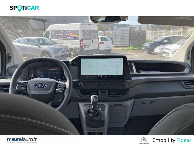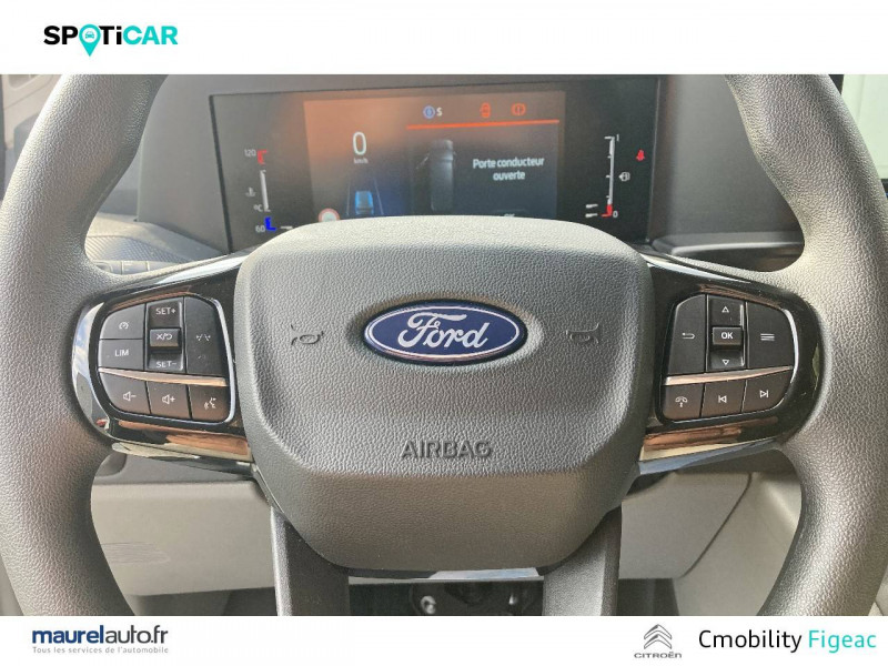 2 Clés avec télécommande / Air conditionnéà régulation automatique à recirculation d'air / Allumage automatique des phares intelligent (commutation automatique des feux de croisement / feux de route en fonction des conditions de circulation) / Anneaux d'arrimage de charge (6) / Assistance Pré-Collision 2.0 / Bac de rangement au tableau de bord - petit modèle / Banquette passager AV 2 places avec trappe de chargement / Batterie standard H7 AGM 75Ah, 710A / Bavettes AR / Bavettes AV / Boîte à gants avec couvercle verrouillable / Ceintures de sécurité 3 points à enrouleur sur tous les sièges (noires) / Cloison de séparation métallique pleine / Combiné d'instrumentation mixte analogique/numérique 8,3'' / Console de rangement au pavillon / Contrôle adaptatif de la charge (LAC) / Dégivreur de pare-brise électrique / Déverrouillage des portes en deux étapes - 1 pression = portes AV / 2 pressions = toutes portes / Dispositif de retenue d'ouverture des portes AR à 90/180 degrés / Eclairage de courtoisie / Eclairage LED du compartiment de chargement / Enjoliveurs complets de roue / Feux AR Halogene / Freinage assistéà double circuit, ABS et freins à disques AV/AR / Garnissage en tissu Plus Style, Noir Onyx / Grille de calandre noire / Infodivertissement SYNC 4 avec écran tactile 13" / Kit de réparation pneumatiques anticrevaisons / Lave/essuie-glaces AV automatique à détecteur de pluie / Ligne de toit basse / Modem embarqué 5G FordPass Connect / Numéro de série visible de l'extérieur / Pack Assistance conduite 2 / Pack Assistance conduite 2 Assistant pré-collision (caméra), Aide au maintien dans la voie, Régulateur / limiteur de vitesse intelligent, Reconnaissance des panneaux de signalisation, Alerte de circulation à contre-sens, Alerte de vigilance conducteurt, Aide au stationnement AV/AR, Caméra de recul / Pack Sièges Standard+ 11A - Siège conducteur réglable en hauteur - Trappe (3 places) Garnissage Tissu Plus Style, noir onyx Siège conducteur à dossier inclinable et appuie-tête, à réglage manuel 4 directions, réglable en hauteur, avec soutien lombaire, Banquette 2 passagers chauffante avec rangement sous l'assise et cloison de séparation avec trappe / Panneaux d'habillage partiel des portes latérales/AR / Pare-brise chauffant / Pare-chocs AR bi-ton noir/teinte carrosserie / Pare-chocs AV bi-ton noirs/teinte carrosserie / Poignée de maintien sur le pilier A / Poignées de maintien côté conducteur et passager / Pommeau de levier de vitesses moulé / Porte de chargement latérale coulissante côté trottoir / Portes AR tôlées battantes / Réglage manuel du siège conducteur en 4 positions / Réservoir 55 Litres / Réservoir AdBlue 20 Litres / Rétroviseurs extérieurs double vision à réglage électrique avec répétiteurs de clignotants et chauffants / Revêtement du plancher de cabine en caoutchouc / Roues acier 6.5x16" et pneumatiques 215/65 R16 109T BSW / Sans dégivrage de la lunette AR / Sans vitre AR / Serrures haute sécurité / Signal sonore de non fermeture des portes lors du verrouillage / Signal sonore d'ouverture des portes en roulant / Support lombaires du siège conducteur / Suspension AR indépendante à bras tirés avec ressorts hélicoïdaux et amortisseurs à gaz / Suspension AV indépendante àéléments de type McPherson, ressorts hélicoïdaux, barre antiroulis et amortisseurs à gaz / Système Audio 2 Radio FM/DAB à 4 hp + Commandes au volant et commandes vocales + Bluetooth, prise USB + Compatibilité Android Auto & Apple Car Play / Système de protection anti-retournement (ROM) / Système d'infodivertissement SYNC 4 avec écran tactile 13'' / Trappe à carburant Ford EasyFuel / Vitres AV à commande électrique avec commande à impulsion montée/descente côté conducteur