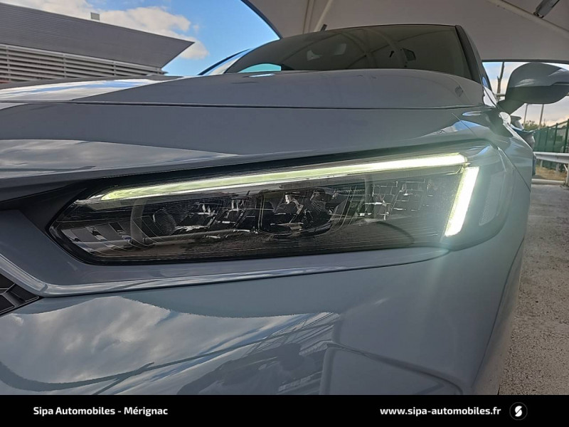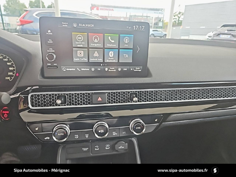8 HP / Affichage multi-information 7" / Ancrages ISOFIX / I-SIZE / Antenne aileron de requin couleur carrosserie / Appuis-tête AV anti coup du lapin / Assistance à la conduite dans les embouteillages / Assistance à la stabilité du véhicule (VSA) / Boîte automate à fonction continue / Ceintures de sécurité AV avec enrouleur à verrouillage d'urgence (ELR) / Chargeur sans fil / Clignotants AV et AR LED / Commande de freinage / décélération régénérative (palettes) / Contrôle de la traction (TCS) / Coupure automatique du moteur à l'arrêt Auto Stop / Crochet pour filet de chargement / Déverrouillage des portes paramétrables / Direction à assistance électrique adaptatif (MA-EPS) / Direction à assistance électrique variable / Eclairage d'ambiance (plafond) / Eclairage de la boîte à gants / Eclairage de miroirs de courtoisie (pare-soleils) / Eclairage du coffre / Eclairage du compteur blanc / Frein de stationnement électrique automatique / Garniture de fenêtre - chrome / Grille de ventilation en "nid d'abeille" en chrome mat / Honda CONNECT avec système de navigation (écran tactile 9", AM/FM/DAB, Apple Carplay et Android Auto informations routières en temps réel) / HP - Tweeters AV / Indicateur de perte de pression des pneus / Jantes alliage 17" bicolore diamanté / Kit de réparation des crevaisons / Liseuse AV / Lumière de courtoisie / Miroirs de courtoisie dans les pare-soleils / Modes de conduite - ECON/Normal/Sport/Individuel / Panneaux de portes intérieurs Noir mats / Plage AR / Pneumatiques 215/50 R17 95W / Poignées de porte intérieures chrome / Poignées de portes extérieures ton carrosserie / Prise accessoire (AV et AR) / Prise USB 2 AR type A / Prise USB 2 AV type C / Radars de stationnement (4 capteurs AV et 4 capteurs AR) / Rétroviseur intérieur automatique jour/nuit / Rétroviseurs extérieurs couleur carrosserie / Rétroviseurs rabattables et fermeture/ouverture des vitres depuis la clé / Siège conducteur - soutien lombaire à réglage électrique / Siège passager AV - poche aumônière / Signal de freinage d'urgence automatique / Suivi automatique à basse vitesse / Surveillance de la vigilance du conducteur / Système d'alarme / Système d'alerte anticollision frontale / Système d'appel d'urgence (eCall) / Système d'assistance au maintien dans la voie de circulation / Système de déverrouillage et de démarrage sans clé / Système de prévention des collisions par régulation de l'accélérateur (vers l'AV et l'AR) / Système de prévention et d'atténuation des sorties de route / Système de surveillance de l'angle mort avec alerte de véhicule en approche / Système de temporisation de l'allumage/extinction des feux / Système d'immobilisation électronique / Système d'optimisation du comportement routier AHA (Agile Handling Assist)
