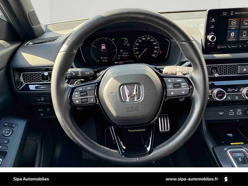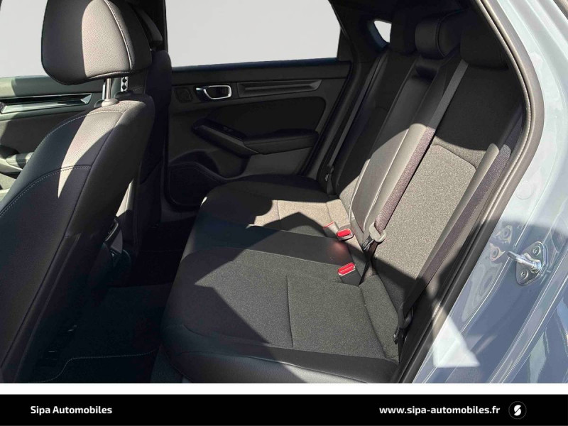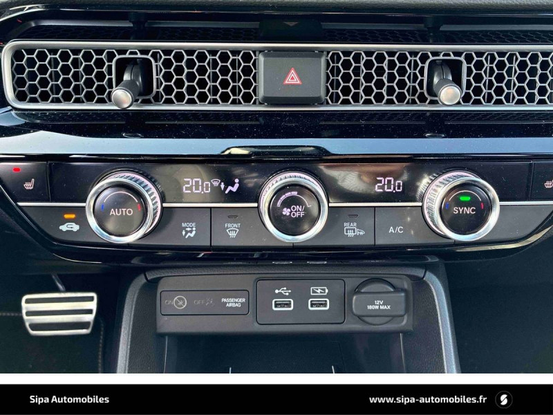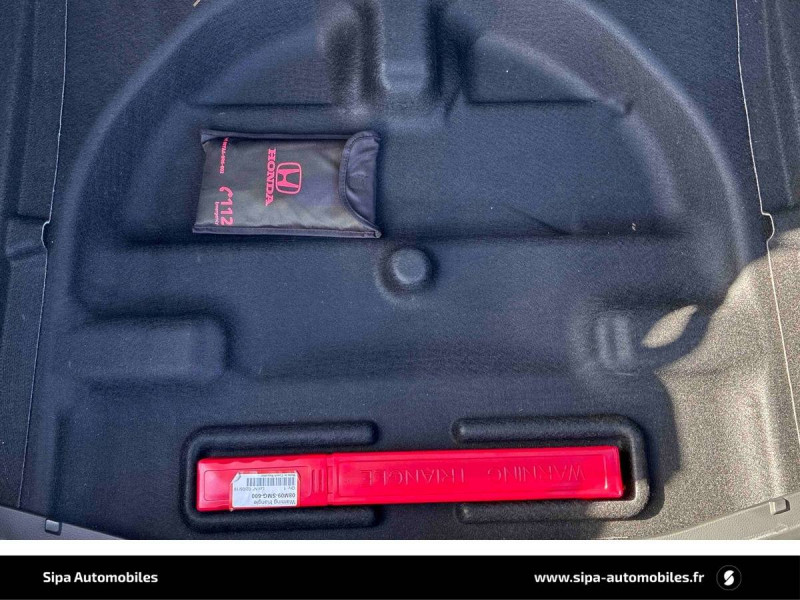 4 Modes de conduite (ECO/NORMAL/SPORT/INDIVIDUAL) / 8 HP / Affichage multi-information 7" / Ancrages ISOFIX / I-SIZE / Antenne aileron de requin couleur carrosserie / Appuis-tête AV anti coup du lapin / Assistance à la conduite dans les embouteillages / Cache-bagages à enrouleur / Capot à soulèvement automatique / Ceintures de sécurité AV et AR avec enrouleur à verrouillage d'urgence (ELR) / Chargeur sans fil / Clignotants LED / Commande de freinage / décélération régénérative (palettes) / Déverrouillage des portes paramétrables / Direction à assistance électrique variable / Eclairage d'ambiance blanc (plafond) / Eclairage de courtoisie / Eclairage de la boîte à gants / Eclairage de miroirs de courtoisie (pare-soleils) / Eclairage du coffre / Eclairage du compteur blanc / Fixations de filet à bagages / Fonction ECON déconnectable / Frein de stationnement électrique automatique / Garnitures de fenêtres (faible brillance) noir brillant / Garnitures de portes en tissu noir / Garnitures en cuir synthétique noir Accoudoir central AV, Accoudoirs de porte AV, Accoudoirs de portes AR. / Honda CONNECTavec Navigation (Ecran tactile 9", radio AM / FM / DAB, Apple Carplay et Android Auto) / Inserts intérieurs de portes AR Noir Mat / Inserts intérieurs de portes AV Noir Brillant / Inserts noirs texturés anti-trace console centrale / Jantes alliage 18" Noir Brillant / Kit de réparation des crevaisons / Liseuse AR / Liseuse AV / Miroirs de courtoisie dans les pare-soleils / Pédalier sport / Phares LED / Poches aumônières siège passager / Poignées de porte intérieures chrome platine / Poignées de portes extérieures couleur carrosserie / Prise accessoire (AV & Coffre) / Radars de stationnement 4 capteurs à l'AV et 4 capteurs à l'AR / Rétroviseur intérieur automatique jour/nuit / Rétroviseurs extérieurs asphériques côté conducteur / Sellerie cuir synthétique et tissu (noir) / Sièges AV conducteur avec soutiens lombaires électrique / Signal de freinage d'urgence automatique / Suivi automatique à basse vitesse / Système d'alarme / Système d'alerte anticollision frontale / Système d'appel d'urgence (eCall) / Système d'assistance au maintien dans la voie de circulation / Système de déverrouillage et de démarrage sans clé / Système de feux de route actifs / Système de prévention des collisions par régulation de l'accélérateur (vers l'AV et l'AR) / Système de surveillance de l'angle mort avec alerte de véhicule en approche / Système de temporisation de l'allumage/extinction des feux / Système d'immobilisation électronique / Système d'optimisation du comportement routier AHA (Agile Handling Assist) / Tweeters AV / Ventilation AR / Vitres - Télécommandés