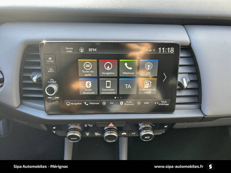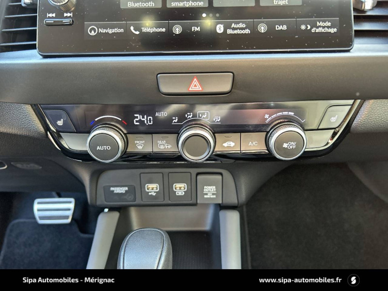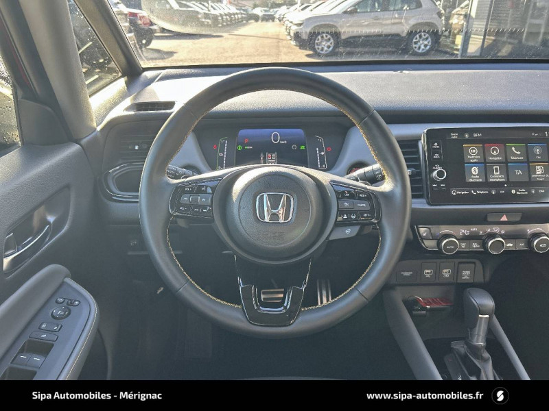 4 HP / Accoudoirs de portes en similicuir / Affichage multi-information 7" / Ajusteur des phares automatiques / Alarme antivol / Alerte anticollision frontale / Antenne type requin / Assistant en embouteillage (TJA) / Aumônières de sièges AV / Calandre Sport / Ceintures de sécurité AV et AR à enrouleur à blocage par inertie (ELR) / Clignotants AV LED / Contrôle électronique de trajectoire VSA (Vehicle Stability Assist) / Crochets d'arrimage dans le coffre / Direction à assistance électrique - Rapport de vitesse variable / eCall (Europe) / Eclairage d'ambiance blanc (plafond) / Eclairage de courtoisie / Eclairage du coffre / Finition des poignées de porte extérieures - carrosserie / Fonctions de la clé plip - Rétroviseurs et vitres / Frein de stationnement électronique avec maintien du frein automatique / Habillage exclusif (emplacement)-Pare-chocs AV et AR exclusifs Advance Sport / Honda CONNECT avec système de navigation (écran tactile 9", AM/FM/DAB, Apple Carplay et Android Auto informations routières en temps réel) / Jantes alliage 16" Sport diamantées / Kit de réparation des crevaisons / Liseuse AV / Logo e:HEV / Minuterie marche/arrêt automatique des phares (Fonction Retour à la maison/Quitter la maison) / Miroirs de courtoisie dans les pare-soleils / Modes de conduite - ECON/Normal/Sport / Palettes de régénération au freinage/à la décélération / Pare-soleil avec miroirs de courtoisie / Pédales Sport - Acier Inoxydable / Phares LED / Plage AR / Pneus 185/55 R16 87H / Points de fixation de siège enfant ISO Fix / I-SIZE / Pommeau de levier de vitesse cuir / Prise accessoires AV / Prises USB AV 2 (1 Data & 1 Charge) / Prise USB AR (2 x Charge) / Sellerie Suédine/Tissu/Similicuir / Signal d'arrêt d'urgence / Spoiler / Style "Advance Sport" (pare-chocs AV et AR couleur Noir Brillant) / Suivi du véhicule précédent à basse vitesse / Système d'assistance au maintien dans la voie de circulation LKAS (Lane Keeping Assist System) / Système d'atténuation de sortie de voie (RDM) / Système de déverrouillage et de démarrage sans clé / Système de feux de route actifs HSS (Highbeam Support System) / Système de notification du démarrage du véhicule précédent / Système de reconnaissance des panneaux de signalisation TSR (Traffic Sign Recognition) / Système de surveillance de l'angle mort avec alerte de véhicule en approche / Système d'optimisation du comportement routier AHA (Agile Handling Assist) / Volant chauffant / Volant en cuir 3 branches