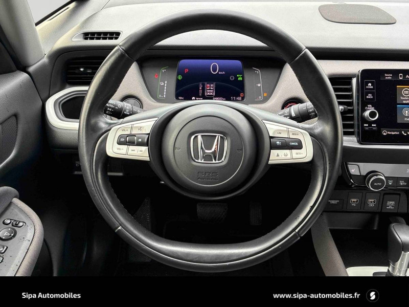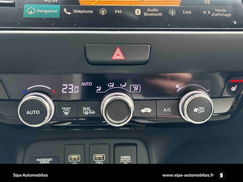 8 HP / Affichage digital multi information / Ancrages ISOFIX / I-SIZE / Antenne aileron de requin / Audio - Haut-parleur central / Audio - Tweeter AV / Badge e:HEV / Caméra de recul grand angle avec guides dynamiques / Direction à assistance électrique variable / Eclairage de courtoisie / Essuie-glace AV automatique à capteur de pluie / Feux de route actifs : HSS (Hight beam Support System) / Fonction ECON déconnectable / Frein de stationnement électronique avec maintien de freinage / Garnitures intérieures maille souple / Grille de calandre / Honda CONNECT avec navigation HERE (Ecran tactile 9", Radio AM/FM/DAB, Apple Carplay sans fil et et Android Auto) / Kit anti-crevaison / Liseuse AV / Miroirs de courtoisie dans les pare-soleils / Pack Carrosserie : Pare-chocs AV et AR, Garnitures antibrouillards AV, Protections latérales / Pack de systèmes avancés d'assistance au conducteur / Phares LED / Plage AR / Poche aumônière au dos du siège passager / Poignées de portes extérieures couleur carrosserie / Poignées de portes intérieures plaquées / Pommeau de levier de vitesse cuir / Prise accessoires AV / Prises USB AV 2 (1 Data & 1 Charge) / Prise USB AR (2 x Charge) / Radars de stationnement 4 capteurs à l'AV et 4 capteurs à l'AR / Rails de toit / Rétroviseurs extérieurs - Fonction recul côté passager / Sellerie tissu déperlant / Signal de freinage d'urgence automatique / Sortie d'échappement simple / Subwoofer (caisson de graves) / Suivi automatique à basse vitesse / Système d'alarme / Système d'assistance au maintien dans la voie de circulation / Système de coupure automatique du moteur à l'arrêt Auto Stop / Système de déverrouillage et de démarrage sans clé / Système de feux de route actifs / Système de surveillance de l'angle mort avec alerte de véhicule en approche / Système de temporisation de l'allumage/extinction des feux / Système d'immobilisation électronique / Type d'enjoliveur - Centre de roue (3D H Chromé)