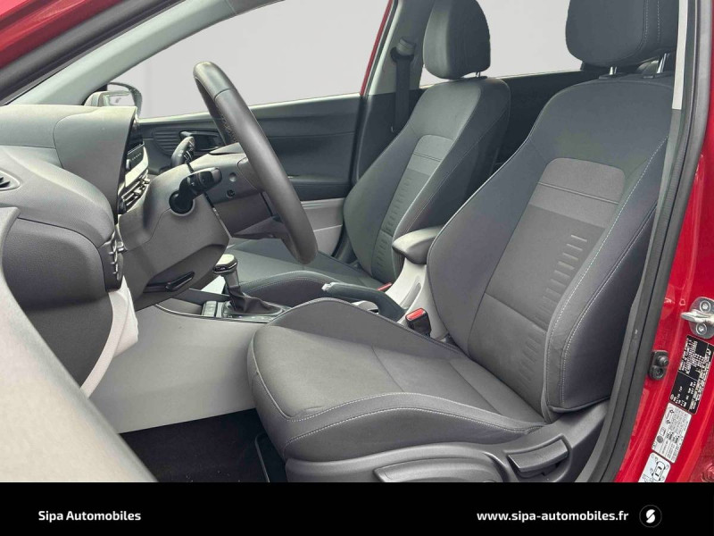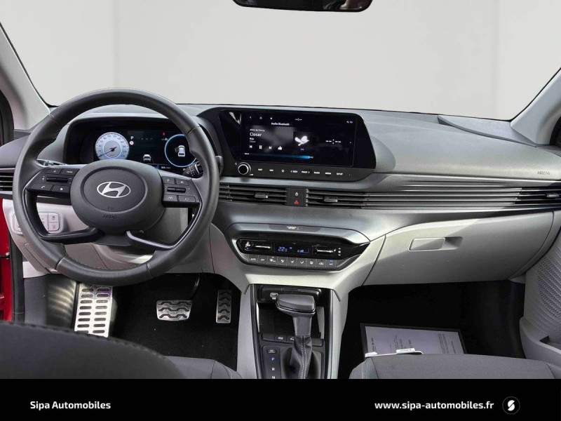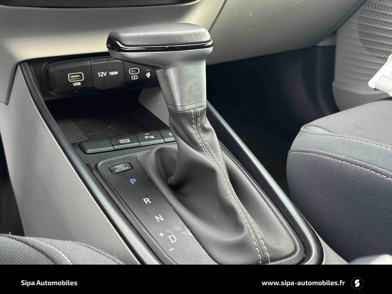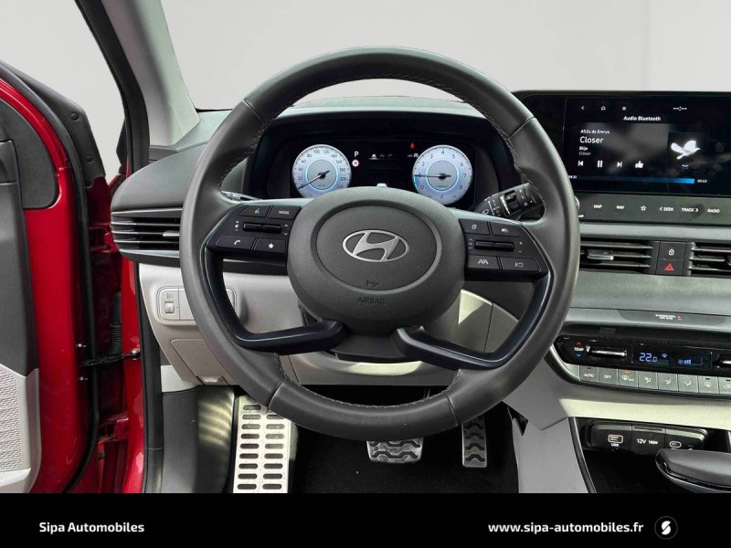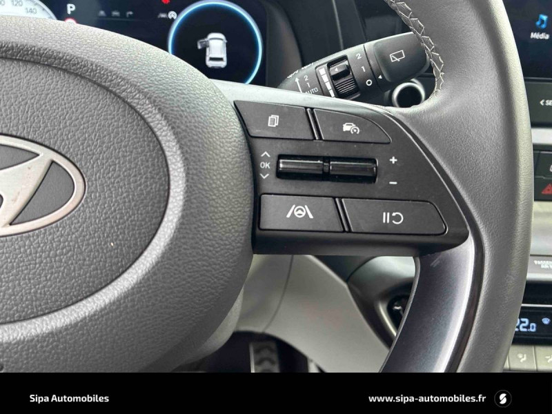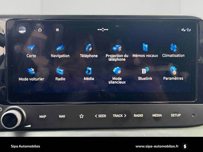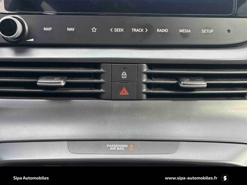 6 Airbags: frontaux conducteur et passager (déconnectable côté passager), latéraux AV, rideaux AV et AR / Accès mains-libres et démarrage sans clé / Alerte de débouclage de la ceinture de sécuritéà toutes les places / Alerte de présence de passager AR / Assistance active au suivi de voie / Calandre noir laqué / Chargeur sans fil pour téléphone compatible / Climatisation automatique avec capteur désembuage automatique / Compteurs numériques 10,25" / Console de rangement sous accoudoir AV / Contrôle de trajectoire électronique (ESP & VSM) / Détection de fatigue du conducteur / eCall: appel d'urgence automatique aux services de secours avec géolocalisation du véhicule / Eclairage d'accueil et d'accompagnement / Eclairage d'ambiance à LED personnalisable / Eclairage d'habitacle à LED / Ecran couleur tactile 10.25" / Feux AV bi-LED avec éclairage additionnel en virage / Feux de route intelligents / Feux "Seamless Horizon" avec bandeau LED / Filet de coffre / Freinage d'urgence autonome avec reconnaissance piétons et cyclistes / Intérieur bi-ton noir et gris clair / Jantes alliage 17" 205/55 R17 91H / Jonc de vitres chromé / Peinture Mangrove Green / Plancher de coffre modulable / Poche aumônière dans le dossier du siège passager AV / Porte-gobelets AV / Port USB de recharge à l'AR / Port USB de recharge à l'AV / Rétroviseur intérieur jour/nuit automatique / Sécurité enfants sur portes AR / Services connectés BlueLink avec carte SIM incluse: Transmission de destination au système de navigation à distance - Géolocalisation du véhicule - Historique des trajets - Statut du véhicule (portes, moteur, ventilation) - Diagnostic Services Bluelink PRO offerts pendant 6 mois et services Bluelink LITE offerts pendant 10 ans après la date de mise en circulation du véhicule. Les fonctionnalités à distance s'effectuent via l'application depuis un téléphone compatible, hors frais de connexion. / Système audio RDS/DAB compatible MP3 avec connexion USB-A, 6 HP / Système de navigation Europe avec programme de mise à jour à distance et services Hyundai Live information trafic, carburants, emplacements de stationnement, météo, points d'intérêt et zones de danger / Système ISOFIX aux places latérales AR / Verrouillage automatique des portes en roulant / Vitre électrique séquentielle côté conducteur / Volant et levier de vitesses gainés de cuir