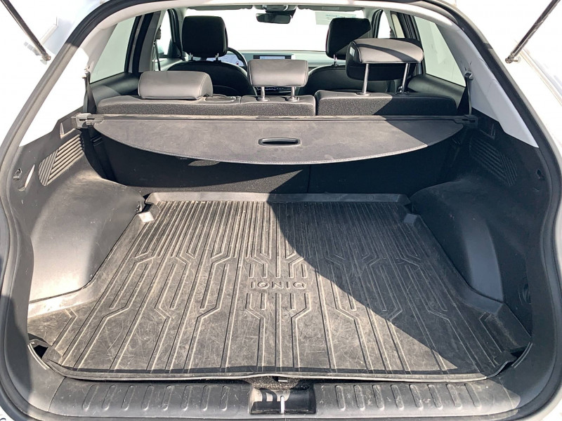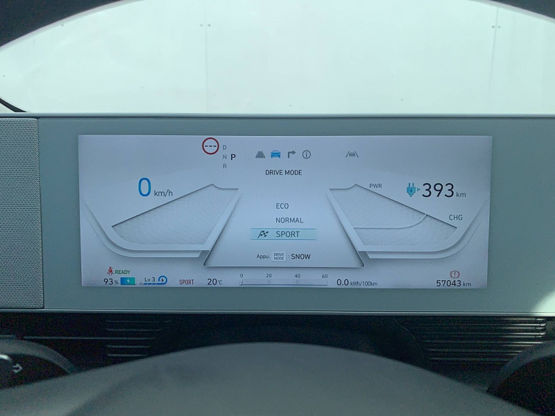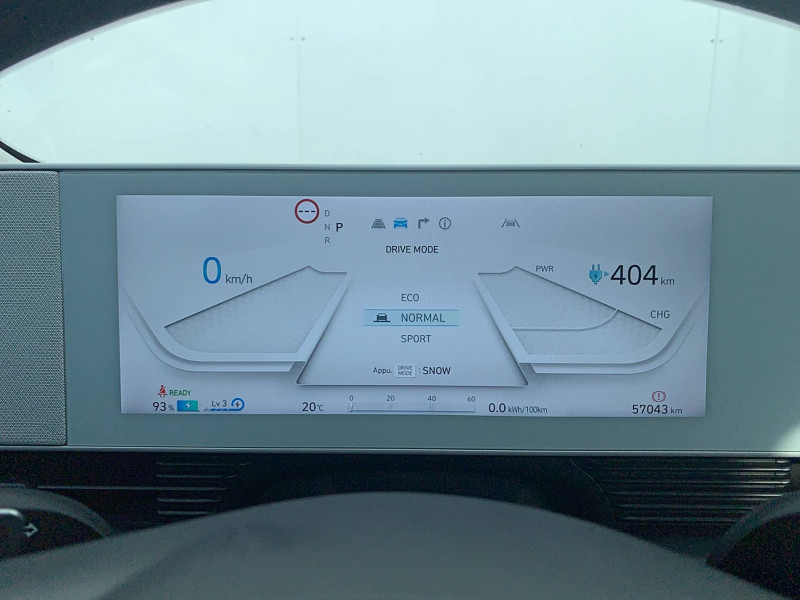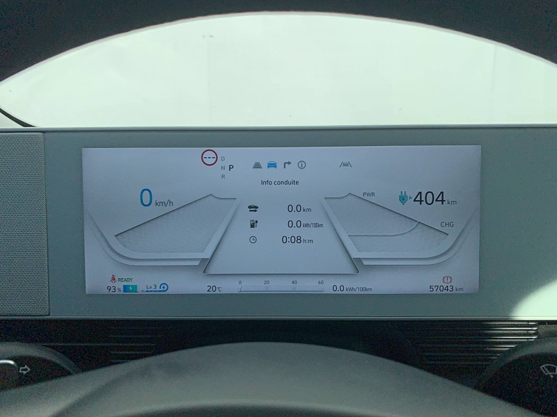 ABS, EBD et AFU / Accoudoirs AV/AR / Alarme périmétrique / Alerte de circulation transversale à l'AR avec fonction freinage / Alerte de présence de passager AR / Antenne de toit type requin en effet verre / Assistance active à la conduite sur autoroute avec fonction changement de voie / Assistance active au maintien et au suivi de voie / Assistance à la sortie du véhicule / Boîte à gants coulissante type "tiroir" / Câble de recharge pour prise domestique / Câble de recharge Type 2 pour borne de recharge / Cache-bagages à enrouleur / Caméra de recul avec lignes de guidage dynamiques / Capteur de désembuage automatique du pare-brise / Chargeur embarqué tri-phasé 11 kW / Chargeur sans fil pour téléphone compatible / Compteurs numériques 12.3" / Console centrale AV coulissante / Console centrale avec bac de rangement sous l'accoudoir AV / Contrôle de trajectoire électronique ESP avec gestion de stabilité pour remorque / Détection de fatigue du conducteur / Direction assistée électrique asservie à la vitesse / Drive Mode (Eco, Normal, Sport et Neige) / eCall : appel d'urgence automatique aux services de secours avec géolocalisation du véhicule / Feux AR à LED type "Pixel" / Feux de jour et de position AV à LED type "Pixel" / Feux de route intelligents / Filet de coffre / Freinage anti multi-collisions / Freinage d'urgence autonome avec fonction intersection/croisement / Freinage d'urgence autonome avec reconnaissance piétons et cyclistes / Freinage régénératif intelligent / Frein de parking électrique avec fonction auto-hold / Jonc de vitres noir / Kit de réparation / Ouïes de ventilation AR / Palettes de freinage régénératif modulable au volant (avec fonction i-Pedal) / Poches aumonières au dos des sièges AV / Poignées de portes extérieures rétractables manuelles / Poignées de portes intérieures grain métal / Porte-gobelets AV/AR / Prise Combo Type 2 - 350 kW / Prise Type 2 - 11 kW / Programmation de la recharge et de la ventilation / Protections AV et AR, ligne de bas de caisse et passages de roue noirs / Protections de seuils de portes grain métal / Rétroviseurs électriques dégivrants, rabattables électriquement avec clignotants intégrés / Rétroviseurs extérieurs couleur carrosserie / Rétroviseurs intérieur jour/nuit automatique / Services connectés BlueLink avec carte SIM incluse / Siège conducteur avec support lombaire électrique / Siège passager avec support lombaire électrique / Sièges AR inclinables / Surveillance des angles morts avec assistance active au changement de voie / Système audio RDS, MP3, 4 HPs, 2 tweeters / Système d'accès mains-libres et démarrage sans clé / Système de chauffage de la batterie / Système de chauffage par pompe à chaleur / Système de navigation Europe avec programme de mise à jour de la cartographie / Système ISOFIX pour siège enfant aux places latérales AR / Système multimédia avec écran couleur tactile 12,3" avec reconnaissance vocale en ligne / Transmission à commande électrique / Verrouillage automatique des portes en roulant / Vide-poches dans portes AV/AR / Vitres électriques séquentielles AV/AR / Volant chauffant