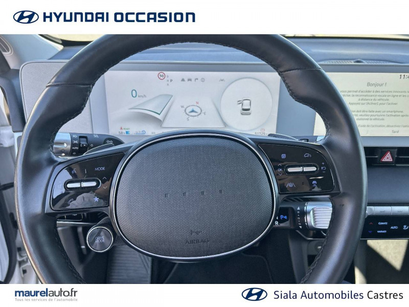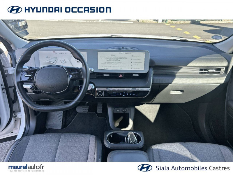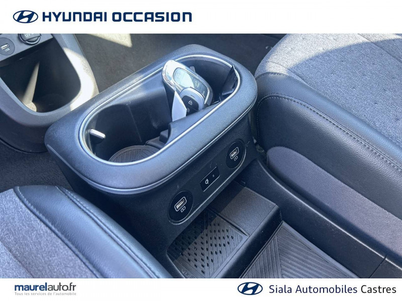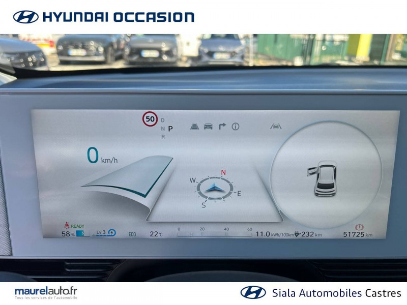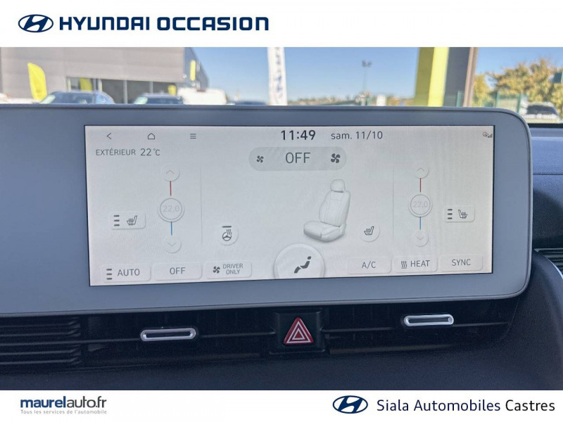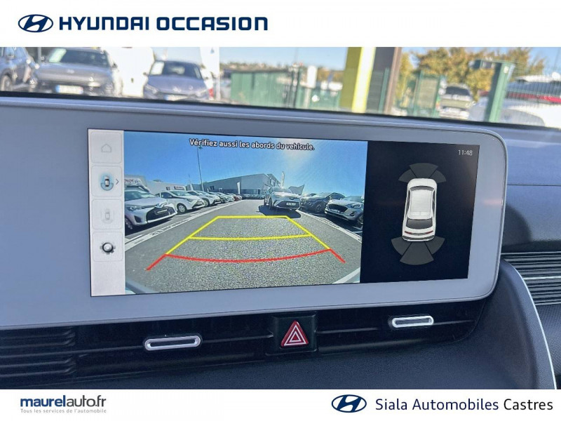 ABS, EBD et AFU / Accoudoirs AV/AR / Alarme périmétrique / Alerte de circulation transversale AR avec fonction freinage / Alerte de présence de passager AR / Antenne de toit type requin en effet verre / Assistance active à la conduite sur autoroute / Assistance active au maintien et au suivi de voie / Assistance à la sortie du véhicule / Boîte à gants coulissante type "tiroir" / Câble de recharge pour prise domestique / Cache-bagages à enrouleur / Caméra de recul avec lignes de guidage dynamiques / Capteur de désembuage automatique du pare-brise / Chargeur embarqué tri-phasé 11kW / Chargeur sans fil pour téléphone compatible / Compteurs numériques 12,3" / Console centrale AV coulissante / Console centrale avec bac de rangement sous l'accoudoir AV / Contrôle de trajectoire électronique ESP avec gestion de stabilité pour remorque / Détection de fatigue du conducteur / Direction assistée électrique asservie à la vitesse / Drive Mode (Eco, Normal, Sport et Neige) / eCall : appel d'urgence automatique aux services de secours avec géolocalisation du véhicule / Eclairage intérieur à LED personnalisable / Feux AR à LED type "Pixel" / Feux de jour et de position AV à LED type "Pixel" / Feux de route intelligents / Filet de coffre / Freinage anti multi-collisions / Freinage d'urgence autonome avec fonction intersections / Freinage d'urgence autonome avec reconnaissance piétons et cyclistes / Freinage régénératif intelligent / Frein de parking électrique avec fonction auto-hold / Hayon mains-libres intelligent / Jonc de vitres noir / Kit de réparation / Ouïes de ventilation AR / Palettes de freinage régénératif modulable au volant (avec fonction i-Pedal) / Poches aumonières au dos des sièges AV / Poignées de portes extérieures rétractables manuelles / Poignées de portes intérieures grain métal / Porte-gobelets AV/AR / Prise Combo Type 2 - 350 kW / Prise Type 2 - 11 kW / Programmation de la recharge et de la ventilation / Protections AV/AR, ligne de bas de caisse et passages de roue noirs / Protections de seuils de portes grain métal / Rétroviseurs électriques dégivrants, rabattables électriquement avec clignotants intégrés / Rétroviseurs extérieurs couleur carrosserie / Rétroviseurs intérieur jour/nuit automatique / Revêtement de tableau de bord et contre-portes en similicuir avec surpiqûres / Sellerie cuir (dossier et assise) / Services connectés BlueLink avec carte SIM incluse / Siège conducteur avec support lombaire électrique / Siège passager avec support lombaire électrique / Sièges AR inclinables / Surveillance des angles morts avec assistance active au changement de voie / Système audio RDS, MP3, 4 HPs, 2 tweeters / Système d'accès mains-libres et démarrage sans clé / Système de chauffage de la batterie / Système de navigation Europe avec programme de mise à jour de la cartographie / Système de préconditionnement de la batterie / Système ISOFIX pour siège enfant aux places latérales AR / Système multimédia avec écran couleur tactile 12,3" avec reconnaissance vocale en ligne / Transmission à commande électrique / Verrouillage automatique des portes en roulant / Vide-poches dans portes AV/AR / Vitres électriques AV et AR (séquentielles à l'AV) / Volant chauffant