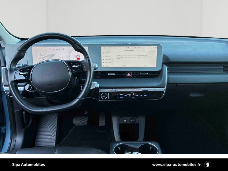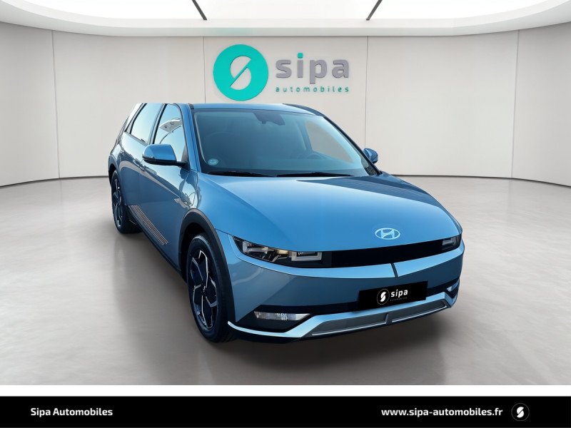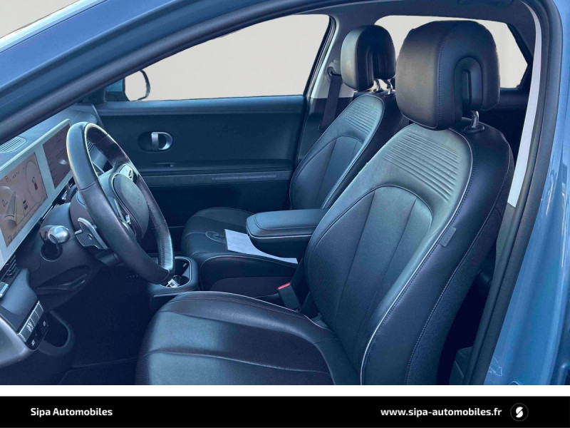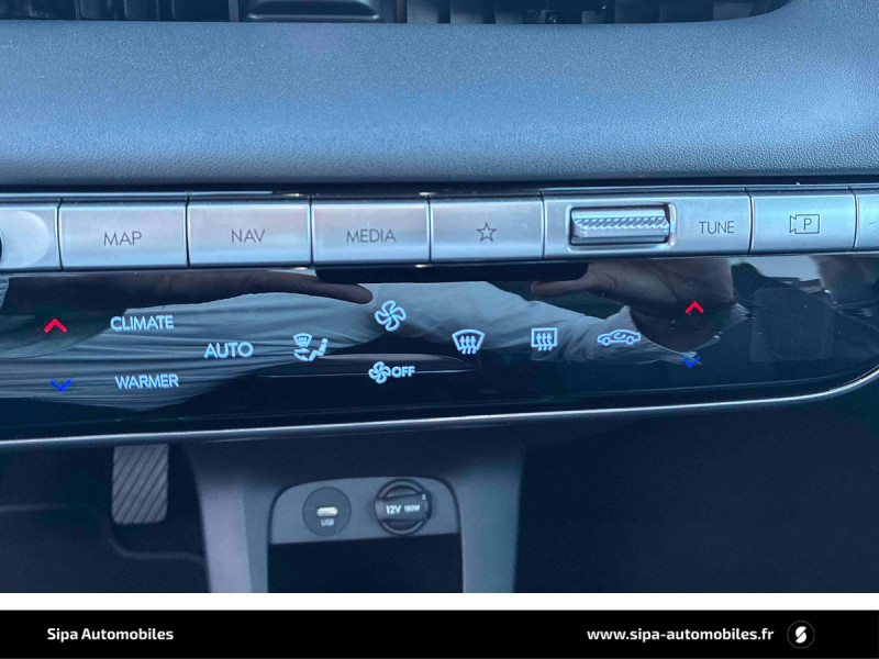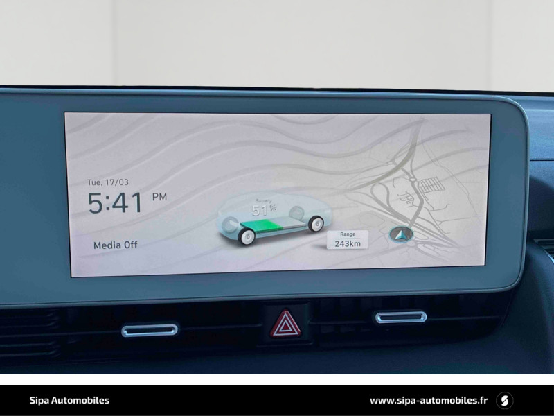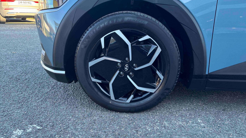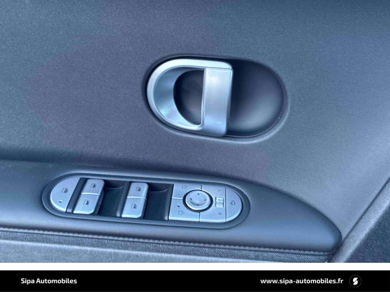 Capteur de désembuage automatique du pare-brise / eCall: appel d'urgence automatique aux services de secours avec géolocalisation du véhicule / Eclairage intérieur à LED personnalisable / Feux AR à LED type "Pixel" / Feux de jour et de position AV à LED type "Pixel" / Revêtement de tableau de bord et contre-portes en similicuir avec surpiqûres / Rétroviseurs intérieur jour/nuit automatique / Sellerie cuir (dossier et assise) / Système de navigation Europe avec programme de mise à jour de la cartographie / Verrouillage automatique des portes en roulant / ABS, EBD et AFU / Accoudoirs AV/AR / Alarme périmétrique / Alerte de circulation transversale AR avec fonction freinage / Alerte de présence de passager AR / Antenne de toit type requin / Assistance active au maintien et au suivi de voie / Assistance active à la conduite sur autoroute / Assistance à la sortie du véhicule / Boîte à gants coulissante type "tiroir" / Cache-bagages à enrouleur / Caméra de recul avec lignes de guidage dynamiques / Chargeur embarqué tri-phasé 11kW / Chargeur sans fil pour téléphone compatible / Compteurs numériques 12,3" / Console centrale AV coulissante / Console centrale avec bac de rangement sous l'accoudoir AV / Contrôle de trajectoire électronique ESP avec gestion de stabilité pour remorque / Câble de recharge pour prise domestique / Direction assistée électrique asservie à la vitesse / Drive Mode (Eco, Normal, Sport et Neige) / Détection de fatigue du conducteur / Feux de route intelligents / Frein de parking électrique avec fonction auto-hold / Freinage anti multi-collisions / Freinage d'urgence autonome avec fonction intersections / Freinage d'urgence autonome avec reconnaissance piétons et cyclistes / Freinage régénératif intelligent / Hayon mains-libres intelligent / Jonc de vitres noir / Kit de réparation / Ouïes de ventilation AR / Palettes de freinage régénératif modulable au volant (avec fonction i-Pedal) / Poches aumonières au dos des sièges AV / Poignées de portes extérieures rétractables manuelles / Poignées de portes intérieures grain métal / Porte-gobelets AV/AR / Prise Combo Type 2 - 350 kW / Prise Type 2 - 11 kW / Programmation de la recharge et de la ventilation / Protections AV/AR, ligne de bas de caisse et passages de roue noirs / Protections de seuils de portes grain métal / Rétroviseurs extérieurs couleur carrosserie / Rétroviseurs électriques dégivrants, rabattables électriquement avec clignotants intégrés / Services connectés BlueLink avec carte SIM incluse / Siège conducteur avec support lombaire électrique / Siège passager avec support lombaire électrique / Sièges AR inclinables / Surveillance des angles morts avec assistance active au changement de voie / Système audio RDS, MP3, 4 HPs, 2 tweeters / Système d'accès mains-libres et démarrage sans clé / Système de chauffage de la batterie / Système de préconditionnement de la batterie / Système ISOFIX pour siège enfant aux places latérales AR / Système multimédia avec écran couleur tactile 12,3" avec reconnaissance vocale en ligne / Transmission à commande électrique / Vide-poches dans portes AV/AR / Vitres électriques AV et AR (séquentielles à l'AV) / Volant chauffant