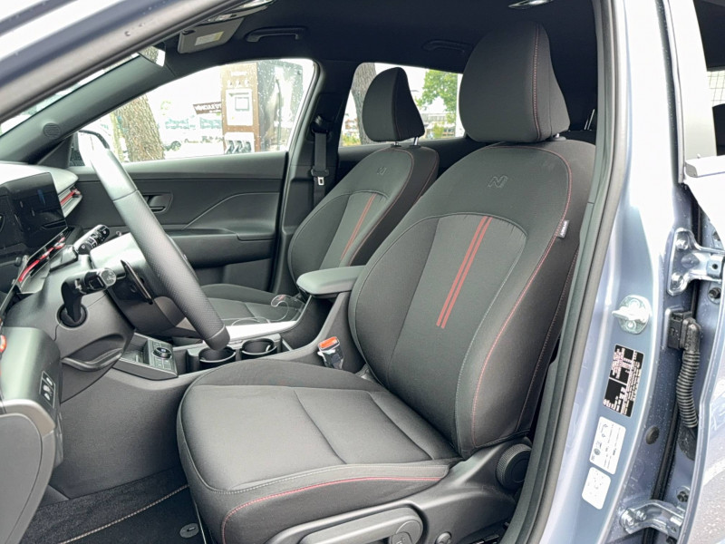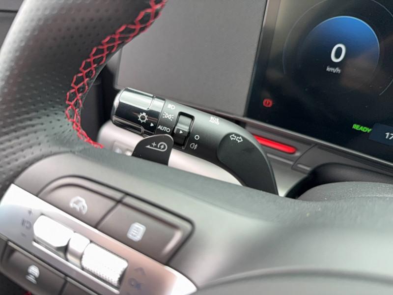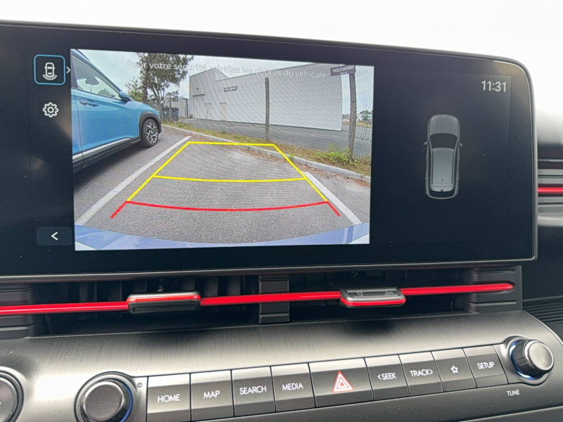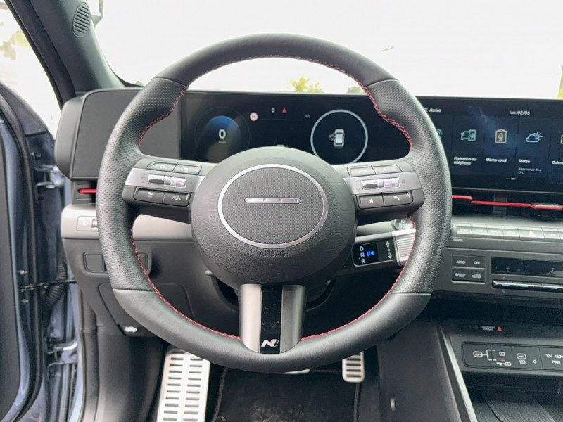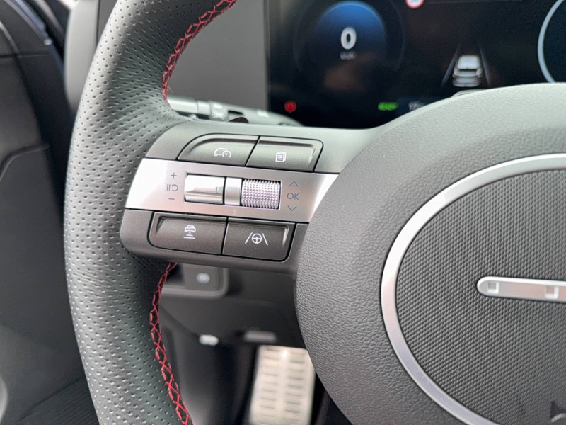 4 prises USB-C; un port de données et une prise de recharge AV, 2 prises de recharge AR / 7 Airbags: frontaux conducteur et passager, latéraux AV, rideaux AV/AR, central AV / Accès mains-libres et démarrage sans clé / Alerte de présence de passager AR / Assistance active à la conduite sur autoroute / Assistance active au maintien et au suivi de voie / Atmosphère intérieure N Line intérieur noir intégral avec inserts décoratifs, liserés et surpiqures rouges, ciel de toit noir, pédalier façon aluminium / Câble de recharge pour prise domestique / Caméra de recul avec lignes de guidage dynamiques / Chargeur embarqué tri-phasé 11 kW / Chargeur sans fil pour téléphone compatible / Climatisation automatique bi-zone avec fonction Driver Only et capteur de désembuage automatique du pare-brise / Compteurs numériques 12.3" / Contrôle de traction électronique ETC / Contrôle de trajectoire électronique (ESC) / Design N Line - jantes alliage 19" - bouclier AV, bouclier AR et jupes latérales spécifiques - rétroviseurs extérieurs noir laqué - ligne de caisse noire / Détection de fatigue du conducteur / Drive Mode / eCall : appel d'urgence automatique aux services de secours avec géolocalisation du véhicule / Eclairage d'ambiance intérieur à LED personnalisable / Feux AV bi-LED type projection avec clignotants à LED / Feux de route intelligents / Feux Seamless Horizon avec bandeau LED / Filet de coffre / Freinage d'urgence autonome avec reconnaissance véhicule, piéton, cycliste et fonction intersection / Freinage régénératif intelligent / Frein de parking électrique avec fonction auto-hold / Garantie 5 ans (kilométrage illimité) / Jantes alliage 19'' 235/45 R19 / 7.5J X 19 / Ouïes de ventilation AR / Palettes de freinage régénératif modulable au volant / Pare-brise avec film acoustique / Peinture Engine Red / Plancher de coffre modulable / Planificateur de trajets / Poches aumonières au dos des sièges AV / Prise de recharge rapide Combo Type 2 / Programmation de la recharge et de la ventilation / Rails de toit / Réception radio numérique terrestre (DAB) / Reconnaissance des panneaux de limitation de vitesse avec limiteur de vitesse intelligent / Rétroviseurs intérieur jour/nuit automatique / Services connectés BlueLink avec carte SIM incluse - Programmation à distance de la charge de la batterie et de la ventilation - Transmission de destination au système de navigation à distance - Géolocalisation du véhicule - Historique des trajets - Statut du véhicule (portes, moteur, ventilation) - Diagnostic / Siège conducteur avec support lombaire électrique / Système audio RDS, MP3, 4 HPs, 2 tweeters / Système de chauffage de la batterie / Système de navigation Europe avec programme de mise à jour à distance et services Hyundai Live: (information trafic, bornes de recharge, emplacements de stationnement, météo, points d'intérêt et zones de danger) / Système de préconditionnement de la batterie / Système ISOFIX pour siège enfant aux places latérales AR / Système multimédia avec écran couleur tactile 12,3" / Transmission à commande électrique / Vitres électriques AV/AR et séquentielle à l'AV / Volant chauffant