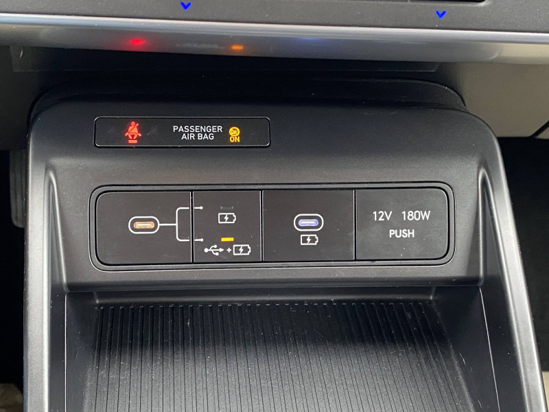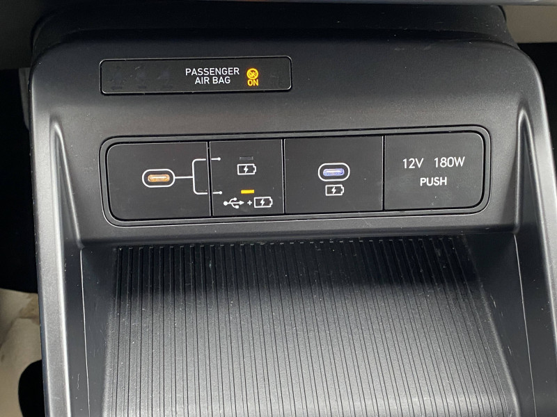 Climatisation automatique bi-zone avec fonction Driver Only et capteur de désembuage automatique du pare-brise / eCall : appel d'urgence automatique aux services de secours avec géolocalisation du véhicule / Système de navigation Europe avec programme de mise à jour à distance et services Hyundai Live / Verrouillage automatique des portes en roulant / 4 prises USB-C; un port de données et une prise de recharge AV, 2 prises de recharge AR / 7 Airbags: frontaux conducteur et passager, latéraux AV, rideaux AV/AR, central AV / Accoudoir AR avec porte-gobelets intégré / Alerte de présence de passager AR / Assistance active au maintien et au suivi de voie / Assistance active à la conduite sur autoroute / Caméra de recul avec lignes de guidage dynamiques / Console de rangement sous accoudoir AV / Drive Mode (Eco, Sport, Snow) / Détection de fatigue du conducteur / Feux de route intelligents / Filet de coffre / Frein de parking électrique avec fonction auto-hold / Freinage anti multi-collisions / Freinage d'urgence autonome avec reconnaissance véhicule, piéton, cycliste et fonction intersection / Freinage régénératif modulable via palettes au volant / Pare-brise avec film acoustique / Plancher de coffre modulable / Protections d'ailes noires / Reconnaissance des panneaux de limitation de vitesse avec limiteur de vitesse intelligent / Réception radio numérique terrestre (DAB) / Services connectés BlueLink avec carte SIM incluse / Système audio RDS, compatible MP3, 4HP et 2 tweeters / Système d'accès mains-libres et démarrage sans clé / Système ISOFIX pour siège enfant aux places latérales AR / Système multimédia avec écran couleur tactile 12,3" / Transmission à commande électrique / Vitres électriques AV/AR et séquentielle à l'AV