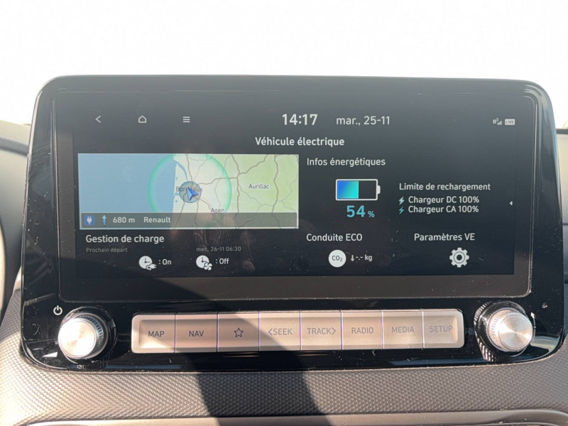 Alarme périmétrique / Alerte de circulation transversale AR / Antenne de toit type requin en effet verre / Câble de recharge pour prise domestique / Câble de recharge Type 2 / Caméra de recul avec lignes de guidage dynamiques / Capteur de désembuage automatique du pare-brise / Chargeur sans fil pour téléphone compatible / Compteurs digitaux 7" / Console de rangement sous accoudoir AV / Contrôle de trajectoire électronique ESP / Détection de fatigue du conducteur / Drive Mode Eco+ / Eco / Normal / Sport / eCall : appel d'urgence automatique aux services de secours avec géolocalisation du véhicule / Freinage d'urgence autonome avec détection des piétons / Freinage régénératif intelligent / Inserts décoratifs gris (contours des aérateurs et du bloc de levier de vitesses) / Intérieur Noir / Palettes de freinage régénératif modulable au volant / Prise auxiliaire et USB / Prise Combo Type 2 - 100 kW / Prise Type 2 - 7,2kW / Prise USB de recharge / Programmation de la recharge et de la ventilation / Rails de toit / Réception radio numérique terrestre (DAB) / Rétroviseur intérieur jour/nuit automatique / Services connectés BlueLink avec carte SIM incluse / Siège conducteur avec support lombaire électrique / Ski AR grain métal / Surveillance des angles morts avec assistance au changement de voie / Système audio premium Krell, 5 HP, 2 tweeters, subwoofer et amplificateur / Système d'accès mains-libres et démarrage sans clé / Système de chauffage de la batterie / Système de chauffage par pompe à chaleur / Système de navigation Europe avec programme de mise à jour de la cartographie et services TomTom Live / Système ISOFIX aux places latérales AR / Système multimédia avec écran couleur tactile 10.25" / Verrouillage automatique des portes en roulant / Vitre conducteur séquentielle