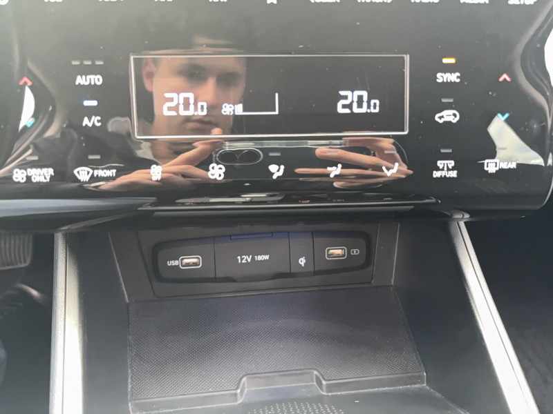 Alarme périmétrique / Alerte de circulation transversale AR avec fonction freinage / Antenne de toit type requin en effet verre / Assistance active au suivi de voie / Assistance à la sortie du véhicule / Câble de recharge pour prise domestique / Cache-bagages à enrouleur / Caméra de recul avec lignes de guidage dynamiques / Capteur de désembuage automatique du pare-brise / Chargeur sans fil pour téléphone compatible / Climatisation automatique bi-zone avec désembuage automatique (avec mode Multi-air AV) / Compteurs numériques 10,25" / Console centrale avec bac de rangement sous l'accoudoir AV / Contrôle de trajectoire électronique ESP avec gestion de stabilité pour remorque / Contrôle de vitesse en descente / Détection de fatigue du conducteur / Direction assistée électrique asservie à la vitesse / Dossier AR rabattable 40/20/40 à distance avec commande depuis le coffre / Drive Mode / eCall : appel d'urgence automatique aux services de secours avec géolocalisation du véhicule / Feux de route intelligents / Filet de coffre / Freinage anti multi-collisions / Freinage d'urgence autonome avec reconnaissance piétons et cyclistes / Frein de parking électrique avec fonction auto-hold / Poches aumonières au dos des sièges AV / Poignées de portes extérieures ton carroserie / Poignées de portes intérieures grain métal / Porte-gobelets AV/AR / Prises 12V (AV et coffre) et USB AV/AR / Prise Type 2 - 7,2kW / Programmation de la charge depuis le véhicule / Rails de toit / Réception radio numérique terrestre (DAB) / Rétroviseurs électriques dégivrants, rabattables électriquement avec clignotants intégrés / Rétroviseurs extérieurs ton carrosserie / Rétroviseurs intérieur jour/nuit automatique / Services connectés BlueLink avec carte SIM incluse / Siège conducteur avec support lombaire électrique / Sièges AR inclinables / Surveillance des angles morts avec assistance active au changement de voie / Système audio RDS, MP3, 4 HPs, 2 tweeters / Système de navigation Europe avec programme de mise à jour de la cartographie / Système ISOFIX pour siège enfant aux places latérales AR / Système multimédia avec écran couleur tactile 10,25" et reconnaissance vocale en ligne / Terrain Mode (Neige, Sable, Boue) / Transmission à commande électrique / Verrouillage automatique des portes en roulant / Verrouillage du câble pendant la charge / Vide-poches dans portes AV/AR / Vitres AV séquentielles