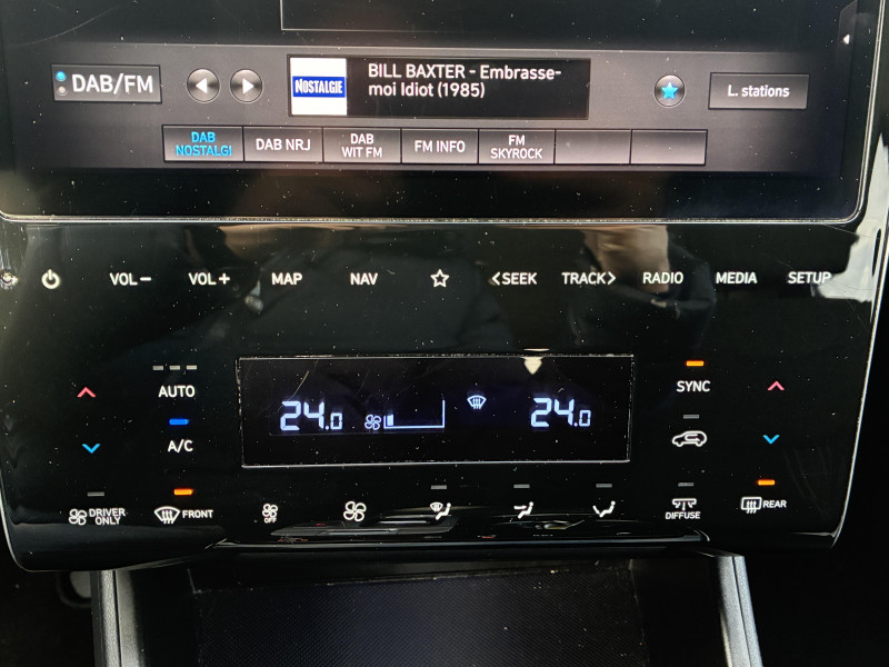 Capteur de désembuage automatique du pare-brise / Clignotants AV à LED / Climatisation automatique bi-zone avec désembuage automatique (avec mode Multi-air AV) / eCall : appel d'urgence automatique aux services de secours avec géolocalisation du véhicule / Eclairage d'ambiance intérieur à LED personnalisable / Feux AR à LED avec bandeau lumineux / Feux de jour et de position AV à LED à effet miroir / Rétroviseurs intérieur jour/nuit automatique / Système de navigation Europe avec programme de mise à jour de la cartographie / Verrouillage automatique des portes en roulant / Volant et pommeau de levier de vitesses gainés de cuir / Alarme périmétrique / Alerte de circulation transversale AR avec fonction freinage / Antenne de toit type requin en effet verre / Assistance active au suivi de voie / Assistance à la sortie du véhicule / Cache-bagages à enrouleur / Calandre chromée "Parametric Dynamics" / Caméra de recul avec lignes de guidage dynamiques / Chargeur sans fil pour téléphone compatible / Compteurs numériques 10,25" / Console centrale avec bac de rangement sous l'accoudoir AV / Contrôle de trajectoire électronique ESP avec gestion de stabilité pour remorque / Contrôle de vitesse en descente / Direction assistée électrique asservie à la vitesse / Dossier AR rabattable 40/20/40 à distance avec commande depuis le coffre / Double sortie d'échappement / Drive Mode / Détection de fatigue du conducteur / Eclairage additionnel en virage / Feux de route intelligents / Frein de parking électrique avec fonction auto-hold / Freinage anti multi-collisions / Freinage d'urgence autonome avec reconnaissance piétons et cyclistes / Jonc de vitres chromé / Pare-soleils intégrés dans les portes AR / Poches aumonières au dos des sièges AV / Poignées de portes extérieures ton carroserie / Poignées de portes intérieures grain métal / Porte-gobelets AV/AR / Prises 12V (AV et coffre) et USB AV/AR / Protections AV/AR grain métal / Protections de seuils de portes grain métal / Rails de toit / Réception radio numérique terrestre (DAB) / Rétroviseurs extérieurs ton carrosserie / Rétroviseurs électriques dégivrants, rabattables électriquement avec clignotants intégrés / Services connectés BlueLink avec carte SIM incluse / Siège conducteur avec support lombaire électrique / Sièges AR inclinables / Surveillance des angles morts avec assistance active au changement de voie / Système audio RDS, MP3, 4 HPs, 2 tweeters / Système d'accès mains-libres et démarrage sans clé / Système ISOFIX pour siège enfant aux places latérales AR / Système multimédia avec écran couleur tactile 10,25" et reconnaissance vocale en ligne / Transmission à commande électrique / Vide-poches dans portes AV/AR / Vitres AV/AR séquentielles