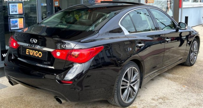 Infiniti Q50 2.0T 211ch PREMIUM EXECUTIVE BVA7 - ENTRETIEN COMPLET berline, noir, 12 cv, 4 portes, première mise en circulation le 25/09/2015, garantie 6 mois. - NOS SERVICES ET PRESTATIONS COMPLÉMENTAIRES - - Visite virtuelle : avant de vous déplacer, visualisez votre futur véhicule sous toutes ses coutures . Contactez-nous pour en voir plus ! - Extension de garantie jusqu'à 60 mois. - Solutions de Financement de 12 à 84 mois. - Livraison dans toute la France métropolitaine (sur devis). - Reprise possible de votre ancien véhicule. - Les informations délivrées par cette annonce sont non contractuelles et données à titre indicatif. Packs disponibles (véhicules éligibles au Label) - Pack Clés en Main - 691 € TTC(¹)(²) Démarches (hors carte grise) | 1/4 de carburant | Nettoyage First | Garantie 6 mois | Label inclus? - Pack Sérénité - 891 € TTC(¹)(²) Démarches (hors carte grise) | 1/2 de carburant | Nettoyage Confort | Garantie 12 mois | Label inclus? - Pack Prestige - 1.091 € TTC(¹)(²) Démarches (hors carte grise) | Plein complet | Nettoyage Prestige | Garantie 12 mois | Label inclus? + Surprise du chef - (¹) Les véhicules non éligibles au Label bénéficient de tarifs préférentiels. Veuillez contacter votre conseiller pour obtenir les conditions tarifaires applicables. (²) Tarif pour les véhicules deux roues motrices dont la valeur de vente est inférieure à 60 000 € TTC. - - Véhicule visible sur rendez vous - Nous vous accueillons dans notre agence au 84 Avenue Saint-Rémy, 57600 FORBACH - Prise en charge à la gare de Forbach - Lundi au Vendredi de 09h00 à 19h00 et le samedi de 09h00 à 16h30 - EWIGO FORBACH - forbach@ewigo com 5 places OPTIONS ET ÉQUIPEMENTS : Audio - Télécommunications : - GPS - commandes vocales - radio numérique - système de navigation Conduite : - Choix du mode de conduite - Essuies glaces automatiques - allumage automatique des feux - carte main libre - démarrage sans clé - détecteur de pluie - limiteur de vitesse - palettes au volant Couleur : - Peinture métallisée Extérieur : - Phares AR à led - Phares AV de jour à LED - Rétroviseurs latéraux électriques - Sortie d'échappement chromée - Echappement à double sortie - caméra de recul - jantes : aluminium - phares à LED - rétroviseurs rabattables - rétroviseurs électriques - système d'aide au stationnement - toit ouvrant - toit ouvrant électrique Intérieur : - Miroir de courtoisie chauffeur éclairé - Miroir de courtoisie passager éclairé - Siège conducteur à mémoire - Sièges AV électriques - Volant alu/cuir - Porte gobelet avant - accoudoir central - climatisation : automatique - climatisation multi zone - direction assistée - fermeture centralisée - non fumeur - ordinateur de bord - rétroviseur interieur electrochrome - sièges chauffants - verrouillage à distance - vitres électriques - volant réglable hauteur - volant réglable profondeur Pack : - Boîte de vitesse automatique - Mode sport - Pneus été - GPS couleur - détecteur de lumière - volant multifonctions - volant réglable - Écran multifonction Sellerie : - Sellerie semi-cuir Sécurité : - Airbags - ABS - ESP - airbags latéraux - anti-patinage - fixations ISOFIX - phares antibrouillard Autres équipements et informations : - Carnet d'entretien - Double des clés - Entretien constructeur - Factures d'entretien - Mode normal - Classe Crit'air : 1 - Puissance kilowatt : 155 kw - dimension des jantes : 19 pouces - nombre de rapports : 7 vitesses - puissance réelle : 211 ch - émission CO2 : 151 g/km - état : bon Référence annonce : d151472