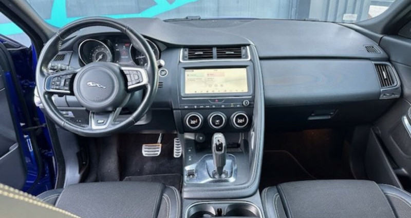 JAGUAR E-PACE 2.0D 180CH R-DYNAMIC AWD BVA9 9CV 180 ch, 9 CV, boite Automatique, 9 vit, 5 portes, 5 places, Couleur carrosserie : BLEU CAESIUM METAL. Caesium Blue, 6 Haut parleurs, ABS, Accoudoir central AV avec rangement, AFIL, Aide au démarrage en côte, Aide au freinage d'urgence, Airbag conducteur, Airbags latéraux avant, Airbags rideaux AV et AR, Alarme périmétrique, Alarme volumétrique, Antipatinage, Appel d'Urgence Localisé, Appui-tête conducteur réglable hauteur, Appui-tête passager réglable en hauteur, Arrêt et redémarrage auto. du moteur, Bacs de portes avant, Banquette 60/40, Banquette AR rabattable, Banquette arrière 3 places, BAS, Becquet arrière, Boite à gants fermée, Calandre chromée, Caméra de recul, Capteur de luminosité, Capteur de pluie, Clim automatique bi-zones, Commandes du système audio au volant, Commandes vocales, Compte tours, Contrôle de couple en courbe, Contrôle de freinage en courbe, Contrôle de Traction, Contrôle élect. de la pression des pneus, Démarrage sans clé, EBD, Echappement à double sortie, Eclairage d'ambiance, Ecran multifonction couleur, Ecran tactile, ESP, Feux arrière à LED, Feux de freinage d'urgence, Filets de coffre, Filtre à particules, Filtre à Pollen, Fixations Isofix aux places arrières, Fonction MP3 Garantie : 12 MOIS