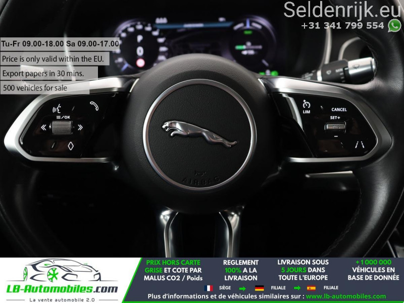 Référence : 1156674 Vos Avantages chez LB-AUTOMOBILES.com / Prix affiché TTC Livré hors carte grise / Livraison sous 10 jours dans toute la France hors 31 / Pas d?avance de frais paiement du véhicule 100% à la livraison par virement. Jaguar I-Pace Neuf remisée, Jaguar I-Pace Occasion Toulouse Beaupuy 31850, Jaguar I-Pace Véhicule sorti de réseau collaborateur, Jaguar I-Pace import, Jaguar I-Pace importateur, Jaguar I-Pace Livraison possible dans toute la France sous 5 jours, Jaguar I-Pace, Jaguar I-Pace Location Option Achat, Jaguar I-Pace LLD, Jaguar I-Pace Longue Durée, Jaguar I-Pace TVA récupérable. Possibilité d'extension de garantie 12, 24,36 mois, Pour tout autres voitures import neufs ou occasions collaborateur fortement remisée, Mandataire Audi, Mandataire BMW, Mandataire Volkswagen, Mandataire Mercedes, Mandataire Peugeot Espagne, Mandataire Renault Espagne, Porsche import, Mandataire Citroën Espagne, Mandataire Seat Espagne, n'hésitez pas à nous contacter. « Sous réserve de vente préalable et erreur de saisie » Principaux équipements : - 4x4 - ABS - Accoudoir - Android Auto - Antidémarrage - Apple CarPlay - Assistance de démarrage en côte - Avertisseur de franchissement de ligne - Bluetooth - Capteur de lumière - Capteur de pluie - Carnet d'entretien - Chauffage auxiliaire - Cockpit numérique - Commande vocale - Contrôle de la pression des pneus - Direction assistée - ESP - GPS - Hayon électrique - Jantes alliage - Phares LED - Radio DAB - Régulateur de vitesse - Rétroviseur extérieur électrique - Rétroviseur intérieur anti-éblouissement automatique - Sièges chauffants - Sièges sport - Système antipatinage - Système d'alarme - Système de détection de la fatigue - Système de reconnaissance des panneaux de signalisation - Système de sonorisation - Tuner/radio - Verrouillage centralisé sans clé - Vitres électriques - Volant en cuir - Volant multifonction
