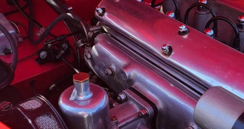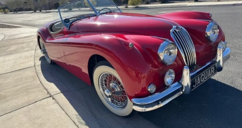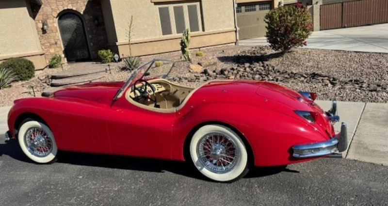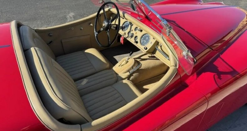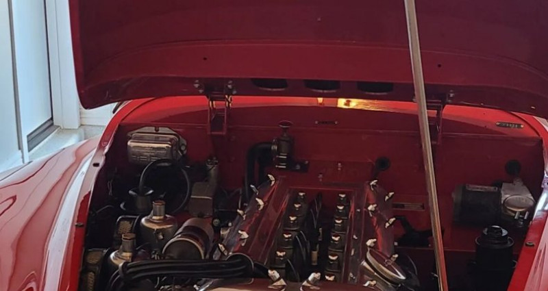 Ce 1955 Jaguar XK-140 OTS a fait partie de notre collection depuis plus de cinquante ans, à l'exception d'un court détour de 12 mois où il a été exposé au San Diego Automotive Museum. Il a remporté le titre de Meilleur Jaguar de Classe à la fois aux manifestations organisées par Jaguar Clubs of North America Inc. et Concours D'Elegance, ainsi qu'à des événements régionaux. Depuis sa rénovation, le véhicule a parcouru uniquement 618 miles. Il a toujours été conduit uniquement ou remorqué à des événements. Ce roadster de couleur rouge, d'une apparence captivante, a été soumis à une restauration intégrale du cadre pour revenir presque à son état d'origine. Le moteur est un 3.4 litre à six cylindres avec deux arbres à cames en tête, équipé d'une boîte de vitesses à quatre rapports, une direction à engrenage à l'aide de racks et de pinions. Le radiateur a été remplacé par un radiateur en alliage et ventilateur électrique. Le radiateur original est disponible. Les carburateurs ont été récemment remis à neuf, de nouveaux mousquetons d'allumage, batterie et pompe à essence électrique ont été installés. Le véhicule est équipé de cinq roues à six rayons, de pneumatiques de large bande blanche et de capote de toiture souple en toile marron. Les rideaux latéraux n'ont pas été restaurés. L'intérieur présente des coussinets de cuir marron et tapis marron.. Provenance : AZ, USA. Disponibilité : 7 semaines, clés en main. 77 500 € tout compris (import, taxes, procédure d'immatriculation). Annonce publiée le 17/11/2025