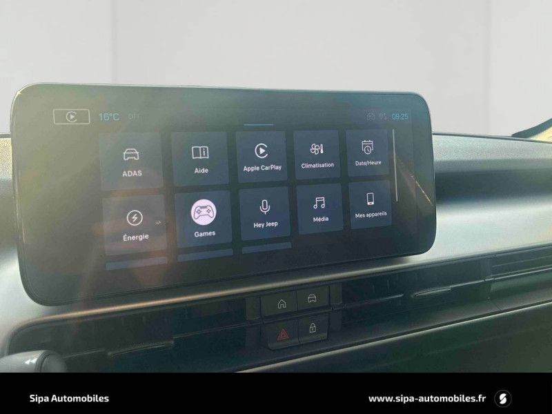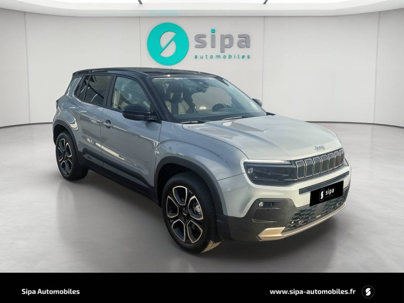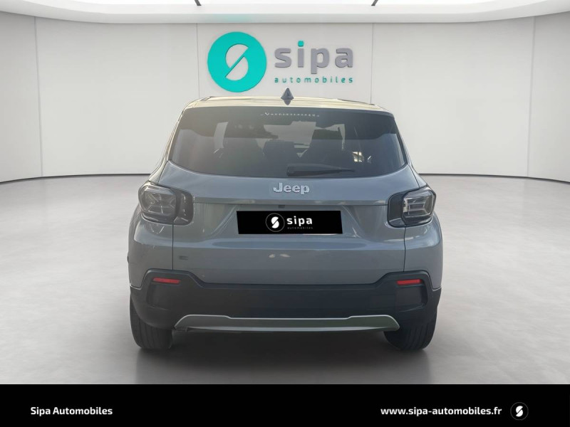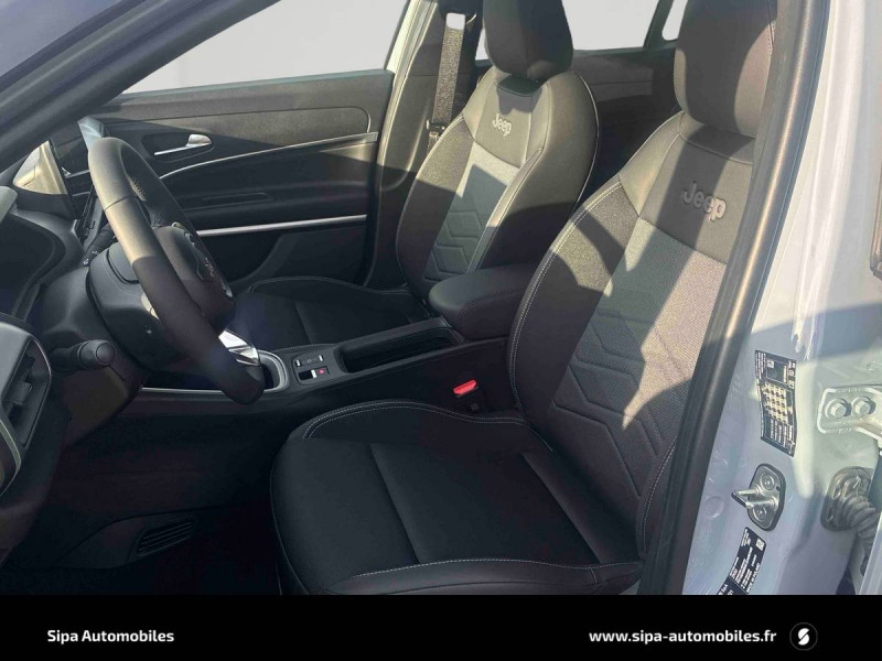 Aide à la descente (Hill Descent Control) / Airbags frontaux et latéraux conducteur et passager, airbags rideaux AV/AR / Assistance à la conduite semi-autonome / Boîte automate à fonction continue / Câble de recharge mode 3 / Calandre Gloss Black / Chargeur embarqué 11 kW triphasé avec prédisposition fonction V2L (Vehicle To Load) / Chargeur sans fil pour smartphone / Combiné d'instrumentation numérique 10,25'' / Commutation automatique feux de route/feux de croisement / Contrôle de la traction (TCS) / Eclairage d'ambiance multicolore à LED / Eclairage extérieur d'accueil et d'accompagnement / ESP - Système de régulation de comportement dynamique / Freinage autonome d'urgence avec détection piétons et cyclistes / Frein de stationnement électrique / Insert de planche de bord peint Gris Silver / Jantes alliage 18" - 215/55 R18 99 V / Plancher de coffre modulable et réversible / Poches aumônières au dos des sièges AV / Poignées de porte couleur carrosserie / Prise USB-C au 2e rang / Projecteurs antibrouillard à LED avec fonction cornering / Projecteurs Jeep Performance LED / Rétroviseur intérieur électrochrome sans contour / Révision touts 2 ans ou 25 000 km (1ère révision à 1 an ou 12 500 km) / Selec-Terrain : 6 modes de conduite Eco, Normal, Sport, Sable, Bouge, Neige / Sellerie mixte tissu / TEP / Services connectés Uconnect Services / Siège conducteur à réglages manuels 6 voies / Siège passager à réglages manuels 4 voies / Spots de lecture AV et AR à LED / Système multimédia àécran tactile Uconnect 10,25'' avec Apple Carplay, Android Auto sans fils / Tapis de sol AV et AR / Vitres AV et AR électriques et séquentielles / Volant en TEP