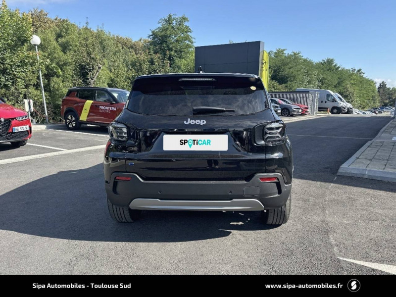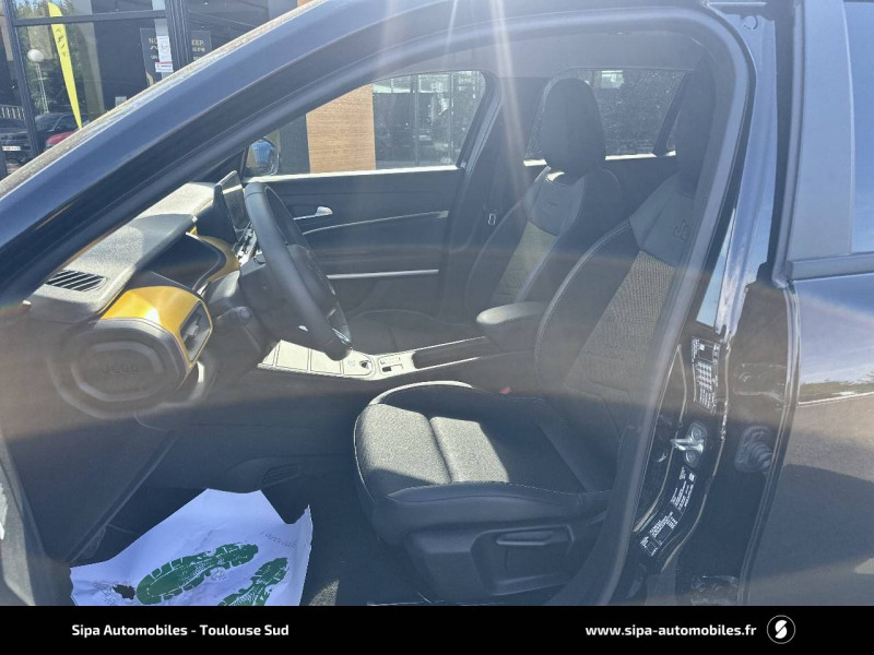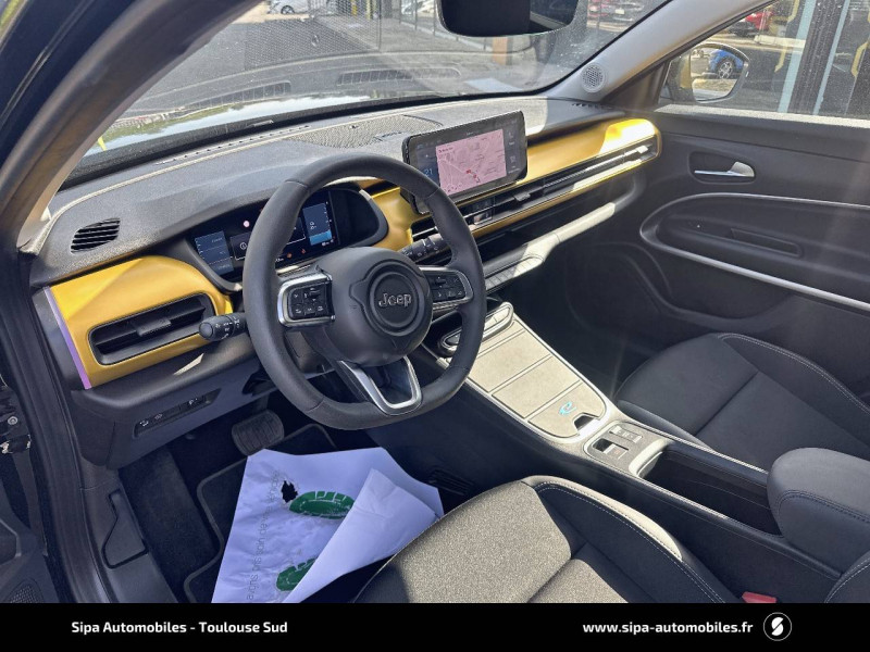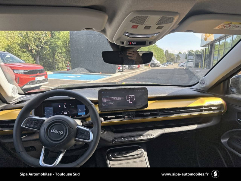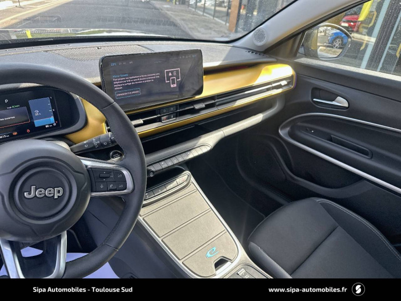 Aide à la descente (Hill Descent Control) / Airbags frontaux et latéraux conducteur et passager, airbags rideaux AV/AR / Assistance à la conduite semi-autonome / Câble de recharge mode 3 / Chargeur embarqué 11 kW triphasé / Chargeur sans fil pour smartphone / Combiné d'instrumentation numérique 10,25'' / Commutation automatique feux de route/feux de croisement / Dégivrage des essuie-glaces AV / Eclairage d'ambiance multicolore à LED / Eclairage extérieur d'accueil et d'accompagnement / Enter-N-Go : ouverture et démarrage sans clé / Freinage d'urgence (détection piétons et cyclistes) / Frein de stationnement électrique avec fonction Auto Hold / Kit de gonflage (Fix & Go) / Pack Rangement / Plancher de coffre modulable et réversible / Poches aumônières au dos des sièges AV / Poignée de maintien côté passager / Pompe à chaleur / Prises : 1 USB-A + 1 USB-C + 1 prise 12V à l'AV, 1 USB-C à l'AR / Projecteurs antibrouillard à LED avec fonction cornering / Projecteurs Jeep Performance LED / Rétroviseur intérieur électrochrome sans contour / Selec-Terrain : 6 modes de conduite / Sellerie mixte tissu / TEP / Services connectés Uconnect Services / Siège conducteur à réglages manuels 6 voies / Siège passager à réglages manuels 4 voies / Spots de lecture AV et AR à LED / Système audio 6 haut-parleurs 100 W / Système multimédia àécran tactile Uconnect 10,25'' avec Apple Carplay, Android Auto sans fils / Tapis de sol AV et AR / Toit noir Volcano / Vitres AV et AR électriques et séquentielles / Volant et pommeau de levier de vitesses en TEP