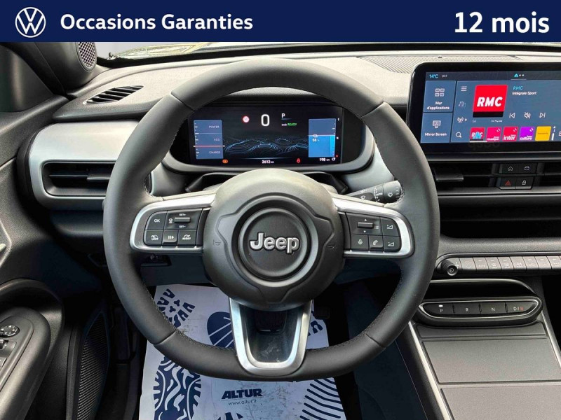 Aide à la descente (Hill Descent Control) / Airbags frontaux et latéraux conducteur et passager, airbags rideaux AV/AR / Boîte automate à fonction continue / Câble de recharge mode 3 / Chargeur embarqué 11 kW triphasé avec prédisposition fonction V2L (Vehicle To Load) / Combiné d'instrumentation numérique 10,25'' / Commutation automatique feux de route/feux de croisement / Contrôle de la traction (TCS) / ESP - Système de régulation de comportement dynamique / Freinage autonome d'urgence avec détection piétons et cyclistes / Frein de stationnement électrique / Insert de planche de bord peint Gris Silver / Jantes alliage 17" Silver Gloss - 215/60 R17 96 H / Phares LED avec feux AR halogènes / Plancher de coffre modulable et réversible / Poches aumônières au dos des sièges AV / Poignées de porte couleur carrosserie / Prise USB-C au 2e rang / Projecteurs antibrouillard à LED avec fonction cornering / Rétroviseur intérieur électrochrome sans contour / Révision touts 2 ans ou 25 000 km (1ère révision à 1 an ou 12 500 km) / Selec-Terrain : 6 modes de conduite Eco, Normal, Sport, Sable, Bouge, Neige / Sellerie mixte tissu / TEP / Services connectés Uconnect Services / Siège conducteur à réglages manuels 6 voies / Siège passager à réglages manuels 4 voies / Système multimédia àécran tactile Uconnect 10,25'' avec Apple Carplay, Android Auto sans fils / Vitres AV et AR électriques et séquentielles / Volant en TEP