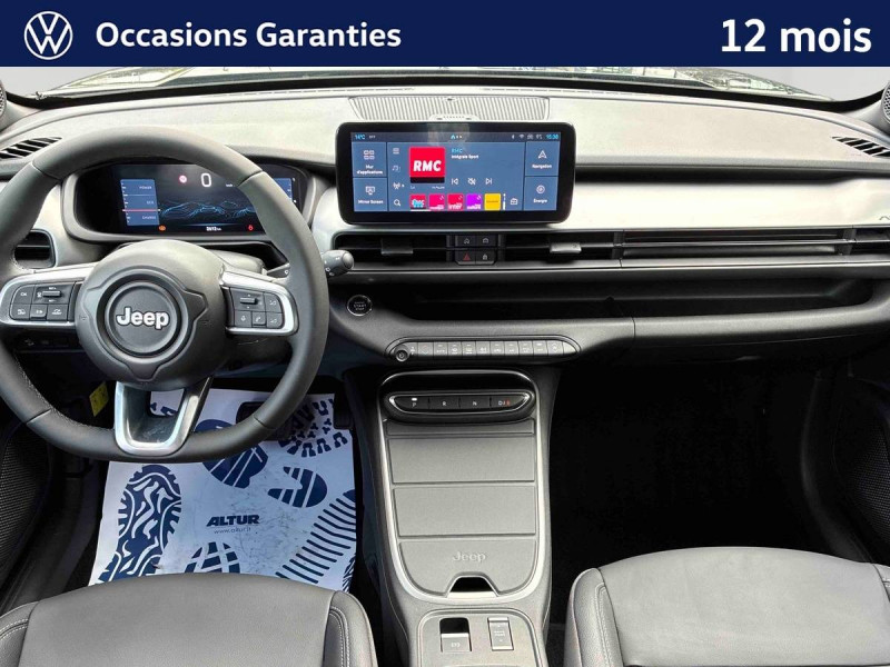 Aide à la descente (Hill Descent Control) / Airbags frontaux et latéraux conducteur et passager, airbags rideaux AV/AR / Boîte automate à fonction continue / Câble de recharge mode 3 / Chargeur embarqué 11 kW triphasé avec prédisposition fonction V2L (Vehicle To Load) / Combiné d'instrumentation numérique 10,25'' / Commutation automatique feux de route/feux de croisement / Contrôle de la traction (TCS) / ESP - Système de régulation de comportement dynamique / Freinage autonome d'urgence avec détection piétons et cyclistes / Frein de stationnement électrique / Insert de planche de bord peint Gris Silver / Jantes alliage 17" Silver Gloss - 215/60 R17 96 H / Phares LED avec feux AR halogènes / Plancher de coffre modulable et réversible / Poches aumônières au dos des sièges AV / Poignées de porte couleur carrosserie / Prise USB-C au 2e rang / Projecteurs antibrouillard à LED avec fonction cornering / Rétroviseur intérieur électrochrome sans contour / Révision touts 2 ans ou 25 000 km (1ère révision à 1 an ou 12 500 km) / Selec-Terrain : 6 modes de conduite Eco, Normal, Sport, Sable, Bouge, Neige / Sellerie mixte tissu / TEP / Services connectés Uconnect Services / Siège conducteur à réglages manuels 6 voies / Siège passager à réglages manuels 4 voies / Système multimédia àécran tactile Uconnect 10,25'' avec Apple Carplay, Android Auto sans fils / Vitres AV et AR électriques et séquentielles / Volant en TEP