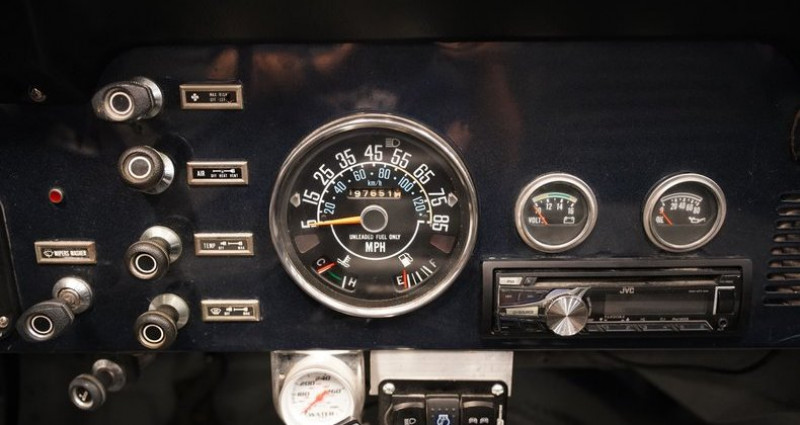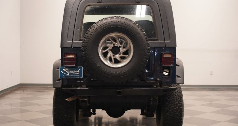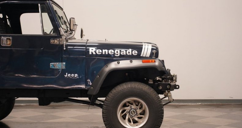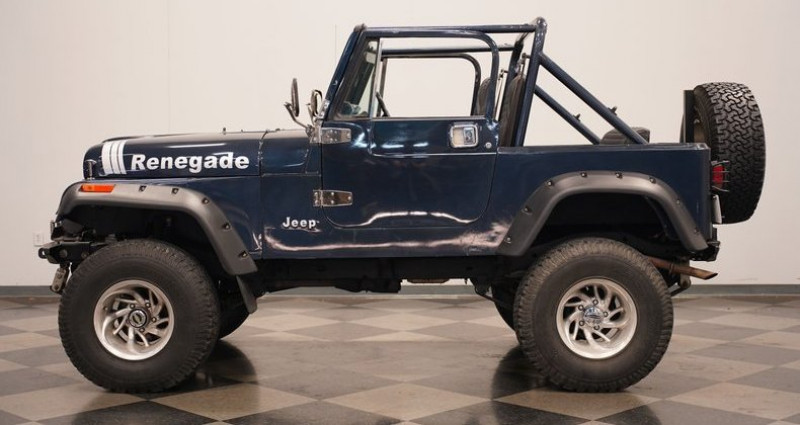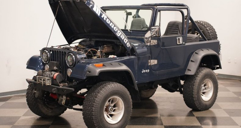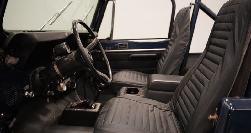 1985 Jeep CJ7, Navy Blue Metallic paint, Renegade decals, 15 alloy wheels, 33x12.50R15LT all-terrain tires, hard top, bikini top, silver stripes, 3-inch lift kit, chrome accents, black vinyl seats, garnet vinyl denim bucket covers, floor-mounted shifter, central console, door panels, AM/FM single CD player with USB and AUX inputs, 4.2L Inline 6 engine, 3-speed automatic transmission, Howell Engine Developments modification, single barrel carburetor, upgraded distributor, Xcelerator Muffler, power disc brakes at front, LED headlights, tow hitch receiver, power steering.. Provenance : , USA. Disponibilité : environ 7 semaines, clés en main. 26 500 € tout compris (import, taxes, procédure d'immatriculation). Annonce publiée le 29/11/2025