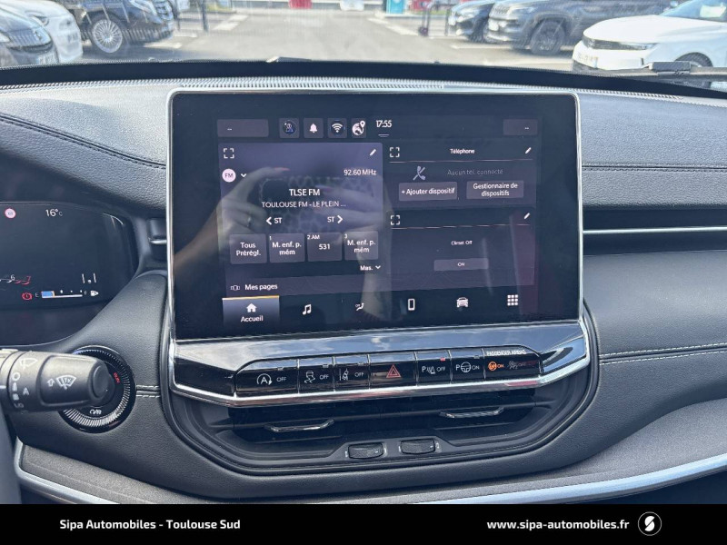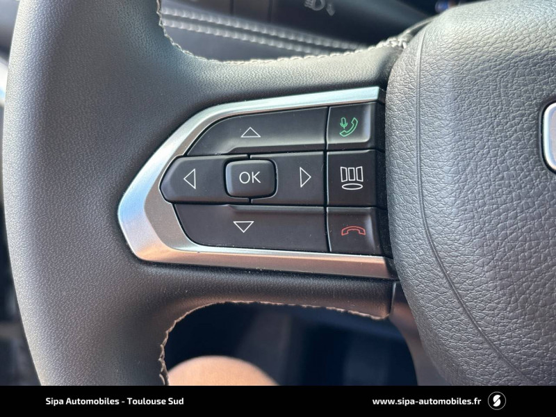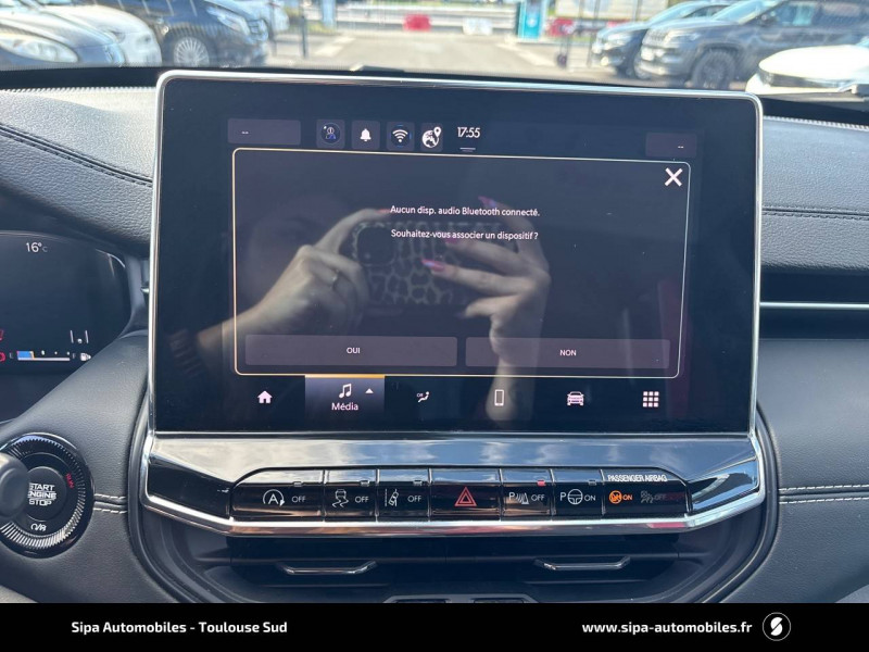 Aide au stationnement AR "Park Sense" / Airbags frontaux, latéraux de type rideau avec airbag passager neutralisable / Alarme périmétrique / Barres de toit longitudinales / Caméra de recul Parkview avec affichage dynamique / Capteur de luminosité (allumage des feux automatique) / Chargeur sans-fil pour smartphone / Combiné d'instrumentation numérique configurable àécran TFT de 10,25" / Enter-N-Go : système d'ouverture et de démarrage sans clé / Feux LED avec signature spécifique / Freinage autonome d'urgence avec détection piétons et cyclistes / Frein de stationnement électrique avec aide au démarrage en côte / Jantes 18" en alliage 225/55 R18, Pneumatiques 3 saisons / Jeep Wave - programme de fidelité premium avec 2 ans d'entretien / Prise 12V à l'AR et dans le coffre / Projecteurs AR à Signature LED / Rétroviseur intérieur photochromique / Sellerie mixte tissu/TEP / Siège conducteur et passager à réglage manuel 6 positions / Siège conducteur réglage lombaire électrique / Siège passager AV, rabattable à plat / Smartbeam : commutation automatique feux de route/feux de croisement / Système anticollision actif / Système anti-louveoiment en conditions de tractage / Système d'avertissement de franchissement de ligne avec correction / Système d'infodivertissement àécran tactile 10,1" / Système préventif anti retournement (ERM) / Tapis de sol / Uconnect Service