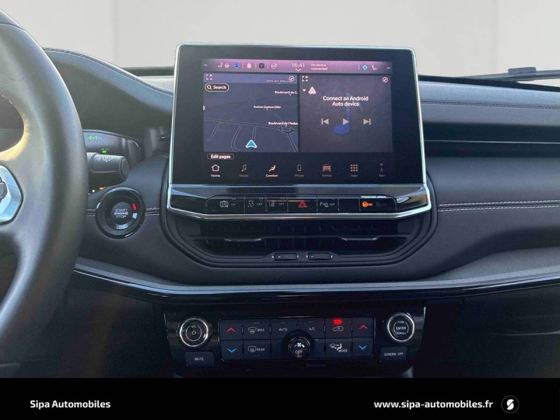Aide au stationnement AR "Park Sense" / Airbags frontaux, latéraux de type rideau avec airbag passager neutralisable / Alarme périmétrique / Allumage des feux automatique (capteur de luminosité) / Barres de toit longitudinales / Bas de caisse Gloss Black / Câble type 2 mode 2 - recharge domestique (8 A / 1,8 kW) / Caméra de recul Parkview avec affichage dynamique / Chargeur sans-fil pour smartphone / Combiné d'instrumentation numérique configurable àécran TFT de 10,25" / Enter-N-Go : système d'ouverture et de démarrage sans clé / Feux LED avec signature spécifique / Freinage autonome d'urgence avec détection piétons et cyclistes / Frein de stationnement électrique avec aide au démarrage en côte / Jantes en alliage Gloss Black 19" 235/45 R19 Pneumatiques 3 saisons / Jeep Wave - programme de fidelité premium avec 2 ans d'entretien / Navigation GPS avec informations sur les panneaux de signalisation / Prise 12V à l'AR et dans le coffre / Prises USB type A et C / Projecteurs AR à Signature LED / Rétroviseur intérieur photochromique / Services connectés Uconnect Services / Siège conducteur et passager à réglage manuel 6 positions / Siège conducteur réglage lombaire électrique / Siège passager rabattable à plat / Smartbeam : Commutation feux de route / feux de croisement automatique / Système anticollision actif / Système anti-louvoiement en conditions de tractage / Système d'avertissement de franchissement de ligne avec correction / Système d'infodivertissement "UConnect 5" àécran tactile 10,1" / Système préventif anti retournement (ERM) / Tapis de sol / Toit noir / Transmission intégrale eAWD avec Selec-Terrain avec modes Auto, Sable/Boue, Neige, Sport