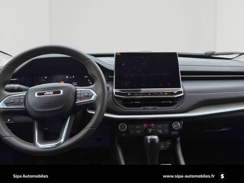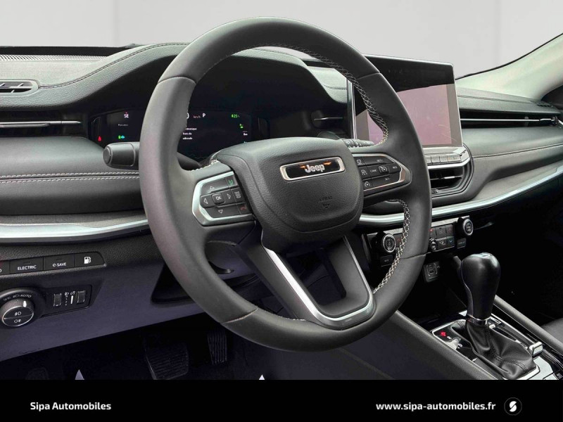 Airbags frontaux, latéraux de type rideau avec airbag passager neutralisable / Alarme périmétrique / Barres de toit longitudinales / Câble type 2 mode 2 - recharge domestique / Caméra de recul Parkview avec affichage dynamique / Capteur de luminosité (allumage des feux automatique) / Chargeur sans-fil pour smartphone / Climatisation automatique bi-zone avec pré-conditionnement et aérateurs aux places AR / Combiné d'instrumentation numérique configurable àécran TFT de 10,25" / e-Coasting: simule du frein moteur en récupérant de l'énergie / Enter-N-Go : système d'ouverture et de démarrage sans clé / Feux LED avec signature spécifique / Freinage autonome d'urgence avec détection piétons et cyclistes / Frein de stationnement électrique avec aide au démarrage en côte / Jantes alliage 18" 235/55/R18 pneumatiques 3 saisons / Jeep Wave - programme de fidelité premium avec 2 ans d'entretien / Modes EV : Hybride, Électrique, eSave / Prise 230 V, prise USB type A et C / Prises 12V : coffre et accoudoir central / Projecteurs AR à Signature LED / Rétroviseur intérieur photochromique / Sellerie mixte tissu/TEP / Siège conducteur et passager à réglage manuel 6 positions / Siège conducteur réglage lombaire électrique / Siège passager rabattable à plat / Smartbeam : Commutation feux de route / feux de croisement automatique / Sortie d'échappement chromée / Système anticollision actif / Système anti-louvoiement en conditions de tractage / Système d'aide à la descente (Hill Descent Control) / Système d'avertissement de franchissement de ligne avec correction / Système d'infodivertissement "UConnect 5" àécran tactile 10,1" / Système préventif anti retournement (ERM) / Tapis de sol / Transmission intégrale eAWD avec Selec-Terrain et mode Sport / Trappe de carburant à verrouillage électrique / Uconnect Services avec fonctionnalités hybrides rechargeables dédiées
