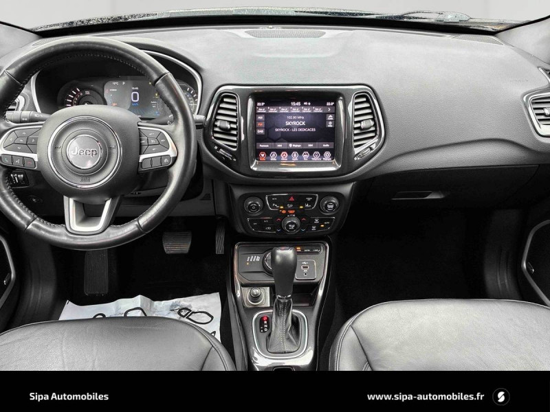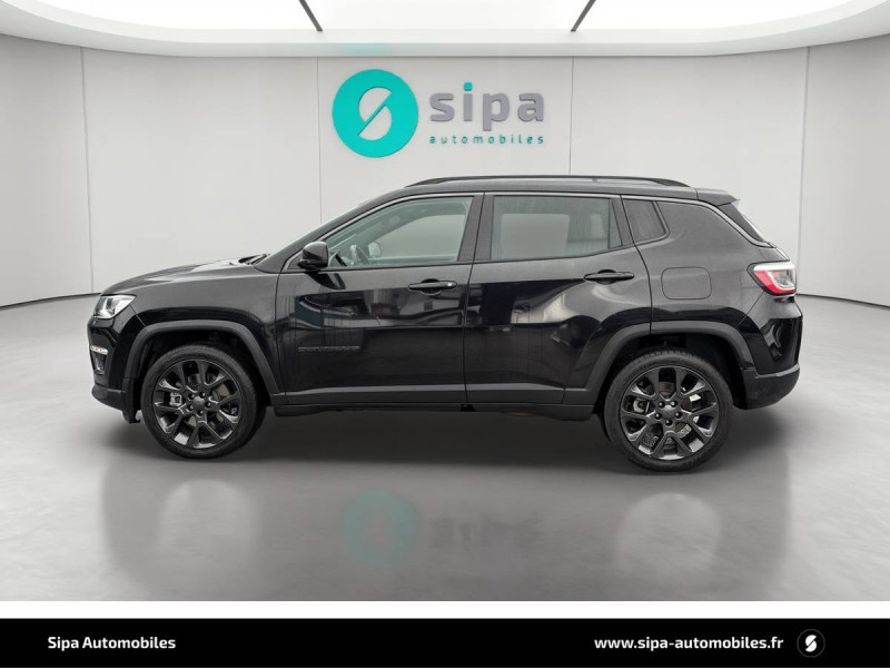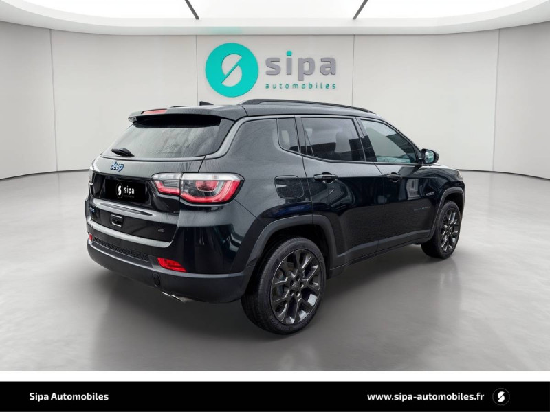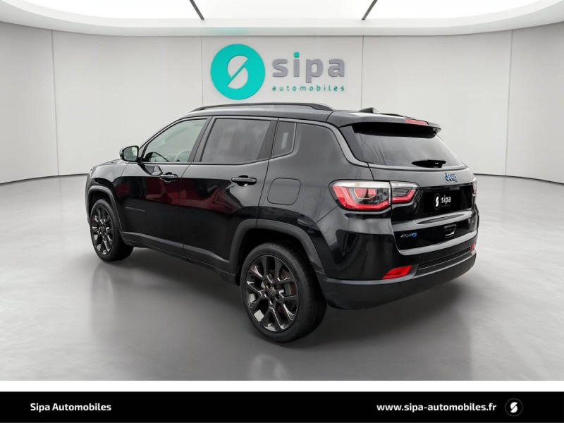 Alarme volumétrique / Appuis-tête AV actifs système de protection contre le coup du lapin / Avertisseur de baisse de pression des pneus / Banquette AR 40/20/40 / Câble type 2 - recharge domestique / Calandre noir avec cerclages d'ouïes Granite Crystal / Caméra de recul Parkview avec affichage dynamique / Capteur de luminosité (Allumage des feux automatique) / Eclairage de courtoisie dans les rétroviseurs extérieurs / e-Coasting: simule du frein moteur en récupérant de l'énergie / Enter-N-Go : système d'ouverture et de démarrage sans clé / Finitions extérieures Granite Crystal / Frein de stationnement électrique avec aide au démarrage en côte / Jantes alliage 19" Granite Crystal, Pneumatiques 3 saisons 235/45 R19 / Kit de gonflage (Fix & Go) avec notice en français / Logo Jeep, Compass et S Granite Crystal / Modes EV : Hybride, Électrique, eSave / Module de connectique : Prise jack, Port USB et lecteur de carte SD / Ordinateur de bord àécran 7'' TFT couleur / Pare-soleil coulissant avec mirroirs de courtoisie éclairé / Prise 230 V à l' AR / Projecteurs antibrouillard AV avec éclairage d'intersection / Projecteurs AR à Signature LED / Projecteurs AV avec Signature à LED et cerclage chromé / Régulateur et limiteur de vitesse électronique / Services Uconnect avec fonctionalités hybrides rechargeables dédiées / Siège passager avec réglage lombaire électrique / Sortie d'échappement chromée / Système anticollision actif / Système anti-louvoiement en conditions de tractage / Système anti-patinage des 4 roues par action sur les freins / Système audio Premium Alpine 9 HP / 506 W / Système d'aide à la descente / Système de détection de présence AR / Système de navigation GPS Uconnect 3D avec écran tactile 8,4" / Système Park Assist : Assistance au stationnement parallèle/perpendiculaire semi-automatique avec assistance à la sortie / Système préventif anti retournement (ERM) / Toit noir / Toit ouvrant panoramique CommandView / Transmission intégrale eAWD avec Selec-Terrain et mode Sport / Trappe de carburant à verrouillage électrique