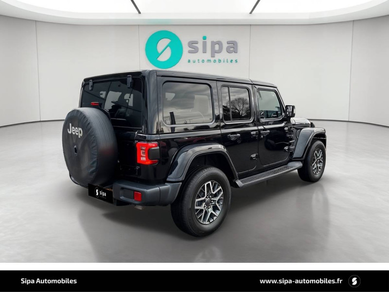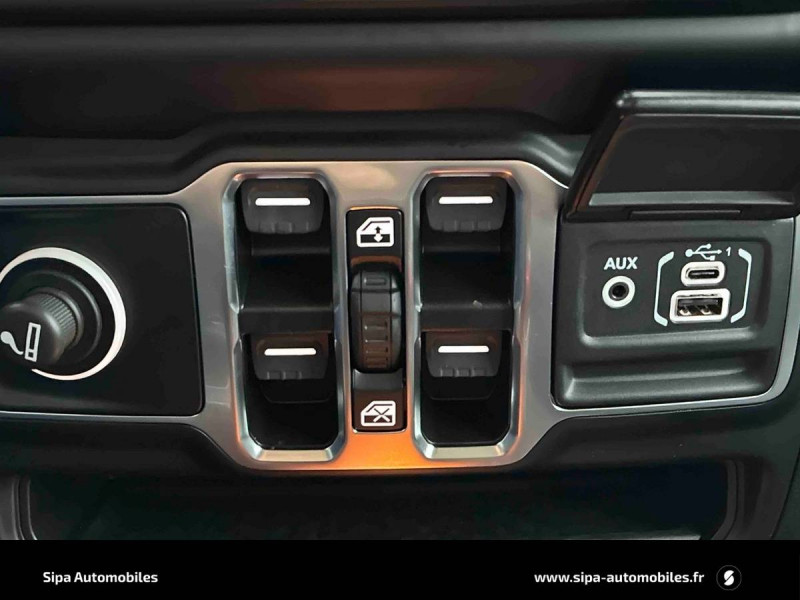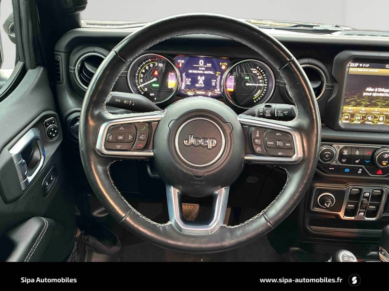 Câble type 2 mode 2 : recharge domestique (8 A / 1,8 kW) / Calandre couleur carrosserie / Commutateur feux de croisement / feux de route automatique / Couvre roue de secours rigide / Crochets de remorquage bleus / Détecteur d'angle mort et de présence AR / Elargisseurs d'ailes couleur carrosserie / ESP - Système de régulation de comportement dynamique / Finitions extérieures couleur Bright Accent (calandre, coques de retroviseurs) / Hard top modulaire Freedom Top couleur carroserie (3 pièces) / Jantes alliage 18", 255/70 R18 T (M+S) et Pneus Bridgestone Dueler HT 685 / Jeep Wave : 2 ans d'entretien programmé offerts / Kit fumeur / Marche-pieds / Pack Sécurité / Pare-soleil avec miroir éclairé / Porte-gobelets rétroéclairés / Prise auxiliaire 12v AV+AR / Rétroviseur intérieur photochromatique / Rétroviseurs avec réglage électrique et fonction dégivrage / Revêtement intérieur insonorisant sur le Hard top / Siège conducteur réglable 6 points + lombaire 2 points / Siège passager réglable 4 points / Système audio Premium Alpine 8,4''+8 HP+Subwoofer / Système de navigation àécran tactile Uconnect 8,4''avec Apple CarPlay et Android Auto / Tapis de sol et de coffre / Transmission intégrale Command Select-Trac Time 2.72:1