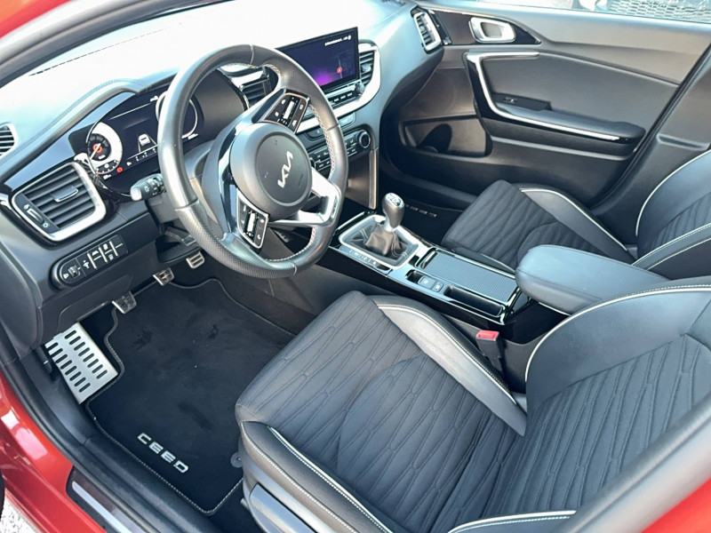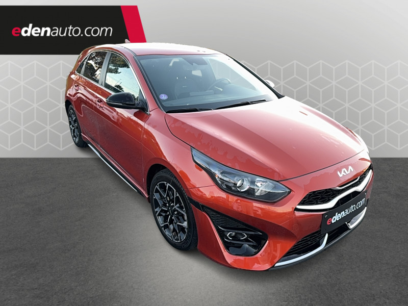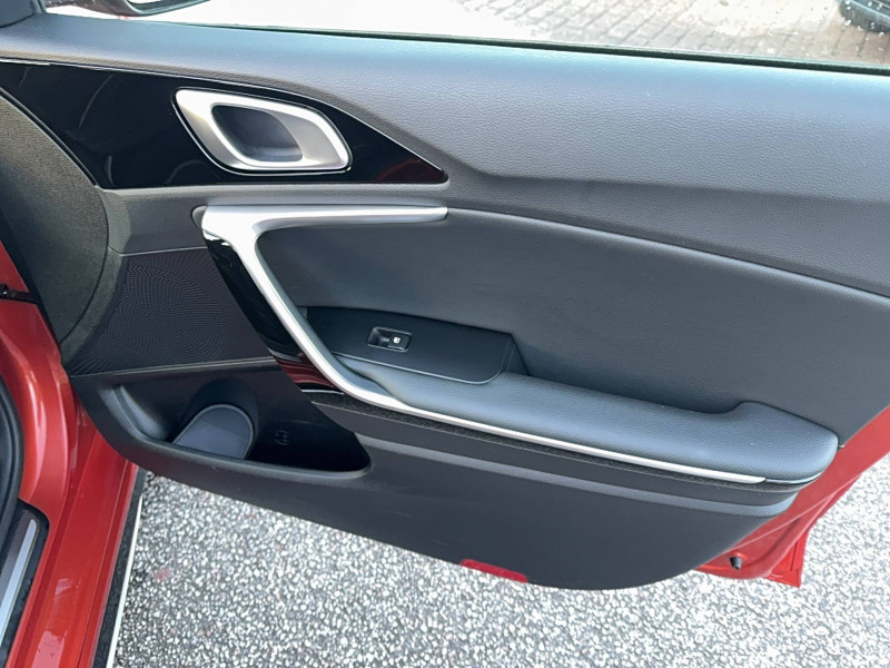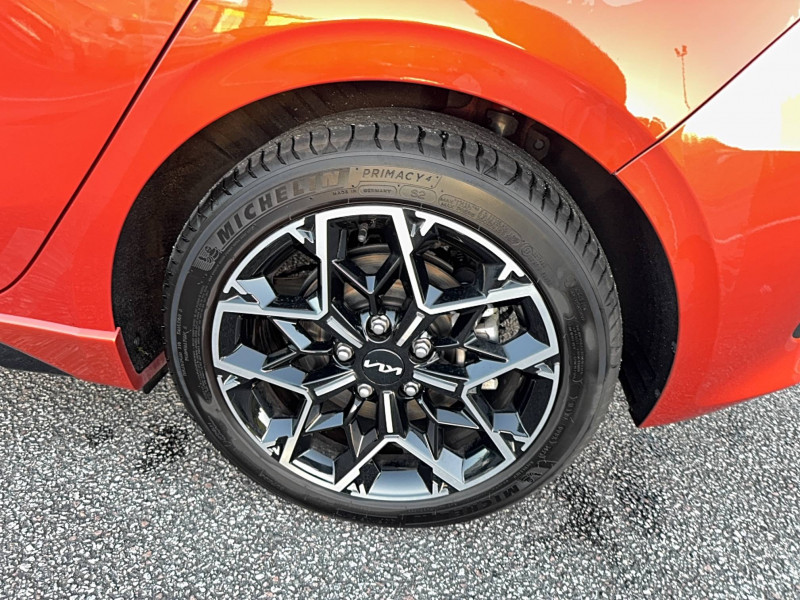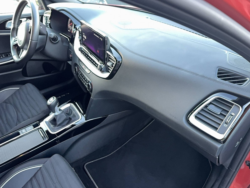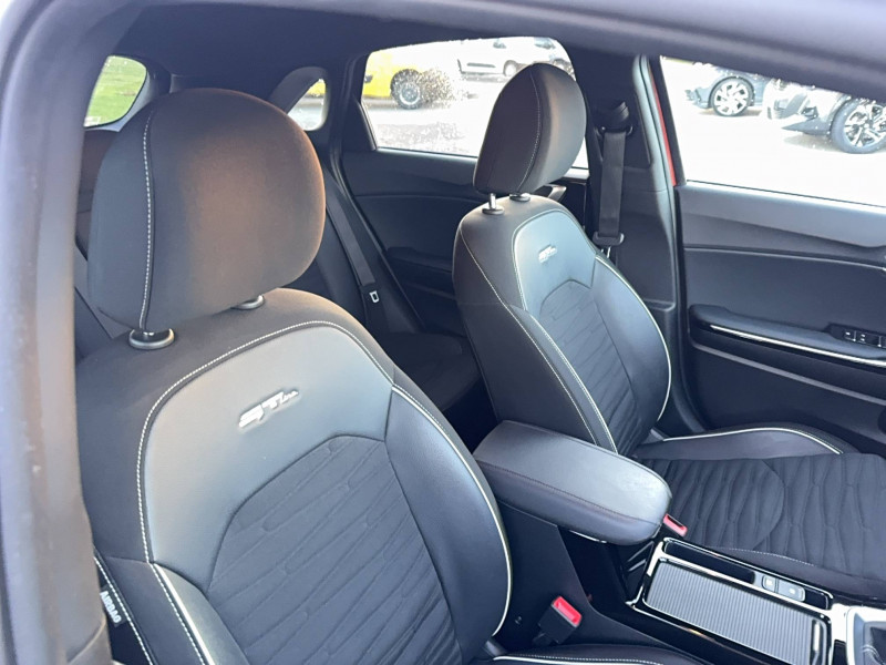 ABS avec répartiteur électronique de freinage (EBD) / Accoudoir central AR avec porte-gobelets intégrés / Accoudoir central AV coulissant avec compartiment de rangement / Aide au maintien dans la file (LKA) / Alerte de vigilance du conducteur (DAW) / Allumage automatique des projecteurs en fonction de la luminosité / Appuis-tête AV et AR réglables en hauteur et en inclinaison (à l'AV uniquement) / Assistance active à la conduite dans les embouteillages (LFA) / Bacs de rangement dans les contre-portes AV et AR / Becquet AR avec troisième feu stop LED intégré / Boucliers AV/AR / Caméra de recul avec lignes de guidage dynamiques, avec fonction switch On/Off / Combiné d'instrumentation 100 % digital 12.3'' / Compartiment range-lunettes / Connectique audio USB / Contour de calandre aspect chrome satiné et application noir laqué sur grille de calandre / Coques de rétroviseurs couleur noir laqué / Direction à assistance électrique asservie à la vitesse / Eclairage dans le coffre / Ecran tactile couleur 10,25'', système de navigation avec cartographie Europe et services connectés Kia Connect Live offerts pendant 7 ans, compatibilité via câble USB Android Auto et Apple CarPlay / Extracteurs d'air pour les places AR / Feux AR à LED en forme de nid d'abeille / Inserts noir laqué au niveau de la console centrale et des ouïes d'aération du tableau de bord / Jupes latérales spécifiques GT Line / Kit de dépannage en cas de crevaison / Lève-vitres AV et AR électriques, séquentiels et anti-pincement / Ligne de vitre chromée / Moulures de bas de portes avec insert gris / Ouverture et démarrage sans clé "Smart Key" avec capteur de mouvement / Pare-soleil avec miroir de courtoisie illuminé (conducteur et passager) / Pédalier et repose-pieds aspect aluminium / Poches aumonières au dos des sièges AV / Poignées de portes intérieures finition chrome satiné / Prise 12 V dans le coffre / Prise 12 V sur la partie inférieure de la planche de bord / Prise USB à charge rapide à l'AR / Prise USB à charge rapide sur la partie inférieure de la planche de bord / Projecteurs AV à technologie dite de "projection" / Rétroviseur intérieur électrochrome / Sellerie cuir de synthèse/tissu noir / Sièges AV à réglage lombaire électrique / Spots de lecture AV et AR / Système de fixation ISOFIX sur sièges AR latéraux / Système de freinage d'urgence autonome avec détection des cyclistes (FCA) / Système de freinage d'urgence autonome avec détection des voitures et des piétons (FCA) / Système de gestion intelligente des feux de route (HBA) / Système de téléphonie mains-libres Bluetooth avec reconnaissance vocale, mode personnalisé et fonction streaming audio / Système Kia Connect - services télématiques offerts pendant 7 ans / Témoin de niveau bas du liquide de lave-glace / Verrouillage automatique des portières en roulant / Volant et pommeau de levier de vitesses gainés cuir