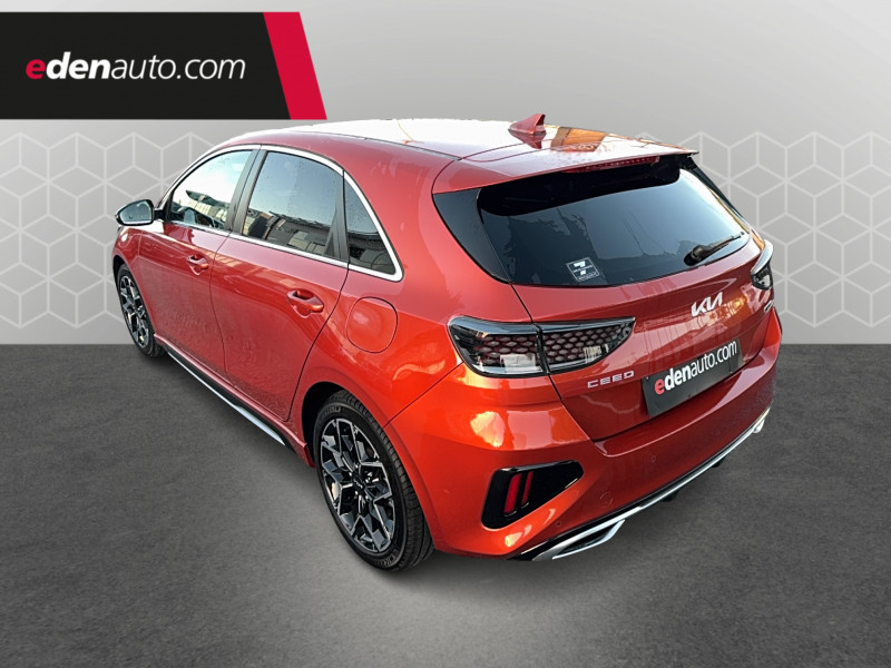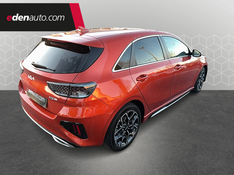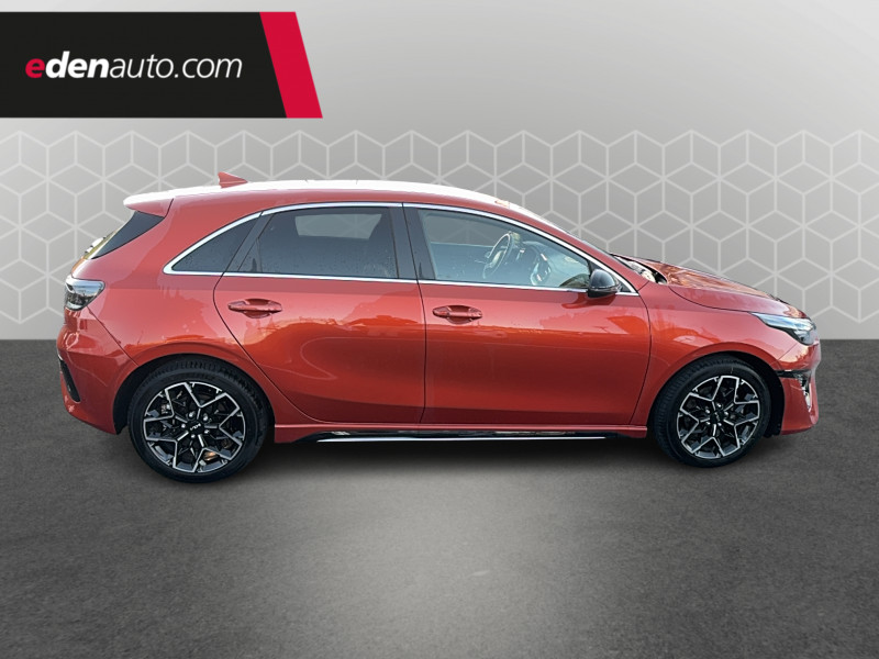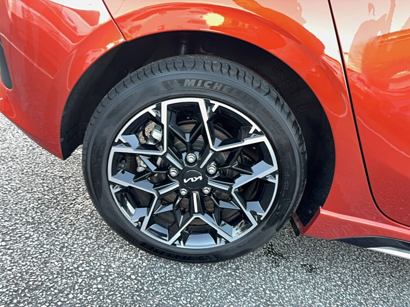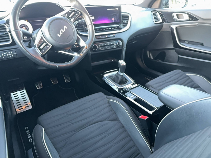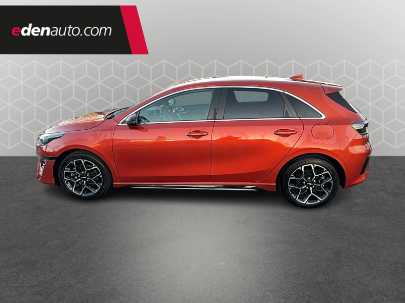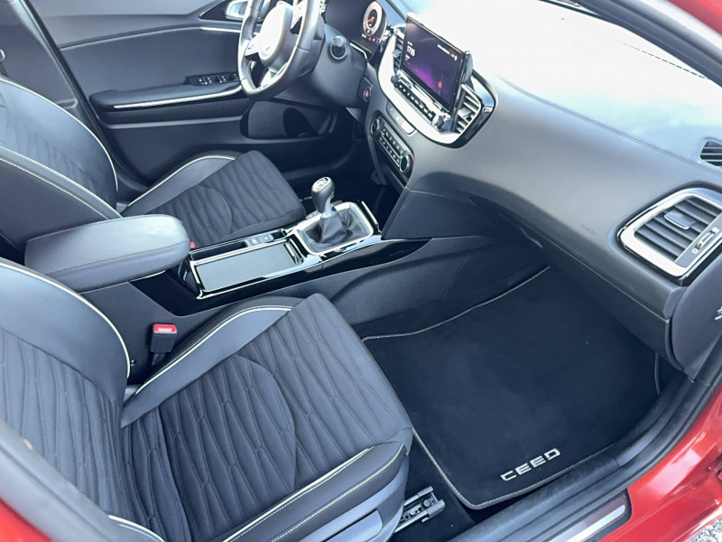 ABS avec répartiteur électronique de freinage (EBD) / Accoudoir central AR avec porte-gobelets intégrés / Accoudoir central AV coulissant avec compartiment de rangement / Aide au maintien dans la file (LKA) / Alerte de vigilance du conducteur (DAW) / Allumage automatique des projecteurs en fonction de la luminosité / Appuis-tête AV et AR réglables en hauteur et en inclinaison (à l'AV uniquement) / Assistance active à la conduite dans les embouteillages (LFA) / Bacs de rangement dans les contre-portes AV et AR / Becquet AR avec troisième feu stop LED intégré / Boucliers AV/AR / Caméra de recul avec lignes de guidage dynamiques, avec fonction switch On/Off / Combiné d'instrumentation 100 % digital 12.3'' / Compartiment range-lunettes / Connectique audio USB / Contour de calandre aspect chrome satiné et application noir laqué sur grille de calandre / Coques de rétroviseurs couleur noir laqué / Direction à assistance électrique asservie à la vitesse / Eclairage dans le coffre / Ecran tactile couleur 10,25'', système de navigation avec cartographie Europe et services connectés Kia Connect Live offerts pendant 7 ans, compatibilité via câble USB Android Auto et Apple CarPlay / Extracteurs d'air pour les places AR / Feux AR à LED en forme de nid d'abeille / Inserts noir laqué au niveau de la console centrale et des ouïes d'aération du tableau de bord / Jupes latérales spécifiques GT Line / Kit de dépannage en cas de crevaison / Lève-vitres AV et AR électriques, séquentiels et anti-pincement / Ligne de vitre chromée / Moulures de bas de portes avec insert gris / Ouverture et démarrage sans clé "Smart Key" avec capteur de mouvement / Pare-soleil avec miroir de courtoisie illuminé (conducteur et passager) / Pédalier et repose-pieds aspect aluminium / Poches aumonières au dos des sièges AV / Poignées de portes intérieures finition chrome satiné / Prise 12 V dans le coffre / Prise 12 V sur la partie inférieure de la planche de bord / Prise USB à charge rapide à l'AR / Prise USB à charge rapide sur la partie inférieure de la planche de bord / Projecteurs AV à technologie dite de "projection" / Rétroviseur intérieur électrochrome / Sellerie cuir de synthèse/tissu noir / Sièges AV à réglage lombaire électrique / Spots de lecture AV et AR / Système de fixation ISOFIX sur sièges AR latéraux / Système de freinage d'urgence autonome avec détection des cyclistes (FCA) / Système de freinage d'urgence autonome avec détection des voitures et des piétons (FCA) / Système de gestion intelligente des feux de route (HBA) / Système de téléphonie mains-libres Bluetooth avec reconnaissance vocale, mode personnalisé et fonction streaming audio / Système Kia Connect - services télématiques offerts pendant 7 ans / Témoin de niveau bas du liquide de lave-glace / Verrouillage automatique des portières en roulant / Volant et pommeau de levier de vitesses gainés cuir
