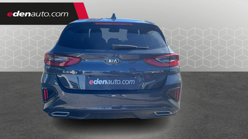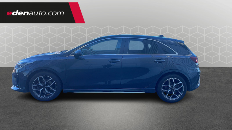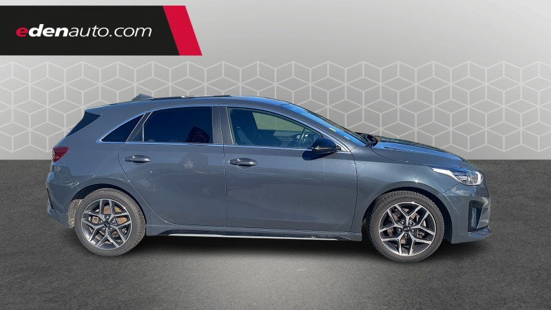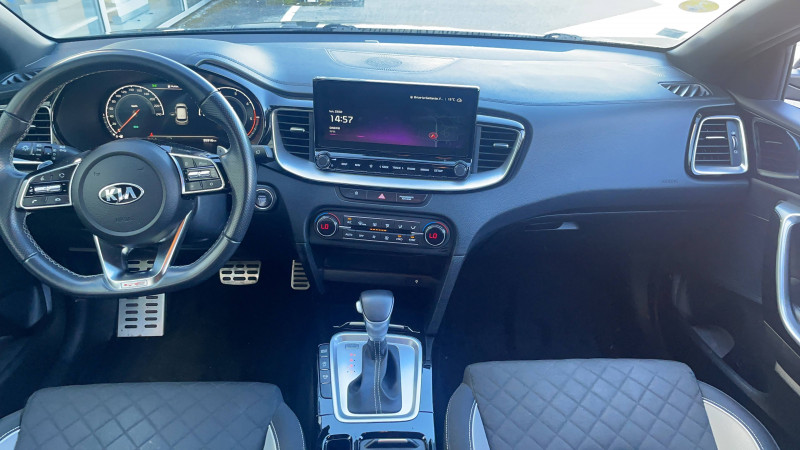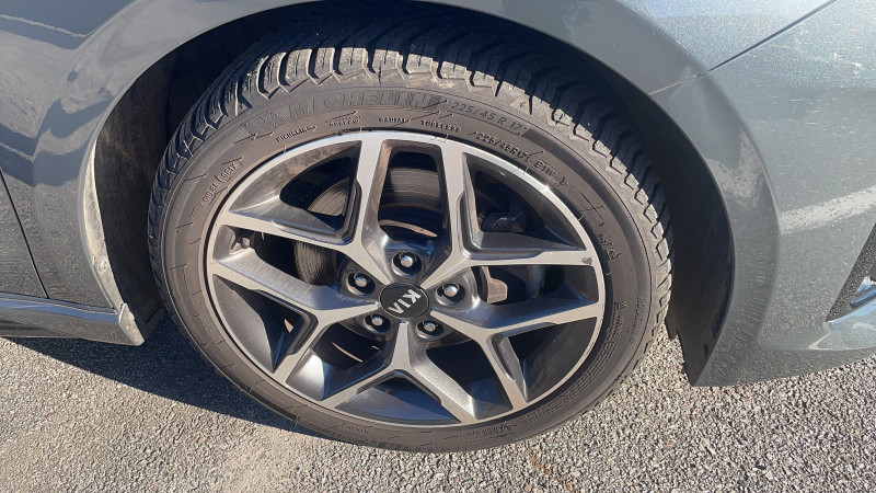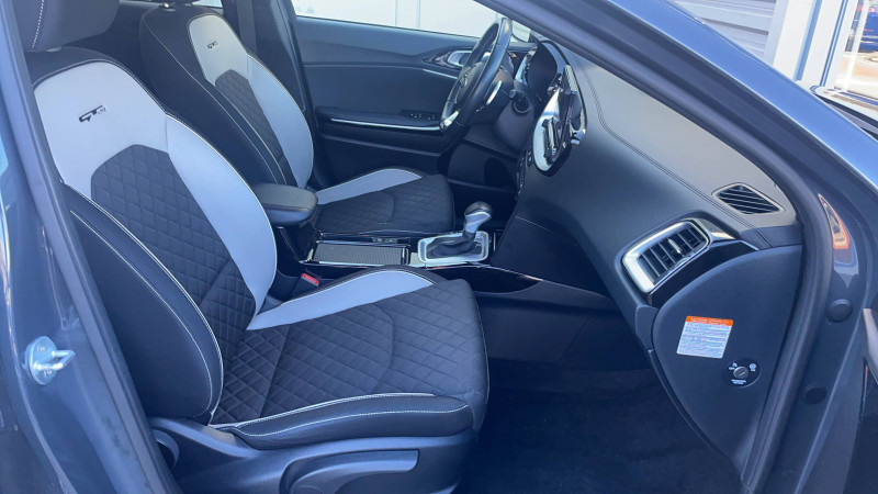 ABS avec répartiteur électronique de freinage (EBD) / Accoudoir central AR avec porte-gobelets intégrés / Accoudoir central AV coulissant avec compartiment de rangement / Aide au maintien dans la file (LKA) / Alerte de vigilance du conducteur (DAW) / Allumage automatique des projecteurs en fonction de la luminosité / Bacs de rangement dans les contre-portes AV et AR / Becquet AR avec troisième feu stop LED intégré / Boucliers AV/AR / Calandre avec application noir laqué et contour finition aluminium / Caméra de recul avec lignes de guidage dynamiques / Combiné d'instrumentation 100 % digital 12.3'' / Compartiment range-lunettes / Connectique USB AV avec charge accélérée / Console centrale avec accoudoir / Contour de calandre aspect chrome satiné et application noir laqué sur grille de calandre / Coques de rétroviseurs couleur noir laqué / Direction à assistance électrique asservie à la vitesse / Eclairage dans le coffre / Ecran tactile couleur 10,25", système de navigation, fonction ECO-DAS, cartographie Europe, mise àà jour de la cartographie et services connectés Kia Live offerts pendant 7 ans, compatibilité Android Auto et Apple CarPlay / Extracteurs d'air pour les places AR / Inserts noir laqué au niveau de la console centrale et des ouïes d'aération du tableau de bord / Jupes latérales spécifiques GT Line / Kit de dépannage en cas de crevaison / Lève-vitres AV et AR électriques, séquentiels et anti-pincement / Ligne de vitre chromée / Moulures de bas de portes avec insert gris / Ouverture et démarrage sans clé "Smart Key" / Pare-soleil avec miroir de courtoisie illuminé (conducteur et passager) / Pédalier et repose-pieds aspect aluminium / Plancher de coffre à double niveau / Poches aumonières au dos des sièges AV / Poignées de portes intérieures finition chrome satiné / Prise 12 V dans le coffre / Prise 12 V sur la partie inférieure de la planche de bord / Prise USB à charge accélérée sur la partie inférieure de la planche de bord / Projecteurs antibrouillard AV avec éclairage d'intersection / Projecteurs AV à technologie dite de "projection" / Rétroviseur intérieur électrochromatique (ECM) / Sélecteur de conduite DRIVE MODE (Normal ou Sport) / Sellerie cuir artificiel-tissu bi-ton noir/gris / Sièges AV à réglage lombaire électrique / Spots de lecture AV et AR / Système audio Radio/MP3 6 HP avec commandes au volant / Système de fixation ISOFIX sur sièges AR / Système de freinage d'urgence autonome avec détection des voitures et des piétons (FCA) / Système de gestion intelligente des feux de route (HBA) / Système de micro-hybridation avec batterie 48V (MHEV) / Système de téléphonie mains-libres Bluetooth avec reconnaissance vocale et fonction streaming audio (selon compatibilité du téléphone) / Système Stop & Go de coupure du moteur à l'arrêt (ISG) / Système UVO Connect - services télématiques offerts pendant 7 ans / Témoin de niveau bas du liquide de lave-glace / Verrouillage automatique des portières en roulant / Volant et pommeau de levier de vitesses gainés cuir