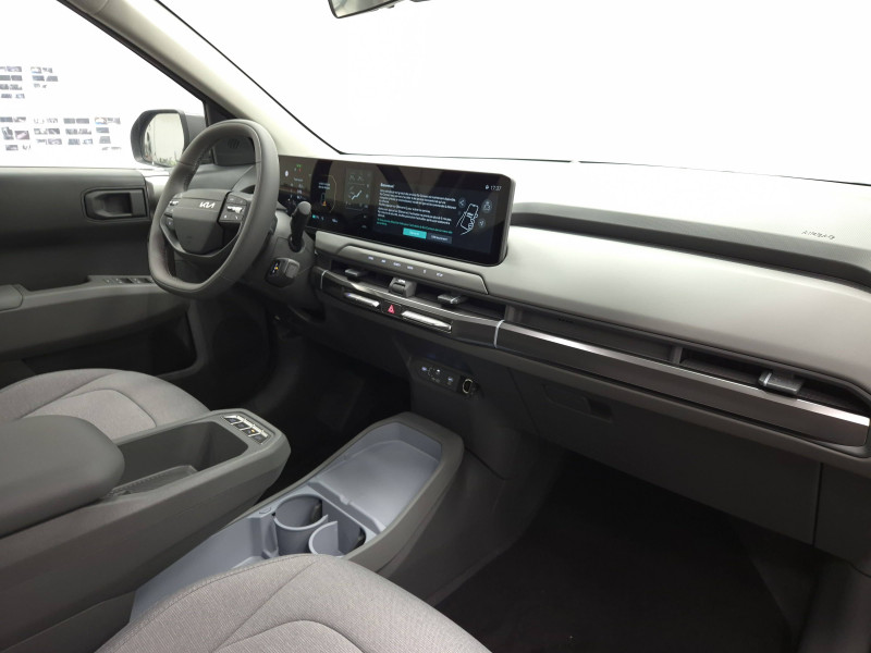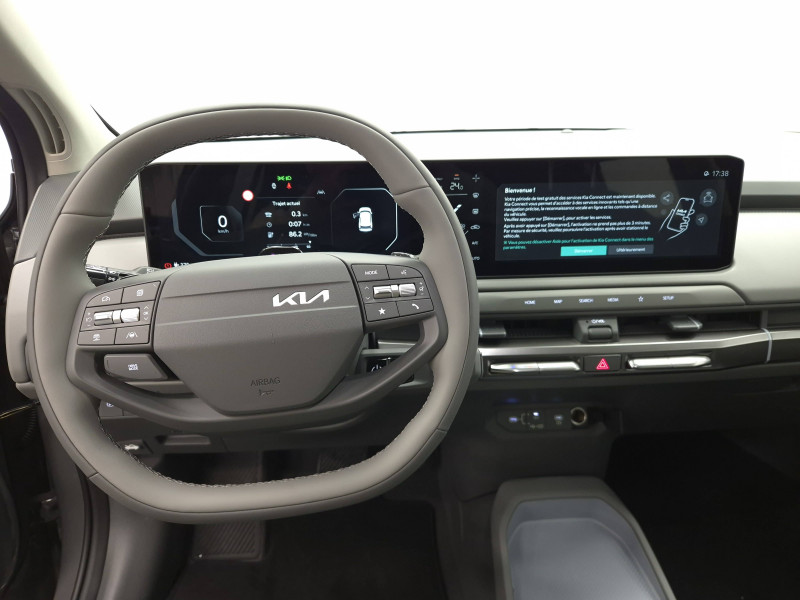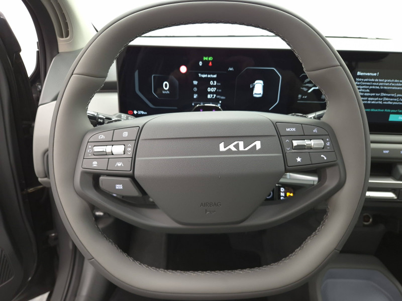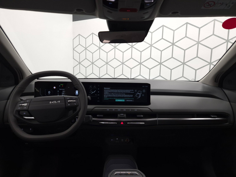 Abonnements Kia Charge Plus et IONITY Power offerts pendant 12 mois / ABS avec répartiteur électronique de freinage (EBD) / Aide au maintien dans la file (LKA) / Alarme antivol / Allumage automatique des projecteurs en fonction de la luminosité / Appuis-tête AV et AR réglables en hauteur et en inclinaison (à l'AV uniquement) / Assistance active à la conduite dans les embouteillages (LFA2) / Assistance active à la conduite sur autoroute (HDA) / Câble de recharge type 2 (T2-T2) 32 A / Caméra de détection de vigilance du conducteur (ICC) / Caméra de recul avec lignes de guidage dynamiques / Carte Kia Charge (accès gratuit au service de recharge et à l'application) / Chargeur embarqué triphasé de 11 kW / Ciel de toit en tissu / Connectique USB-C au dos des sièges conducteur et passager AV / Connectique USB-C sur la partie inférieure du tableau de bord / Console centrale et inserts habitacle Bleu Givré / Contrôle de pression des pneumatiques (TPMS) avec affichage de la pression par pneumatique / Eclairage intérieur à LED / Elargisseurs d'aile en matière recyclée brute / Fonctionnalité de mise à jour à distance "Over-the-Air" avec 2 mises à jour gratuites incluses / Frein de parking électrique (EPB) avec fonction Autohold / Géolocalisation des bornes de recharge via la navigation embarquée et les services connectés Kia Connect Live / Lève-vitres AV et AR électriques, séquentielles et anti-pincement à l'AV / Moulures de bas de porte en couleur carrosserie et argentées / Ouverture et démarrage sans clé "Smart Key" / Palettes de modulation de la puissance de freinage régénératif / Pare-brise avec film acoustique / Plancher de coffre à double niveau / Planificateur intelligent d'itinéraire / Poches aumonières au dos des sièges AV / Poignées de portes affleurantes manuelles / Porte-gobelets AV / Porte-gobelets sur l'accoudoir central pour le second rang / Ports USB-C sur la console centrale et sur les sièges AV / Prise 12 V sur la console centrale / Prise Combo 2 (CCS) / Programmation de la recharge et de la température de l'habitacle / Radars de parking AV/AR / Rails de toit / Reconnaissance des panneaux de limitation avec régulation de vitesse (ISLA) / Régulateur de vitesse adaptatif avec fonction Stop & Go (SCC2) couplé au système de navigation (NSCC-C) et fonction arrêt d'urgence / Rétroviseurs extérieurs peints en couleur carrosserie / Sellerie tissu et laine mélangée / Services télématiques Kia Connect / Solution de recharge pour prise domestique "Mobility Dock" / Système de fixation ISOFIX sur sièges AR latéraux / Système de freinage à récupération d'énergie avec fonction "i-Pedal" / Système de freinage d'urgence autonome avec détection des piétons et des cyclistes (FCA) et fonction d´intersection / Système de freinage multi collision (MCB) / Système de navigation avec cartographie Europe et services connectés Kia Connect Live offerts pendant 7 ans / Système de préchauffage de l'habitacle / Système de pré-conditionnement de la batterie / Système de téléphonie mains-libres Bluetooth avec reconnaissance vocale et fonction streaming audio / Témoin de non-bouclage des ceintures AV et AR / Triple écran panoramique, intégrant un ordinateur de bord Supervision de 12,3", un écran d'affichage des réglages de confort de 5,3"et un écran tactile d'info-divertissement de 12,3" compatible Android Auto et Apple CarPlay sans fil / Verrouillage automatique des portes asservi à la vitesse / Verrouillage de sécurité enfant manuel / Volant à réglage téléscopique manuel / Volant multifonctions à 2 branches habillé de matière synthétique