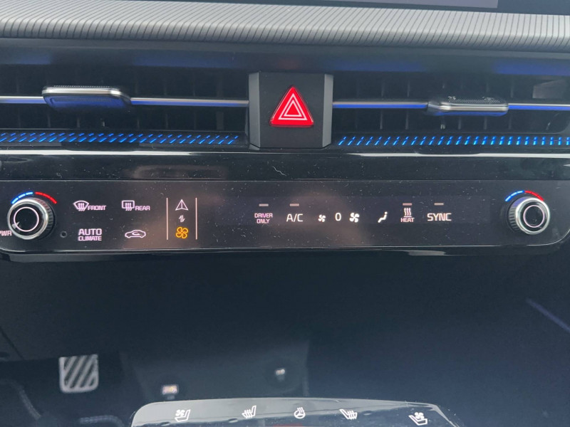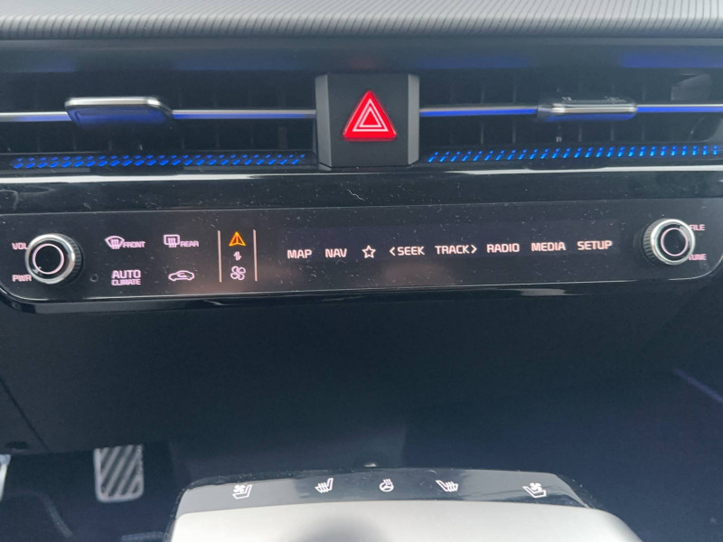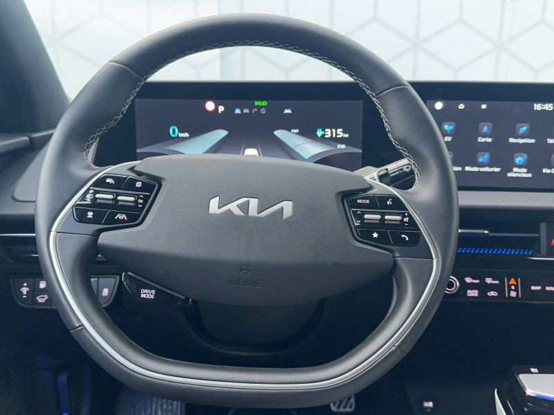 ABS avec répartiteur électronique de freinage (EBD) / Accoudoir central AR avec porte-gobelets intégrés / Affichage tête haute en réalité augmentée (AR HUD) / Aide au maintien dans la file (LKA) / Airbags frontaux, latéraux AV, rideaux et latéral central entre conducteur et passager AV / Alerte de vigilance du conducteur (DAW) / Allumage automatique des projecteurs en fonction de la luminosité / Assistance active à la conduite dans les embouteillages (LFA) / Assistance active à la conduite sur autoroute (HDA) / Boucliers AV/AR GT-line / Buse de ventilation pour la 2ème rangée / Câble de recharge pour prise domestique / Câble de recharge type 2 (T2-T2) 32 A / Caméra de recul avec lignes de guidage dynamiques / Clignotants AV et AR dynamiques / Combiné d'instrumentation 100 % digital 12.3'' / Connectique USB à l'AV de la console centrale / Connectique USB au dos des sièges conducteur et passager AV / E-Call: appel d'urgence automatique aux services de secours en cas d'accident avec géolocalisation du véhicule / Eclairage d'ambiance paramétrable / Eclairage intérieur à LED / Ecran tactile couleur 12,3'' avec compatibilité Android Auto et Apple CarPlay / Frein de parking électrique (EPB) avec fonction Autohold / Géolocalisation des bornes de recharge via la navigation embarquée et les services connectés Kia Connect Live / Ionity: Accès privilégié au réseau de recharge haute puissance Ionity pendant un an (IonityPower) / Kia Charge: service dédié de recharge en itinérance (application et carte de recharge) / Lève-vitres électriques, séquentielles et anti-pincement / Mémoire de position pour le siège conducteur (2 positions mémorisables) / Ouverture du coffre mains-libres (hauteur ajustable) / Ouverture et démarrage sans clé "Smart Key" / Palettes de commande pour la régénération d'énergie au volant / Pare-soleil avec miroir de courtoisie illuminé (conducteur et passager) / Pédalier finition aluminium / Plancher de coffre amovible / Poches aumonières au dos des sièges AV / Poignées de portes affleurantes automatiques / Porte-gobelets AV / Prise 12 V dans le coffre / Prise 12 V sur la console centrale / Prise Combo 2 (CCS) / Programmation de la recharge et de la température de l'habitacle / Projecteurs AV full LED matriciels avec gestion intelligente des feux de route / Reconnaissance des panneaux de limitation avec régulation de vitesse (ISLA) / Régulateur de vitesse adaptatif (SCC) avec fonction Stop&Go couplé au système de navigation (NSCC-C) / Rétroviseur intérieur électrochrome / Rétroviseurs extérieurs avec répétiteurs de clignotant LED Noir Brillant / Sellerie mixte suède/cuir artificiel noir avec contour des sièges blanc / Services télématiques Kia Connect offerts pendant 7 ans / Seuils de porte finition aluminium / Siège conducteur à réglages lombaires électriques / Système audio Premium Meridian / Système audio radio MP3 avec 6HP et commandes au volant / Système de fixation ISOFIX sur sièges AR latéraux / Système de freinage d'urgence autonome avec détection des piétons et des cyclistes (FCA) et fonction de croisement / Système de freinage multi collision (MCB) / Système de navigation avec cartographie Europe et services connectés Kia Connect Live offerts pendant 7 ans / Système de pré-conditionnement de la batterie assurant une température de batterie optimale pour la recharge rapide / Système de téléphonie mains-libres Bluetooth avec reconnaissance vocale et streaming audio / Trappe à ski dans la banquette AR / Verrouillage automatique des portes asservi à la vitesse / Volant chauffant