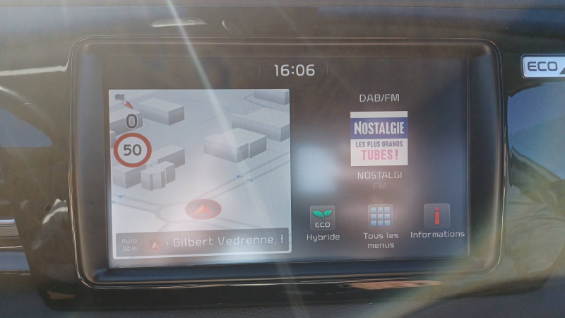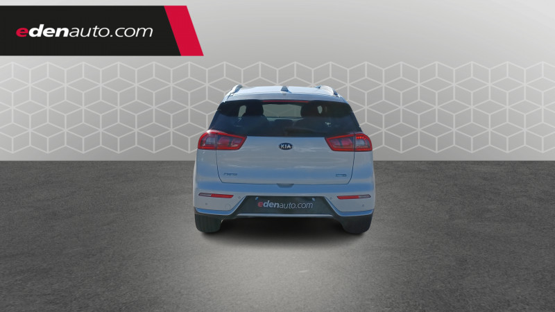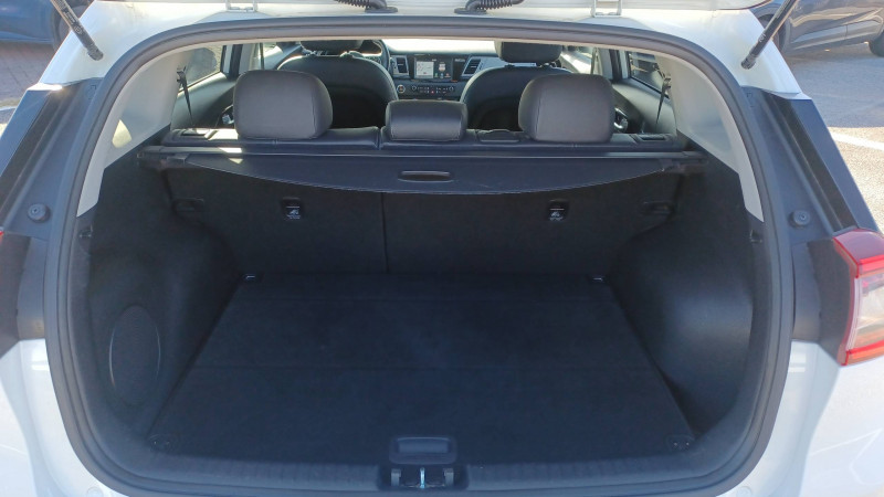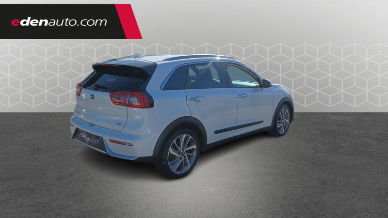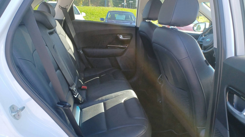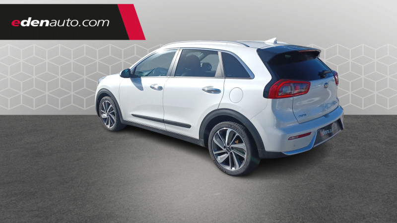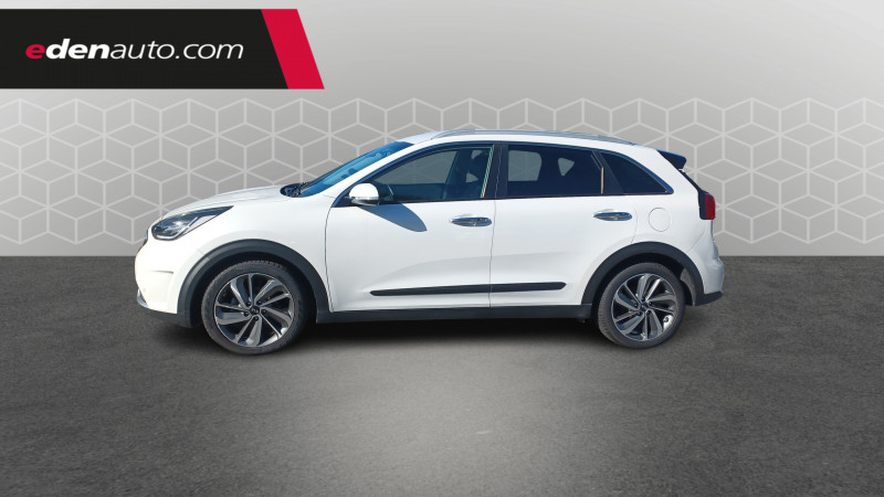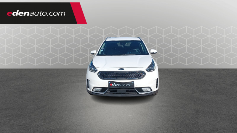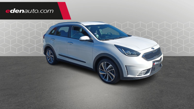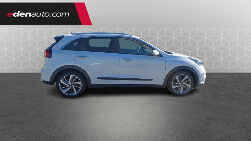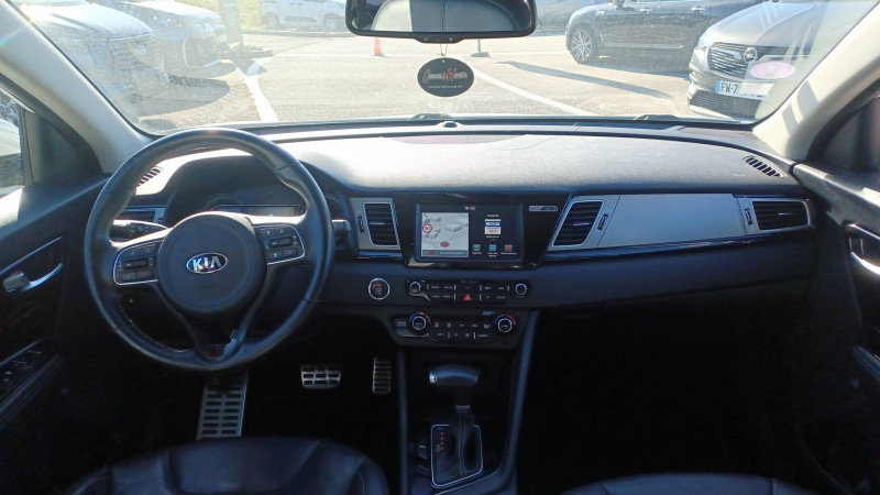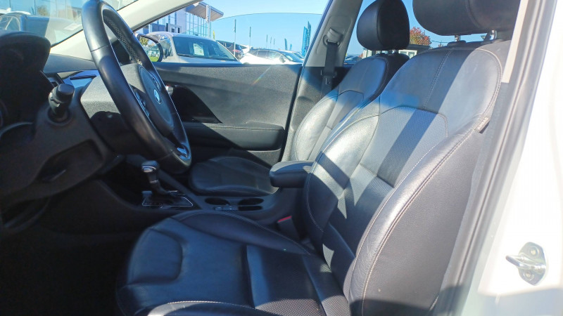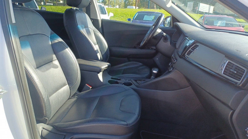 ABS avec répartiteur électronique de freinage (EBD) / Accoudoir central AR avec porte-gobelets intégrés / Alerte de vigilance du conducteur (DAA) / Allumage automatique des projecteurs en fonction de la luminosité / Assistance active au maintien de voie (LKAS) / Becquet AR noir laqué intégré au hayon / Boucliers AV et AR couleur carrosserie / Caméra de recul avec lignes de guidage dynamiques / Compartiments de rangement sous le plancher de coffre / Compteur de tableau de bord central LCD TFT SuperVision 4.2" / Connectique audio AUX et USB / Connectique de chargement USB à l'intérieur de l'accoudoir central AV / Crochets de fixation dans le coffre / Détecteur de trafic AR / Diffuseur d'air aux places AR / Direction à assistance électrique asservie à la vitesse / Inserts noir laqué sur la console centrale, les contre-portes et le volant / Kit de dépannage en cas de crevaison / Lève-vitre conducteur AV électrique à fonction séquentielle et anti-pincement / Ouverture de la trappe à essence de l'intérieur du véhicule / Pack Sécurité Avancée / Pare-soleil avec miroir de courtoisie illuminé (conducteur et passager) / Pédalier et repose-pieds finition aluminium / Poches aumonières au dos du siège conducteur / Poignées de portes extérieures avec inserts aspect chrome / Poignées de portes extérieures couleur carrosserie / Poignées de portes intérieures finition chrome / Projecteurs AV à technologie dite de "projection" / Purificateur d'air (ioniseur) / Rails de toit finition aluminium satiné / Régulateur de couple et assistance au contre-braquage (VSM) / Rétroviseur intérieur anti-éblouissement (technologie électrochrome) / Rétroviseurs extérieurs avec embase noir laqué / Rétroviseurs extérieurs avec répétiteurs de clignotant LED / Rétroviseurs extérieurs couleur carrosserie / Sellerie cuir tendu et perforé noir / Seuils de portes finition aluminium badgés "Niro" / Surlignage des passages de roues en composite noir / Système audio Premium JBL avec 8HP dont 2 Tweeters, 1 caisson de basse et 1 amplificateur externe / Système de fixation ISOFIX sur sièges AR / Système de navigation avec écran couleur tactile 8", fonction ECO, cartographie Europe, mise à jour de la cartographie pendant 7 ans, services TomTom Live pendant 7 ans, compatibilité Androïd Auto / Témoin de niveau bas du liquide de lave-glace / Témoin de non-bouclage des ceintures AV et AR / Verrouillage automatique des portes asservi à la vitesse / Volant chauffant / Volant et pommeau de levier de vitesses gainés cuir