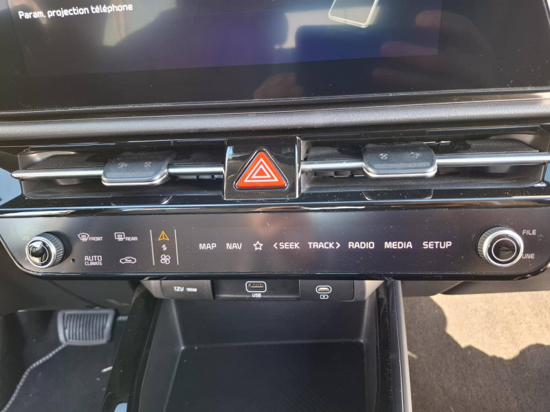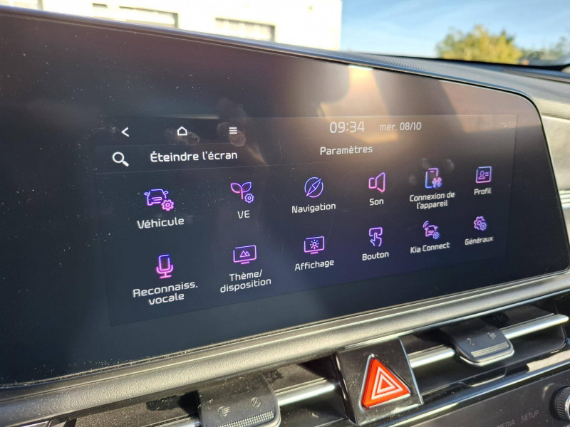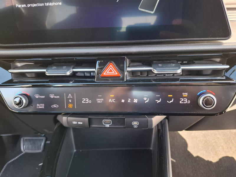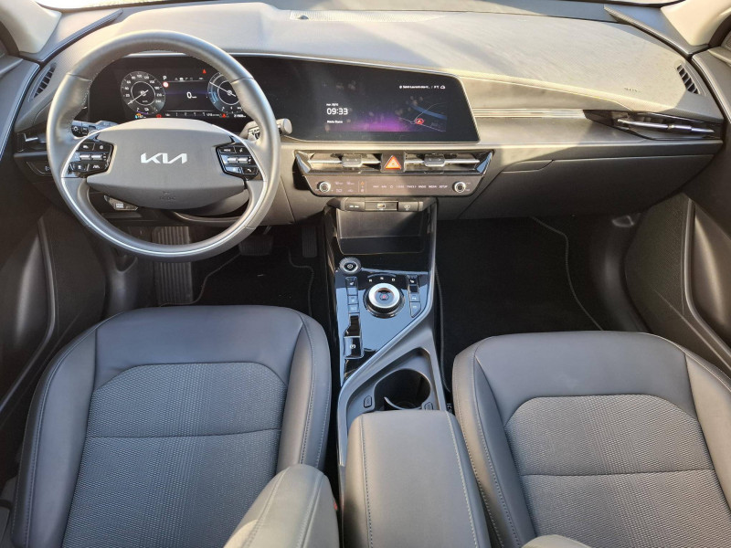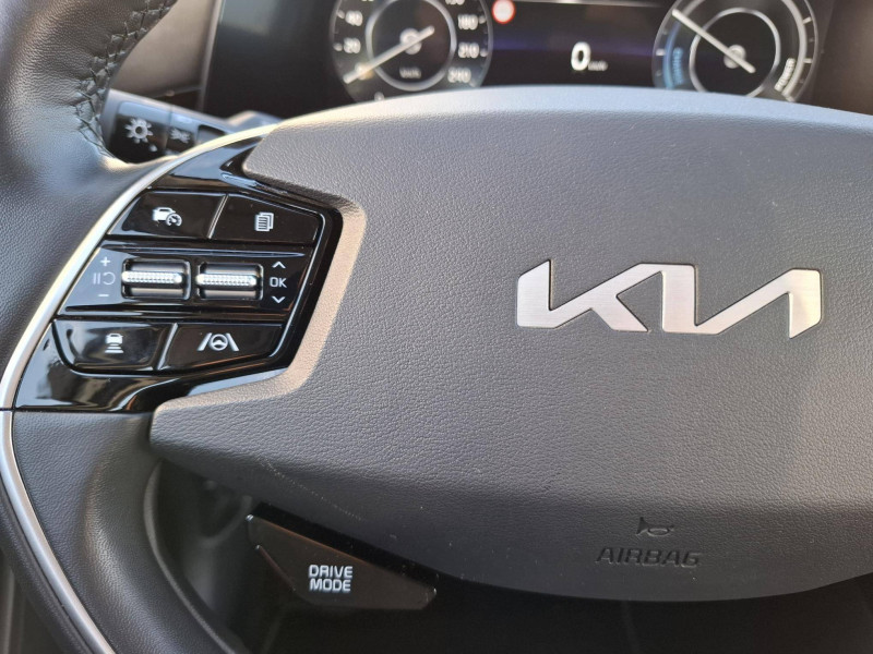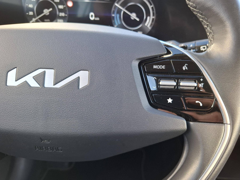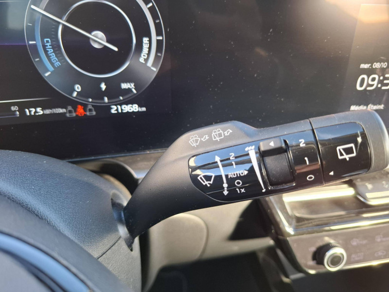 Accès et démarrage mains libres (Smart Key) / Accoudoir central AR avec porte-gobelets intégrés / Accoudoir central AV avec compartiment de rangement / Aérateurs aux places AR / Aide au maintien dans la file (LKA) / Airbags frontaux, latéraux AV, rideaux AV et AR, central AV et genoux côté conducteur / Alerte de vigilance du conducteur (DAW) / Allumage automatique des projecteurs en fonction de la luminosité / Appuis-tête AV et AR réglables en hauteur et en inclinaison (à l'AV uniquement) / Assistance active à la conduite dans les embouteillages (LFA) / Assistance active à la conduite sur autoroute (HDA) / Béquet AR intégré au hayon avec feux stop à LED / Bouclier de protection finition chrome / Câble de recharge pour prise domestique / Câble de recharge type 2 (T2-T2) 32A / Cache-bagage en toile recyclée pliable / Calandre pleine avec trappe d'accès à la prise de recharge / Caméra de recul avec lignes de guidage dynamiques / Chargeur embarqué triphasé de 11 kW / Climatisation automatique avec fonction "Driver Only" / Combiné d'instrumentation 100 % digital 10.25'' / Compartiments de rangement sous le plancher de coffre / Connectiques USB (x2) à charge accélérée au dos des sièges AV / Connectique USB à charge accélérée sur la partie inférieure de la planche de bord / Connectique USB à l'AV / Coques de rétroviseurs couleur noir laqué / Crochets de fixation dans le coffre / Diffuseur d'air aux places AR / Direction à assistance électrique asservie à la vitesse / Eclairage d'ambiance personnalisable / Eclairage dans le coffre / Ecran tactile couleur 10,25'' avec compatibilité Android Auto et Apple CarPlay, système de navigation avec cartographie Europe et services connectés Kia Connect Live offerts pendant 7 ans / Géolocalisation des bornes de recharge (Navigation / Kia Connect) / Gestion intelligente des feux de route (HBA) / Inserts finition carbone brut sur le tableau de bord / Kia Charge: service dédié de recharge en itinérance (application et carte de recharge) / Kit de dépannage en cas de crevaison / Lève-vitres AV et AR électriques, séquentiels à l'AV / Modulation automatique de la puissance de freinage régénératif (Smart Regenerative Braking System 2.0) / Moulures de bas de portes et arches de roues contrastées noir laqué / Palettes au volant (modulation de la puissance du freinage régénératif) / Palettes de modulation de la puissance de freinage régénératif avec mode i-Pedal / Pare-soleil avec miroir de courtoisie illuminé (conducteur et passager) / Peinture Blanc Céleste / Plancher de coffre modulable / Poches aumonières au dos des sièges AV / Poignées de portes extérieures couleur carrosserie / Poignées de portes intérieures finition chrome satiné / Prise Combo 2 (CCS) / Programmation de la recharge et de la température de l'habitacle / Rails de toit finition noir laqué / Reconnaissance des panneaux de limitation avec régulation de vitesse (ISLA) / Rétroviseur intérieur électrochrome / Rétroviseurs extérieurs avec embase noir laqué / Rétroviseurs extérieurs avec répétiteurs de clignotant LED / Sélecteur de modes de conduite Eco, Confort et Sport / Sélecteur de vitesse rotatif électronique (SBW) / Sellerie mixte tissu/cuir artificiel noir fusain / Services télématiques Kia Connect offerts pendant 7 ans / Solution de recharge pour prise domestique et câble de recharge type 2 (T2-T2) / Spots de lecture AV et d'éclairage intérieur / Système audio RDS, 6 HP (dont 2 tweeters), avec commandes au volant / Système DAB (Digital Audio Broadcasting) : système de radiodiffusion sonore numérique / Système de chauffage de la batterie / Système de freinage d'urgence autonome avec détection des voitures/piétons/cyclistes (FCA 1.5) avec fonction croisement / Système de navigation avec cartographie Europe et services connectés Kia Connect Live offerts pendant 7 ans / Système de pré-conditionnement de la batterie assurant une température de batterie optimale pour la recharge rapide / Système de son virtuel (émet un léger son à basse vitesse afin de prévenir les piétons distraits) / Système de téléphonie mains-libres Bluetooth avec reconnaissance vocale et streaming audio / Système Intelligent de Régénération (Smart Regen System, SRS): Modulation automatique de la puissance de freinage régénératif à la décélération (Coasting Guide Control, CGC) et contrôle d'énergie prédictif (Predictive Energy Control, PEC) / Verrouillage automatique des portes en roulant / Volant chauffant / Volant en cuir artificiel