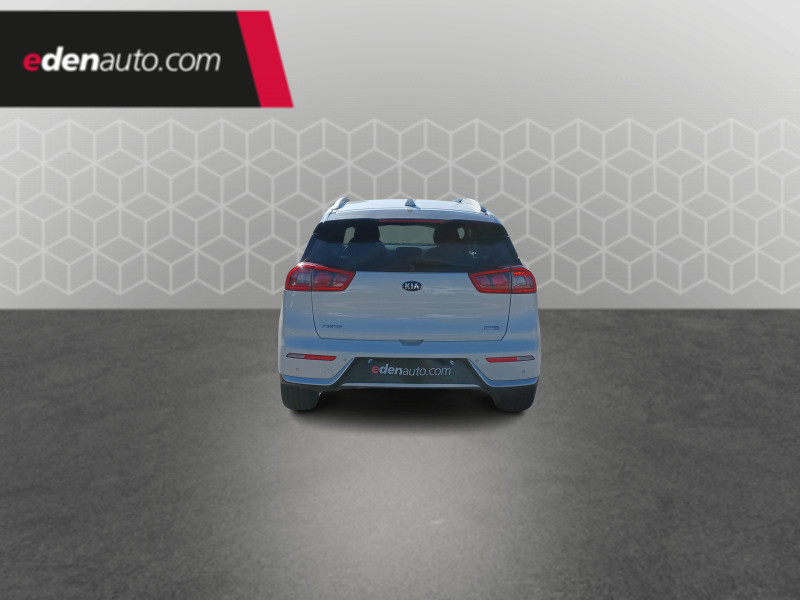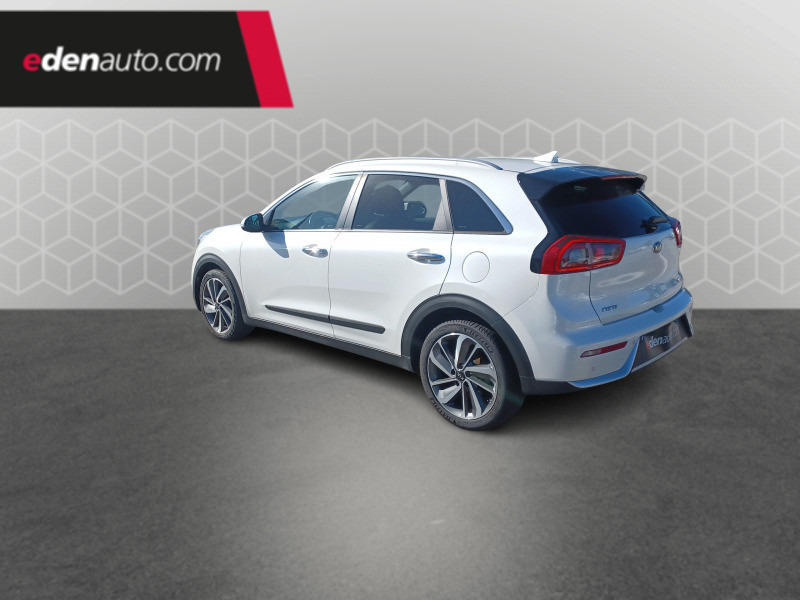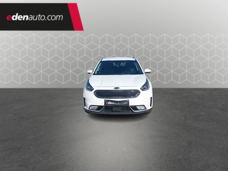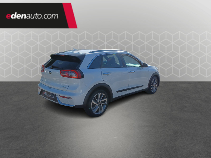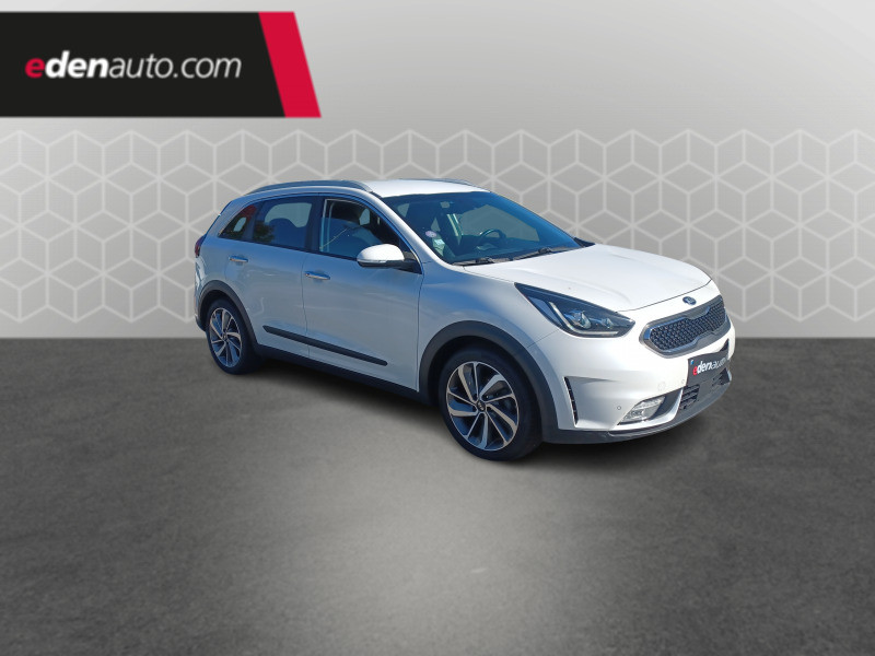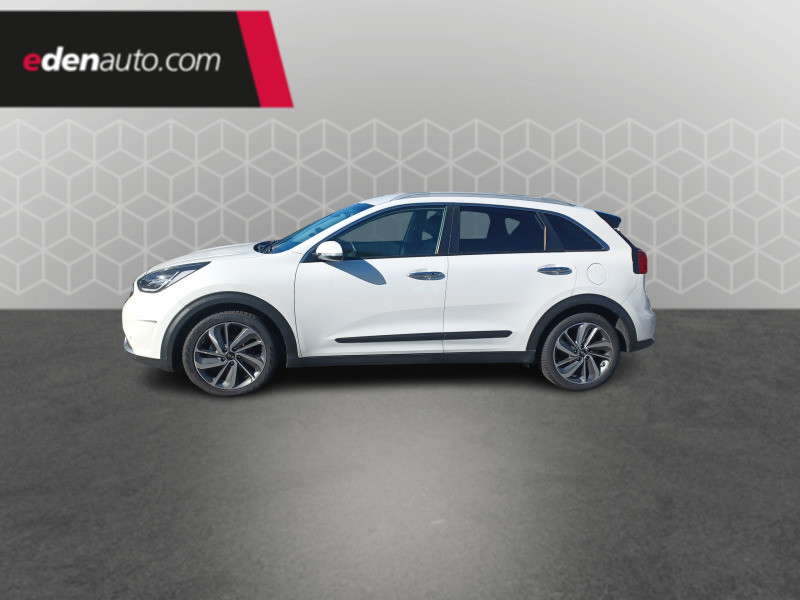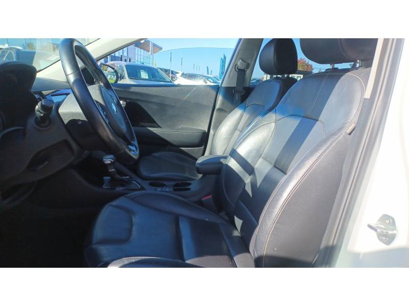 ABS avec répartiteur électronique de freinage (EBD) / Accoudoir central AR avec porte-gobelets intégrés / Alerte de vigilance du conducteur (DAA) / Allumage automatique des projecteurs en fonction de la luminosité / Assistance active au maintien de voie (LKAS) / Becquet AR noir laqué intégré au hayon / Boucliers AV et AR couleur carrosserie / Caméra de recul avec lignes de guidage dynamiques / Compartiments de rangement sous le plancher de coffre / Compteur de tableau de bord central LCD TFT SuperVision 4.2 / Connectique audio AUX et USB / Connectique de chargement USB à l'intérieur de l'accoudoir central AV / Crochets de fixation dans le coffre / Désembuage automatique du pare-brise / Détecteur de trafic AR / Diffuseur d'air aux places AR / Direction à assistance électrique asservie à la vitesse / Inserts noir laqué sur la console centrale / les contre-portes et le volant / Kit de dépannage en cas de crevaison / Lève-vitre conducteur AV électrique à fonction séquentielle et anti-pincement / Lunette et vitres AR latérales surteintées / Ouverture de la trappe à essence de l'intérieur du véhicule / Pack Sécurité Avancée / Pare-soleil avec miroir de courtoisie illuminé (conducteur et passager) / Pédalier et repose-pieds finition aluminium / Poches aumonières au dos du siège conducteur / Poignées de portes extérieures avec inserts aspect chrome / Poignées de portes extérieures couleur carrosserie / Poignées de portes intérieures finition chrome / Projecteurs AV à technologie dite de projection / Purificateur d'air (ioniseur) / Rails de toit finition aluminium satiné / Régulateur de couple et assistance au contre-braquage (VSM) / Rétroviseur intérieur anti-éblouissement (technologie électrochrome) / Rétroviseurs extérieurs avec embase noir laqué / Rétroviseurs extérieurs avec répétiteurs de clignotant LED / Rétroviseurs extérieurs couleur carrosserie / Sellerie cuir tendu et perforé noir / Seuils de portes finition aluminium badgés Niro / Siège passager AV réglable en hauteur / Surlignage des passages de roues en composite noir / Système audio Premium JBL avec 8HP dont 2 Tweeters / 1 caisson de basse et 1 amplificateur externe / Système de fixation ISOFIX sur sièges AR / Système de navigation avec écran couleur tactile 8 / cartographie Europe / mise à jour de la cartographie pendant 7 ans / services TomTom Live pendant 7 ans / compatibilité Androïd Auto / Témoin de niveau bas du liquide de lave-glace / Témoin de non-bouclage des ceintures AV et AR / Verrouillage automatique des portes asservi à la vitesse / Volant chauffant / Volant et pommeau de levier de vitesses gainés cuir