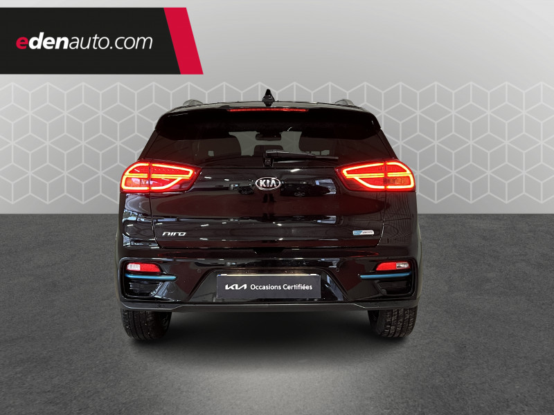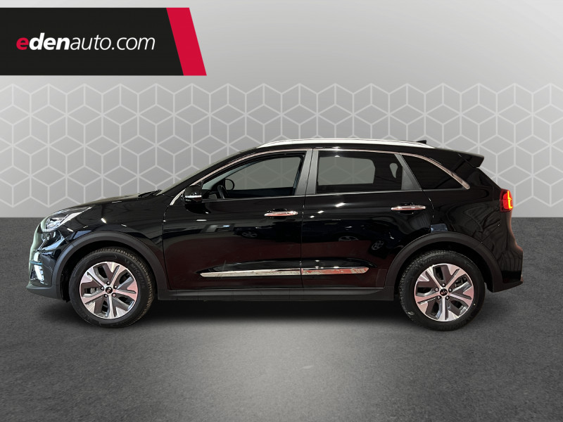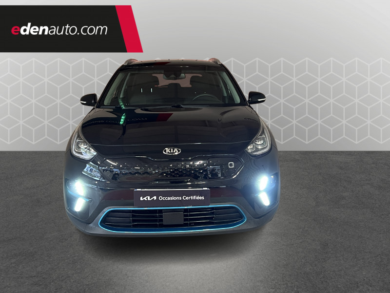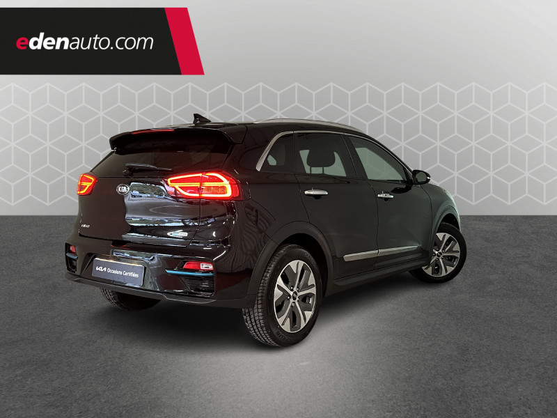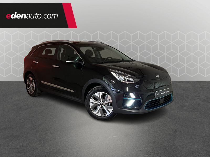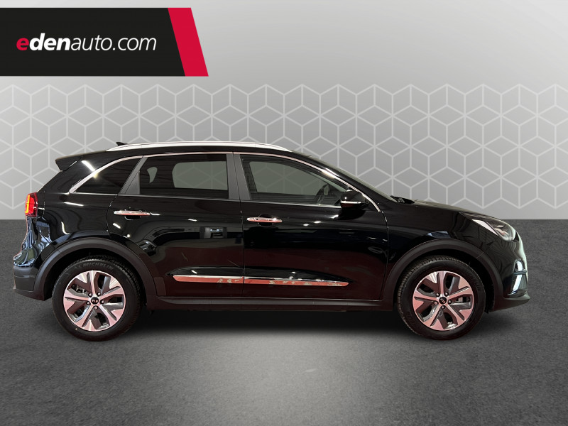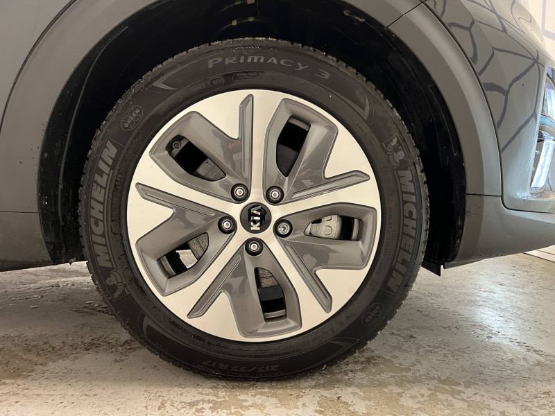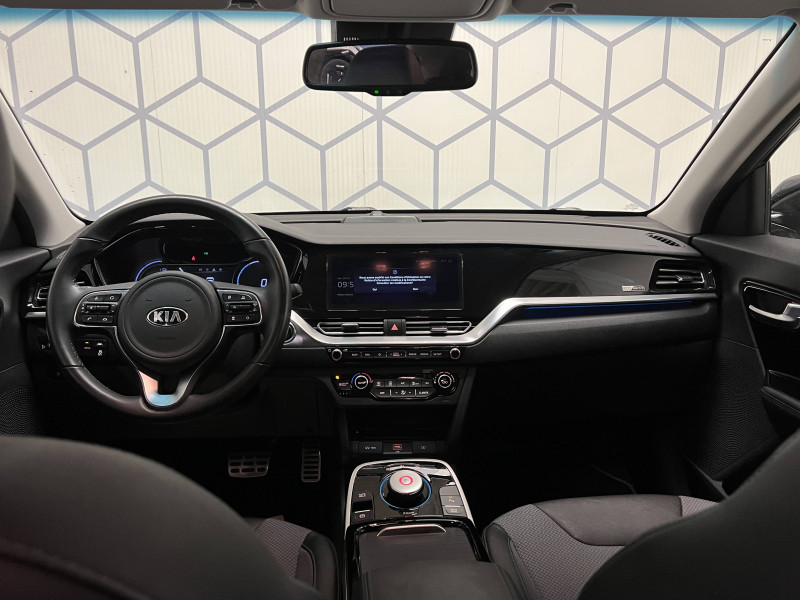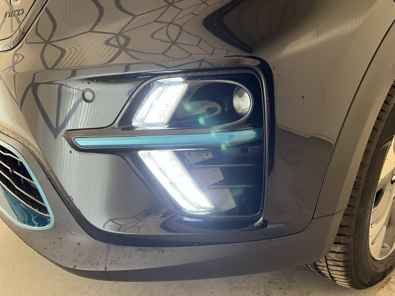 7 airbags dont un airbag genoux conducteur / ABS avec répartiteur électronique de freinage (EBD) / Accoudoir central AR avec porte-gobelets intégrés / Accoudoir central AV avec compartiment de rangement et prise de recharge USB / Aide au maintien dans la file (LKA) / Airbags frontaux, latéraux AV, rideaux AV et AR et genoux côté conducteur / Alerte de vigilance du conducteur (DAW) / Allumage automatique des projecteurs de croisement en fonction de la luminosité / Appuis-tête AV et AR réglables en hauteur et en inclinaison (à l'AV uniquement) / Assistance active à la conduite dans les embouteillages (LFA) / Bac de rangement et porte-bouteille dans les contre-portes AV / Becquet AR noir laqué intégré au hayon avec feux de stop à LED / Boucliers AV et AR couleur carrosserie avec inserts noir laqué et bleu anodisé / Câble de recharge pour prise domestique / Câble de recharge type 2 (T2-T2) 32A / Calandre pleine avec trappe d'accès à la prise de recharge / Caméra de recul avec lignes de guidage dynamiques / Chargeur embarqué monophasé 7,2 kW / Climatisation automatique avec fonction "Driver Only" / Combiné d'instrumentation Supervision 7'' / Compartiment range-lunettes / Compartiments de rangement sous le plancher de coffre / Connectique USB / Console centrale avec coffre de rangement et 2 porte-gobelets repliables / Console centrale avec éclairage d'ambiance (6 couleurs au choix: blanc, gris, bronze, rouge, vert et bleu) / Console centrale avec plateau de rangement inférieur équipé d'un tapis antidérapant en caoutchouc / Contrôle d'énergie prédictif (Predictive Energy Control, PEC) / Crochets de fixation dans le coffre / Diffuseur d'air aux places AR / Direction assistée asservie à la vitesse / Eclairage dans le coffre / Eclairage de la prise de recharge / Ecran tactile couleur 10,25", système de navigation, fonction ECO-DAS, cartographie Europe, mise àà jour de la cartographie et services connectés Kia Live offerts pendant 7 ans, compatibilité Android Auto et Apple CarPlay / Entourage des aérateurs bleu anodisé / Géolocalisation des bornes de recharge via la navigation embarquée et les services connectés Kia Connect Live / Grille de radiateur avec volets de refroidissement actifs / Inserts noir laqué sur console centrale, contre-portes, sérigraphie bleu anodisé sur le volant / Jantes en alliage 17" finition diamantée / Kia Charge: service dédié de recharge en itinérance (application et carte de recharge) / Kit de dépannage en cas de crevaison / Lève-vitre conducteur électrique à fonction séquentielle / Lève-vitre passager AV électrique à fonction séquentielle / Ligne de vitre chromée / Modulation automatique de la puissance de freinage régénératif à la décélération / Ouverture et démarrage sans clé "Smart Key" / Palettes de modulation de la puissance de freinage régénératif au volant / Pare-soleil avec miroir de courtoisie illuminé (conducteur et passager) / Pédalier finition aluminium / Poche aumonière au dos du siège passager AV / Poignées de portes extérieures et protections latérales finition chrome / Poignées de portes intérieures finition chrome satiné / Porte-bouteille dans les contre-portes AR / Prise Combo 2 (CCS) / Programmation de la recharge et de la température de l'habitacle / Radars de parking AV/AR / Radio/MP3/DAB, 6 HP, avec commandes au volant / Rails de toit finition aluminium satiné / Rétroviseur intérieur électrochrome / Rétroviseurs extérieurs avec embase noir laqué / Rétroviseurs extérieurs avec répétiteurs de clignotant LED / Rétroviseurs extérieurs couleur carrosserie / Sélecteur de modes de conduite Eco+, Eco, Confort et Sport avec possibilité de paramétrage / Sellerie tissu / cuir de synthèse noir avec surpiqûres bleu anodisé / Seuils de portes AV et AR finition aluminium badgés "Niro" / Siège conducteur à réglages lombaires électriques / Surlignage des passages de roues en composite noir / Système DAB (Digital Audio Broadcasting) : système de radiodiffusion sonore numérique / Système de freinage d'urgence autonome avec détection des piétons (FCA) / Système de gestion intelligente des feux de route (HBA) / Système de son virtuel déconnectable (émet un léger son à basse vitesse afin de prévenir les piétons distraits) / Système de téléphonie mains-libres Bluetooth avec reconnaissance vocale / Système Intelligent de Régénération (Smart Regen System, SRS): Modulation automatique de la puissance de freinage régénératif à la décélération (Coasting Guide Control, CGC) et contrôle d'énergie prédictif (Predictive Energy Control, PEC) / Système Kia Connect - services télématiques offerts pendant 7 ans / Témoin de niveau bas du liquide de lave-glace / Verrouillage automatique des portières en roulant / Volant et levier de vitesses cuir