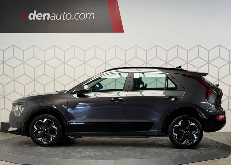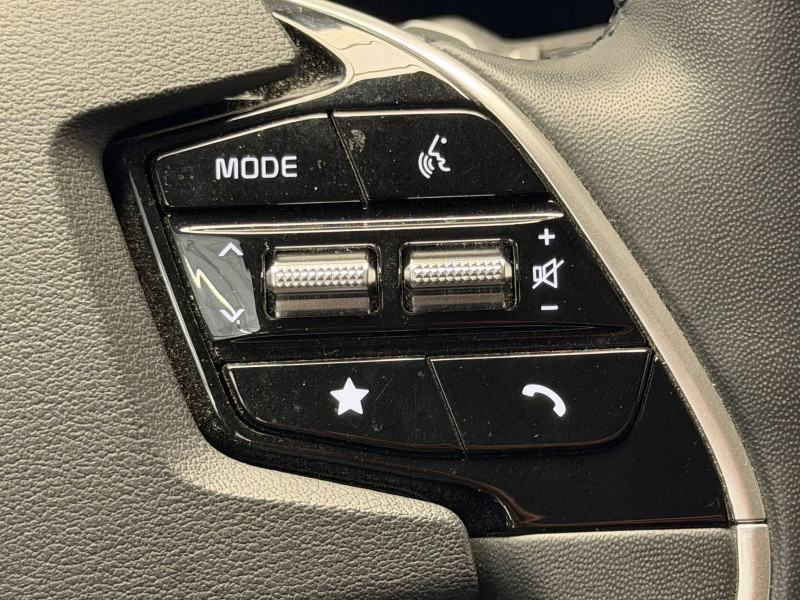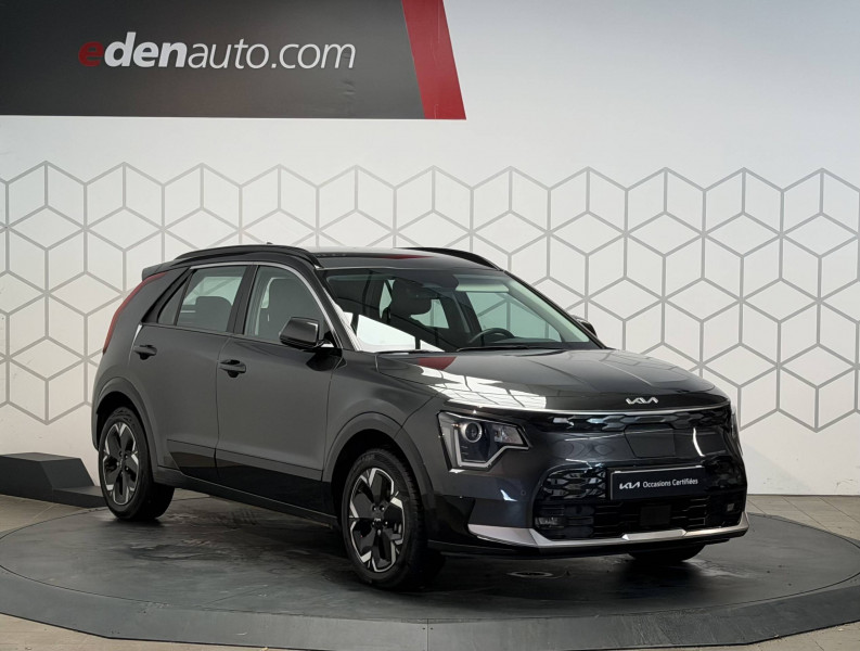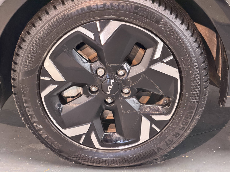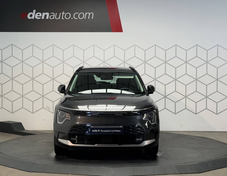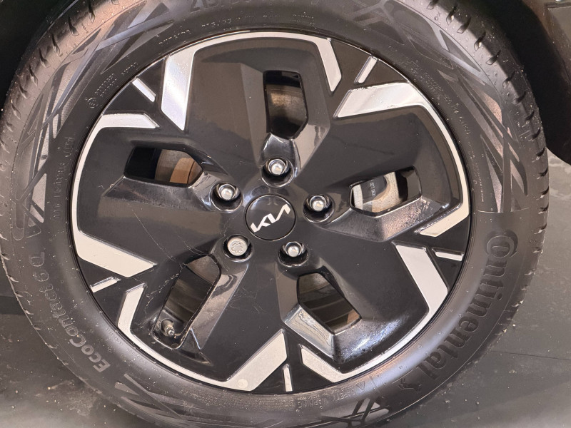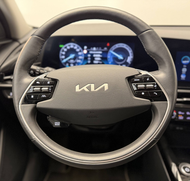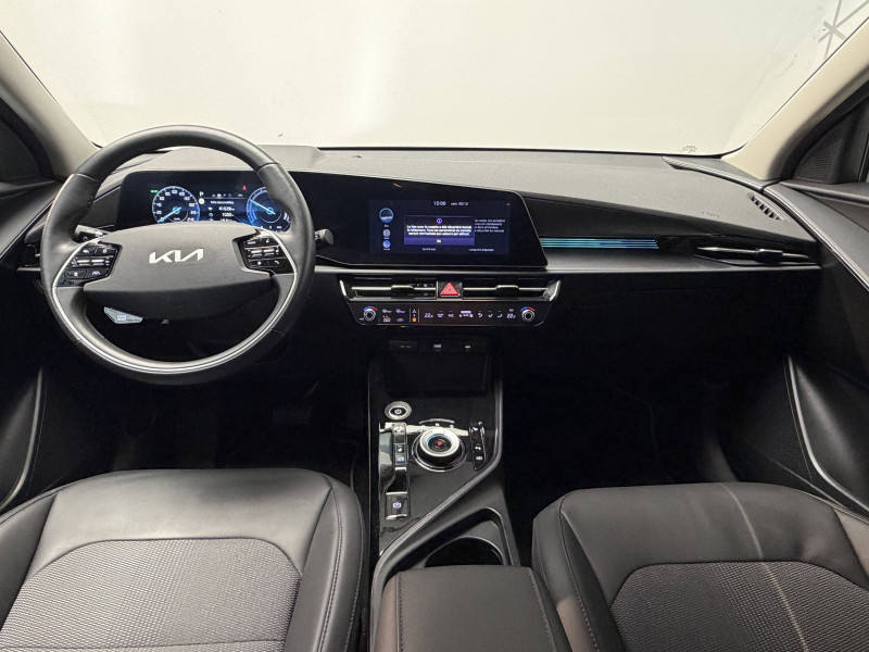 Accès et démarrage mains libres (Smart Key) / Accoudoir central AR avec porte-gobelets intégrés / Accoudoir central AV avec compartiment de rangement / Aide au maintien dans la file (LKA) / Airbags frontaux, latéraux AV, rideaux AV et AR, central AV et genoux côté conducteur / Alerte de vigilance du conducteur (DAW) / Allumage automatique des projecteurs en fonction de la luminosité / Appuis-tête AV et AR réglables en hauteur et en inclinaison (à l'AV uniquement) / Assistance active à la conduite dans les embouteillages (LFA) / Assistance active à la conduite sur autoroute (HDA) / Béquet AR intégré au hayon avec feux stop à LED / Câble de recharge type 2 (T2-T2) 32A / Cache-bagage en toile recyclée pliable / Calandre pleine avec trappe d'accès à la prise de recharge / Caméra de recul avec lignes de guidage dynamiques / Chargeur embarqué triphasé de 11 kW / Combiné d'instrumentation 100 % digital 10.25'' / Compartiments de rangement sous le plancher de coffre / Connectiques USB (x2) à charge accélérée au dos des sièges AV / Connectique USB à charge accélérée sur la partie inférieure de la planche de bord / Connectique USB à l'AV / Coques de rétroviseurs couleur carrosserie / Crochets de fixation dans le coffre / Diffuseur d'air aux places AR / Direction à assistance électrique asservie à la vitesse / Eclairage d'ambiance personnalisable / Eclairage dans le coffre / Ecran tactile couleur 10,25'' avec compatibilité Android Auto et Apple CarPlay, système de navigation avec cartographie Europe et services connectés Kia Connect Live offerts pendant 7 ans / Géolocalisation des bornes de recharge (Navigation / Kia Connect) / Gestion intelligente des feux de route (HBA) / Inserts finition carbone brut sur le tableau de bord / Jantes en alliage 17" aérodynamiques / Kia Charge: service dédié de recharge en itinérance (application et carte de recharge) / Kit de dépannage en cas de crevaison / Lève-vitres AV et AR électriques, séquentiels à l'AV / Moulures de bas de portes et arches de roues contrastées noir laqué / Palettes de modulation de la puissance de freinage régénératif avec mode i-Pedal / Pare-soleil avec miroir de courtoisie illuminé (conducteur et passager) / Poche aumonière au dos du siège conducteur / Poche aumonière au dos du siège passager AV / Poignées de portes extérieures couleur carrosserie / Poignées de portes intérieures finition chrome satiné / Prise Combo 2 (CCS) / Programmation de la recharge et de la température de l'habitacle / Protection de bouclier finition aluminium / Rails de toit finition noir laqué / Reconnaissance des panneaux de limitation avec régulation de vitesse (ISLA) / Rétroviseur intérieur électrochrome / Rétroviseurs extérieurs avec embase noir laqué / Rétroviseurs extérieurs avec répétiteurs de clignotant LED / Sélecteur de modes de conduite Eco, Confort et Sport / Sélecteur de vitesse rotatif électronique (SBW) / Sellerie mixte tissu/cuir artificiel noir fusain / Services télématiques Kia Connect offerts pendant 7 ans / Solution de recharge pour prise domestique et câble de recharge type 2 (T2-T2) / Spots de lecture AV et d'éclairage intérieur / Système audio RDS, 6 HP (dont 2 tweeters), avec commandes au volant / Système DAB (Digital Audio Broadcasting) : système de radiodiffusion sonore numérique / Système de chauffage de la batterie / Système de freinage d'urgence autonome avec détection des voitures/piétons/cyclistes (FCA 1.5) avec fonction croisement / Système de pré-conditionnement de la batterie assurant une température de batterie optimale pour la recharge rapide / Système de son virtuel (émet un léger son à basse vitesse afin de prévenir les piétons distraits) / Système de téléphonie mains-libres Bluetooth avec reconnaissance vocale et streaming audio / Système Intelligent de Régénération (Smart Regen System, SRS): Modulation automatique de la puissance de freinage régénératif à la décélération (Coasting Guide Control, CGC) et contrôle d'énergie prédictif (Predictive Energy Control, PEC) / Verrouillage automatique des portes en roulant / Volant chauffant / Volant en cuir artificiel