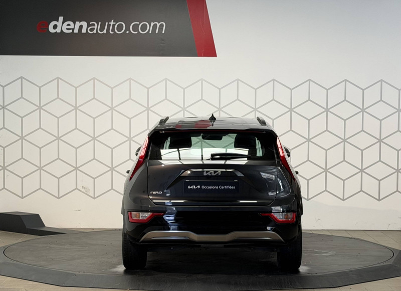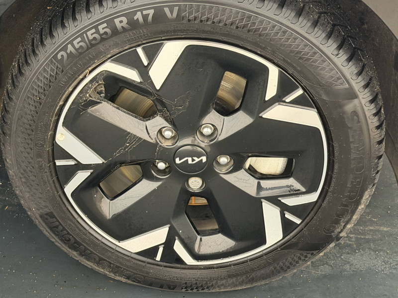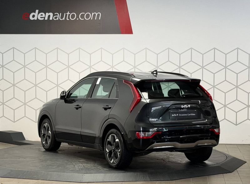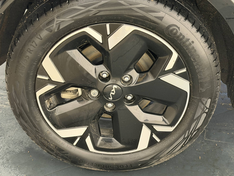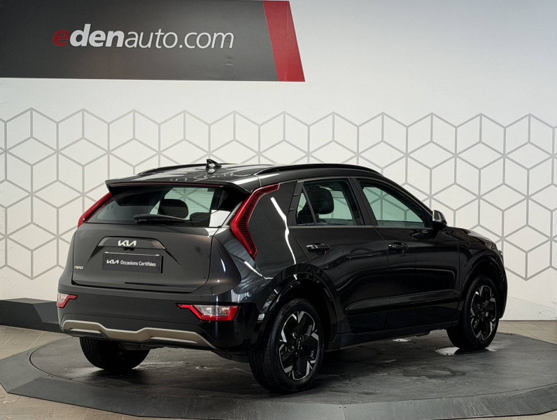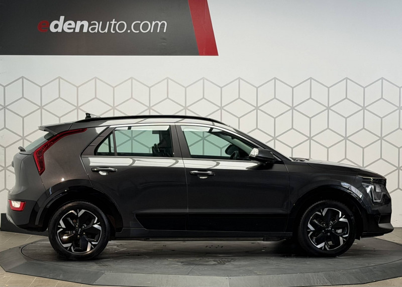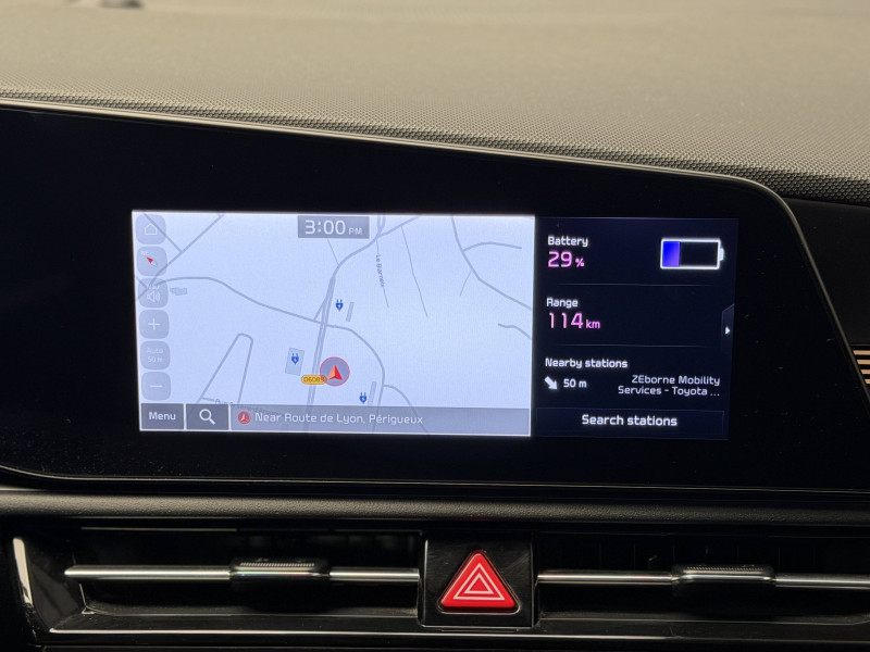 Accès et démarrage mains libres (Smart Key) / Accoudoir central AR avec porte-gobelets intégrés / Accoudoir central AV avec compartiment de rangement / Aide au maintien dans la file (LKA) / Airbags frontaux, latéraux AV, rideaux AV et AR, central AV et genoux côté conducteur / Alerte de vigilance du conducteur (DAW) / Allumage automatique des projecteurs en fonction de la luminosité / Appuis-tête AV et AR réglables en hauteur et en inclinaison (à l'AV uniquement) / Assistance active à la conduite dans les embouteillages (LFA) / Assistance active à la conduite sur autoroute (HDA) / Béquet AR intégré au hayon avec feux stop à LED / Câble de recharge type 2 (T2-T2) 32A / Cache-bagage en toile recyclée pliable / Calandre pleine avec trappe d'accès à la prise de recharge / Caméra de recul avec lignes de guidage dynamiques / Chargeur embarqué triphasé de 11 kW / Combiné d'instrumentation 100 % digital 10.25'' / Compartiments de rangement sous le plancher de coffre / Connectiques USB (x2) à charge accélérée au dos des sièges AV / Connectique USB à charge accélérée sur la partie inférieure de la planche de bord / Connectique USB à l'AV / Coques de rétroviseurs couleur carrosserie / Crochets de fixation dans le coffre / Diffuseur d'air aux places AR / Direction à assistance électrique asservie à la vitesse / Eclairage d'ambiance personnalisable / Eclairage dans le coffre / Ecran tactile couleur 10,25'' avec compatibilité Android Auto et Apple CarPlay, système de navigation avec cartographie Europe et services connectés Kia Connect Live offerts pendant 7 ans / Géolocalisation des bornes de recharge (Navigation / Kia Connect) / Gestion intelligente des feux de route (HBA) / Inserts finition carbone brut sur le tableau de bord / Jantes en alliage 17" aérodynamiques / Kia Charge: service dédié de recharge en itinérance (application et carte de recharge) / Kit de dépannage en cas de crevaison / Lève-vitres AV et AR électriques, séquentiels à l'AV / Moulures de bas de portes et arches de roues contrastées noir laqué / Palettes de modulation de la puissance de freinage régénératif avec mode i-Pedal / Pare-soleil avec miroir de courtoisie illuminé (conducteur et passager) / Poche aumonière au dos du siège conducteur / Poche aumonière au dos du siège passager AV / Poignées de portes extérieures couleur carrosserie / Poignées de portes intérieures finition chrome satiné / Prise Combo 2 (CCS) / Programmation de la recharge et de la température de l'habitacle / Protection de bouclier finition aluminium / Rails de toit finition noir laqué / Reconnaissance des panneaux de limitation avec régulation de vitesse (ISLA) / Rétroviseur intérieur électrochrome / Rétroviseurs extérieurs avec embase noir laqué / Rétroviseurs extérieurs avec répétiteurs de clignotant LED / Sélecteur de modes de conduite Eco, Confort et Sport / Sélecteur de vitesse rotatif électronique (SBW) / Sellerie mixte tissu/cuir artificiel noir fusain / Services télématiques Kia Connect offerts pendant 7 ans / Solution de recharge pour prise domestique et câble de recharge type 2 (T2-T2) / Spots de lecture AV et d'éclairage intérieur / Système audio RDS, 6 HP (dont 2 tweeters), avec commandes au volant / Système DAB (Digital Audio Broadcasting) : système de radiodiffusion sonore numérique / Système de chauffage de la batterie / Système de freinage d'urgence autonome avec détection des voitures/piétons/cyclistes (FCA 1.5) avec fonction croisement / Système de pré-conditionnement de la batterie assurant une température de batterie optimale pour la recharge rapide / Système de son virtuel (émet un léger son à basse vitesse afin de prévenir les piétons distraits) / Système de téléphonie mains-libres Bluetooth avec reconnaissance vocale et streaming audio / Système Intelligent de Régénération (Smart Regen System, SRS): Modulation automatique de la puissance de freinage régénératif à la décélération (Coasting Guide Control, CGC) et contrôle d'énergie prédictif (Predictive Energy Control, PEC) / Verrouillage automatique des portes en roulant / Volant chauffant / Volant en cuir artificiel