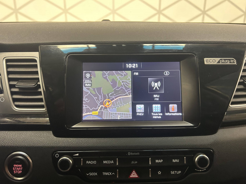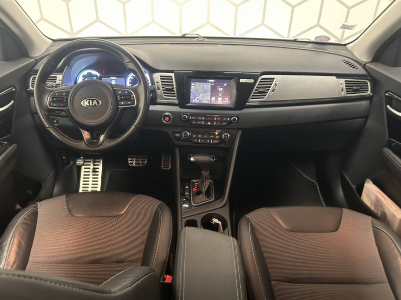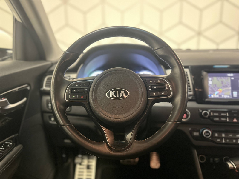 ABS avec répartiteur électronique de freinage (EBD) / Accoudoir central AR avec porte-gobelets intégrés / Accoudoir central AV avec compartiment de rangement et porte-gobelets / Alerte de vigilance du conducteur (DAA) / Allumage automatique des projecteurs en fonction de la luminosité / Assistance active au maintien de voie (LKAS) / Boucliers AV et AR couleur carrosserie / Caméra de recul avec lignes de guidage dynamiques / Compartiments de rangement sous le plancher de coffre / Compteur de tableau de bord central LCD TFT SuperVision 4.2" / Connectique de chargement USB à l'intérieur de l'accoudoir central AV / Crochets de fixation dans le coffre / Diffuseur d'air aux places AR / Direction à assistance électrique asservie à la vitesse / Inserts chrome soulignés de bleu anodisé / Jantes alliage 16" avec enjoliveurs aérodynamique / Kit de dépannage en cas de crevaison / Ouverture de la trappe à essence de l'intérieur du véhicule / Pare-soleil avec miroir de courtoisie illuminé (conducteur et passager) / Pédalier et repose-pieds finition aluminium / Poignées de portes extérieures avec inserts aspect chrome / Poignées de portes intérieures finition chrome / Prise 220V sur la console centrale / Purificateur d'air (ioniseur) / Rails de toit / Régulateur de couple et assistance au contre-braquage (VSM) / Rétroviseur intérieur anti-éblouissement (technologie électrochrome) / Rétroviseurs extérieurs avec embase noir laqué / Rétroviseurs extérieurs avec répétiteurs de clignotant LED / Rétroviseurs extérieurs couleur carrosserie / Seuils de portes finition aluminium badgés "Niro" / Surlignage des passages de roues en composite noir / Système de fixation ISOFIX sur sièges AR / Système de navigation avec écran couleur tactile 7", fonction ECO-DAS, cartographie Europe, mise à jour de la cartographie pendant 7 ans, services TomTom Live pendant 7 ans, compatibilité Androïd Auto et Apple Carplay / Témoin de niveau bas du liquide de lave-glace / Témoin de non-bouclage des ceintures AV et AR / Verrouillage automatique des portes asservi à la vitesse / Volant et pommeau de levier de vitesses gainés cuir