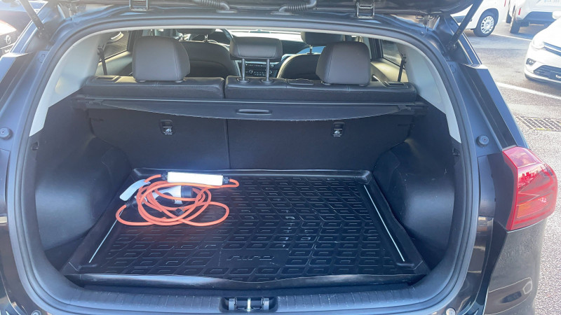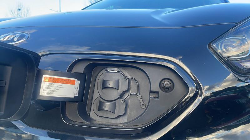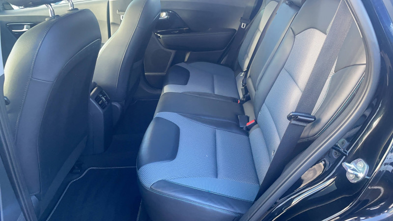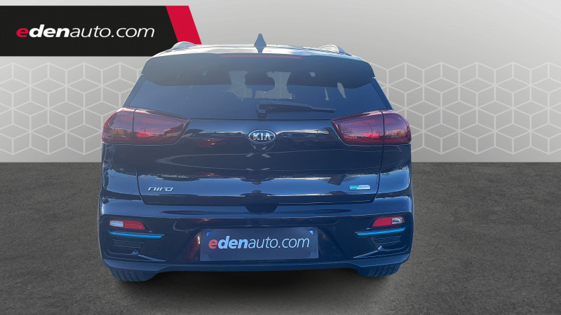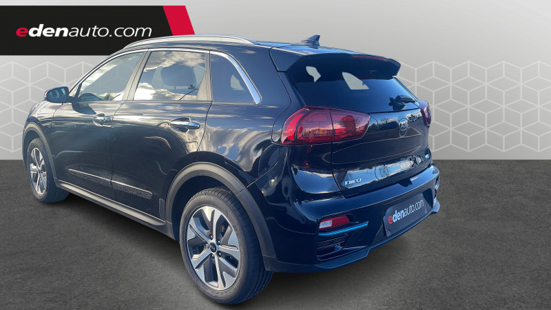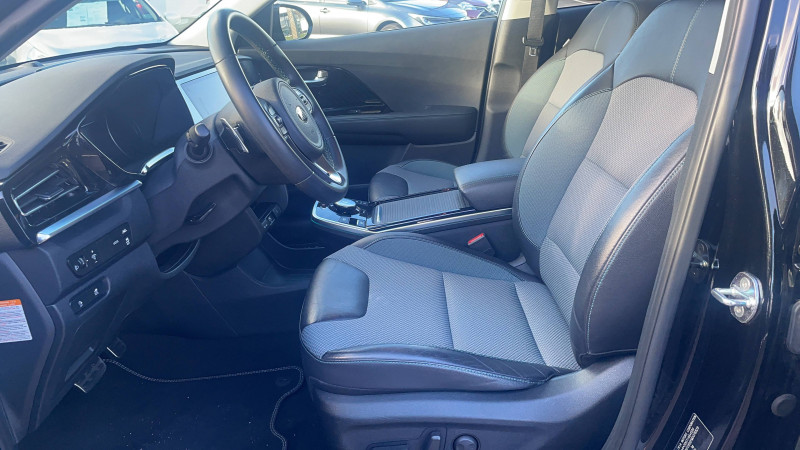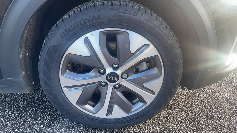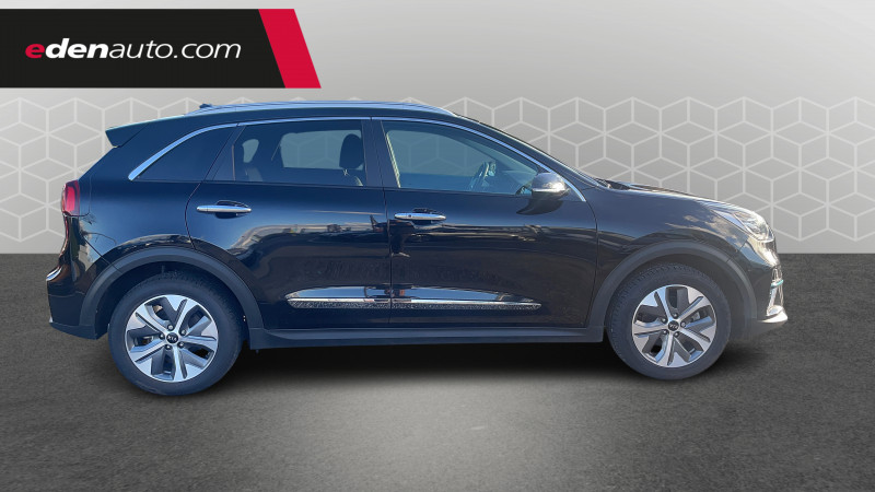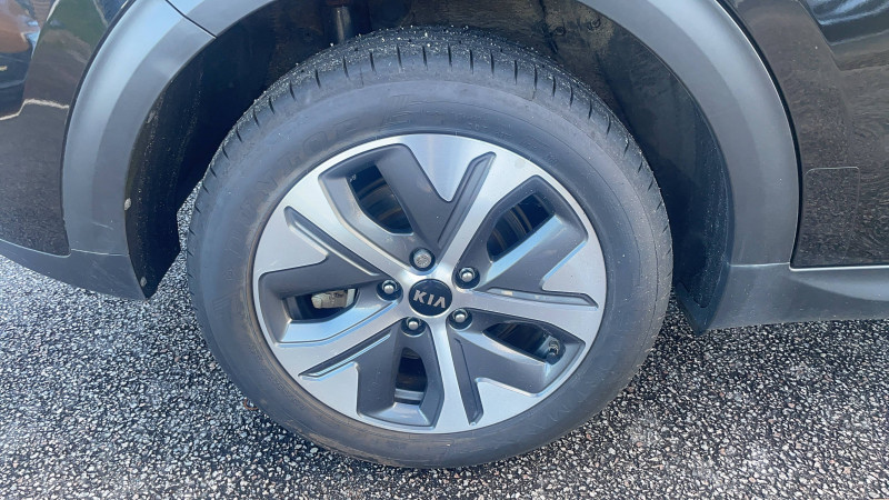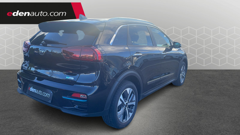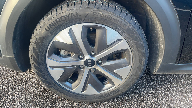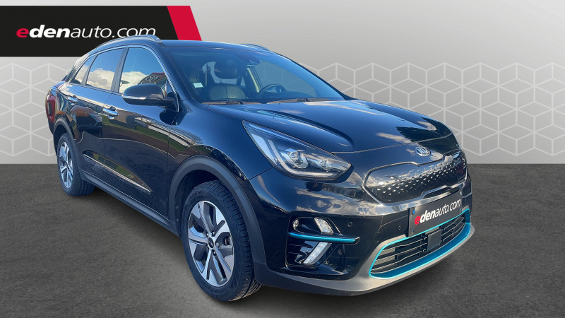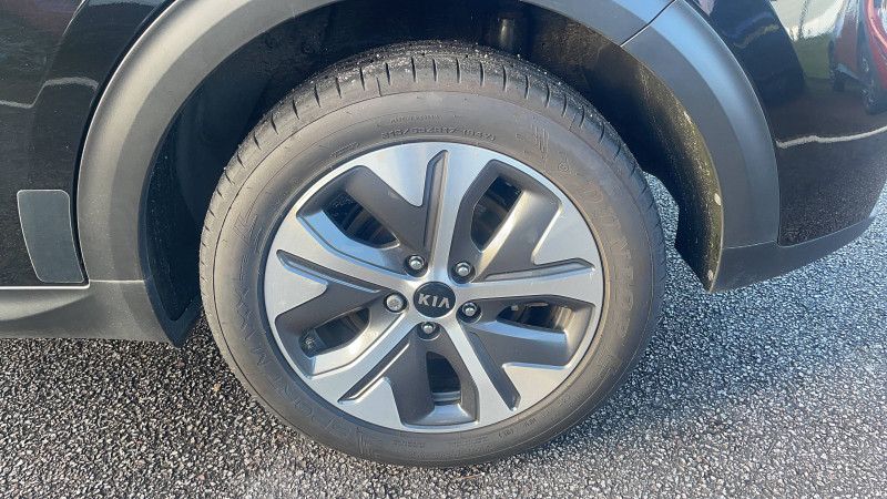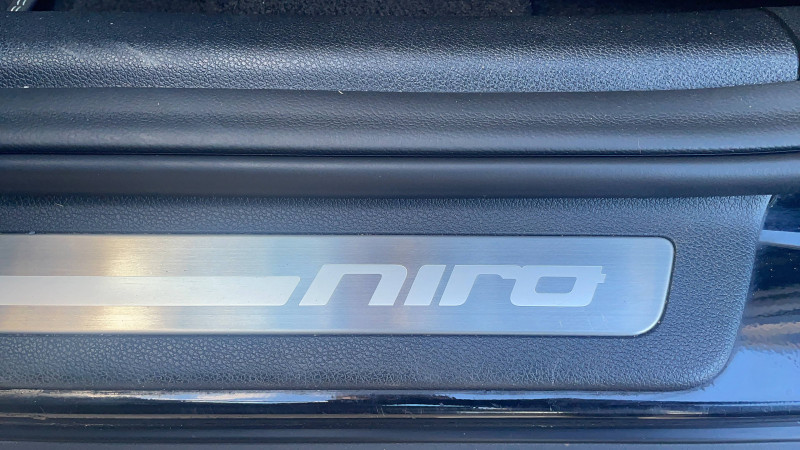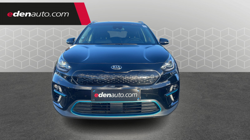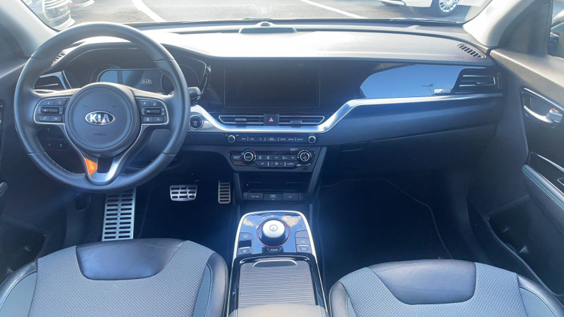 ABS avec répartiteur électronique de freinage (EBD) / Accoudoir central AR avec porte-gobelets intégrés / Accoudoir central AV avec compartiment de rangement et prise de recharge USB / Aide au maintien dans la file (LKA) / Airbags frontaux, latéraux AV, rideaux AV et AR et genoux côté conducteur / Alerte de vigilance du conducteur (DAW) / Allumage automatique des projecteurs de croisement en fonction de la luminosité / Appuis-tête AV et AR réglables en hauteur et en inclinaison (à l'AV uniquement) / Assistance active à la conduite dans les embouteillages (LFA) / Bac de rangement et porte-bouteille dans les contre-portes AV / Becquet AR noir laqué intégré au hayon avec feux de stop à LED / Boucliers AV et AR couleur carrosserie avec inserts noir laqué et bleu anodisé / Câble de recharge pour prise domestique / Câble de recharge type 2 (T2-T2) 32A / Calandre pleine avec trappe d'accès à la prise de recharge / Caméra de recul avec lignes de guidage dynamiques / Chargeur embarqué monophasé 7,2 kW / Climatisation automatique avec fonction "Driver Only" / Compartiment range-lunettes / Compartiments de rangement sous le plancher de coffre / Compteur de tableau de bord central "Supervision" TFT LCD 7'' / Connectique de chargement USB à l'intérieur de l'accoudoir central AV / Connectique USB sur la partie inférieure de la planche de bord / Console centrale avec coffre de rangement et 2 porte-gobelets repliables / Console centrale avec éclairage d'ambiance (6 couleurs au choix: blanc, gris, bronze, rouge, vert et bleu) / Console centrale avec plateau de rangement inférieur équipé d'un tapis antidérapant en caoutchouc / Crochets de fixation dans le coffre / Diffuseur d'air aux places AR / Direction assistée asservie à la vitesse / Eclairage dans le coffre / Eclairage de la prise de recharge / Ecran tactile couleur 10,25", système de navigation, fonction ECO-DAS, cartographie Europe, mise àà jour de la cartographie et services connectés Kia Live offerts pendant 7 ans, compatibilité Android Auto et Apple CarPlay / Entourage des aérateurs bleu anodisé / Géolocalisation des bornes de recharge via la navigation embarquée et les services connectés Kia Connect Live / Grille de radiateur avec volets de refroidissement actifs / Inserts noir laqué sur console centrale, contre-portes, sérigraphie bleu anodisé sur le volant / Jantes en alliage 17" finition diamantée / Kia Charge: service dédié de recharge en itinérance (application et carte de recharge) / Kit de dépannage en cas de crevaison / Lève-vitre conducteur électrique à fonction séquentielle / Lève-vitre passager AV électrique à fonction séquentielle / Ligne de vitre chromée / Ouverture et démarrage sans clé "Smart Key" / Palettes de modulation de la puissance de freinage régénératif au volant / Pare-soleil avec miroir de courtoisie illuminé (conducteur et passager) / Pédalier finition aluminium / Poche aumonière au dos du siège passager AV / Poignées de portes extérieures et protections latérales finition chrome / Poignées de portes intérieures finition chrome satiné / Porte-bouteille dans les contre-portes AR / Prise Combo 2 (CCS) / Programmation de la recharge et de la température de l'habitacle / Radars de parking AV/AR / Rails de toit finition aluminium satiné / Rétroviseur intérieur anti-éblouissement (technologie électrochrome) / Rétroviseurs extérieurs avec embase noir laqué / Rétroviseurs extérieurs avec répétiteurs de clignotant LED / Rétroviseurs extérieurs couleur carrosserie / Sélecteur de modes de conduite Eco+, Eco, Confort et Sport avec possibilité de paramétrage / Sellerie tissu / cuir de synthèse noir avec surpiqûres bleu anodisé / Seuils de portes AV et AR finition aluminium badgés "Niro" / Siège conducteur à réglages lombaires électriques / Surlignage des passages de roues en composite noir / Système audio RDS, 6 HP (dont 2 tweeters), avec commandes au volant / Système DAB (Digital Audio Broadcasting) : système de radiodiffusion sonore numérique / Système de freinage d'urgence autonome avec détection des piétons (FCA) / Système de gestion intelligente des feux de route (HBA) / Système de son virtuel déconnectable (émet un léger son à basse vitesse afin de prévenir les piétons distraits) / Système de téléphonie mains-libres Bluetooth avec reconnaissance vocale / Système Intelligent de Régénération (Smart Regen System, SRS): Modulation automatique de la puissance de freinage régénératif à la décélération (Coasting Guide Control, CGC) et contrôle d'énergie prédictif (Predictive Energy Control, PEC) / Système UVO Connect - services télématiques offerts pendant 7 ans / Témoin de niveau bas du liquide de lave-glace / Verrouillage automatique des portières en roulant
